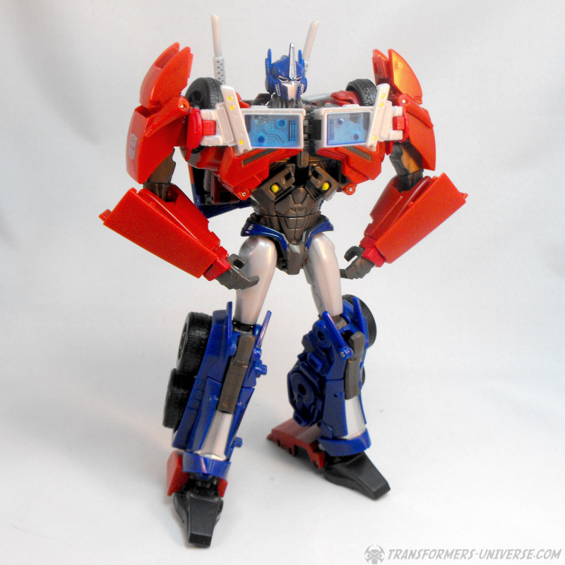 Robotermodus (FE): Eines fällt einem direkt mal auf: selten sah eine Optimus Prime Figur so sehr nach einem professionellen Schwimmer aus. Mit seinem breiten, muskulös wirkenden Oberkörper und dem langen, schlanken Unterkörper wirkt Optimus so, als könne er Cybertrons Rostmeer in Rekordzeit durchpflügen. Und direkt als zweites: er ist ein beinahe perfektes Abbild des CGI Charakters aus der TV Serie. Schon an dieser Stelle kann man sagen: die absolut vorbildgetreuste Abbildung des TV Charakters, die mir bisher untergekommen ist. Das hier ist übrigens die Hasbro Version, die etwas hellere Farben als die Takara Version hat, aber das sind soweit ich weiß die einzigen Unterschiede.