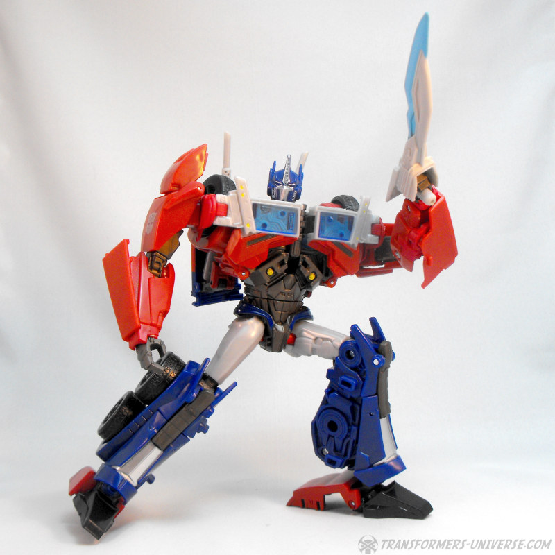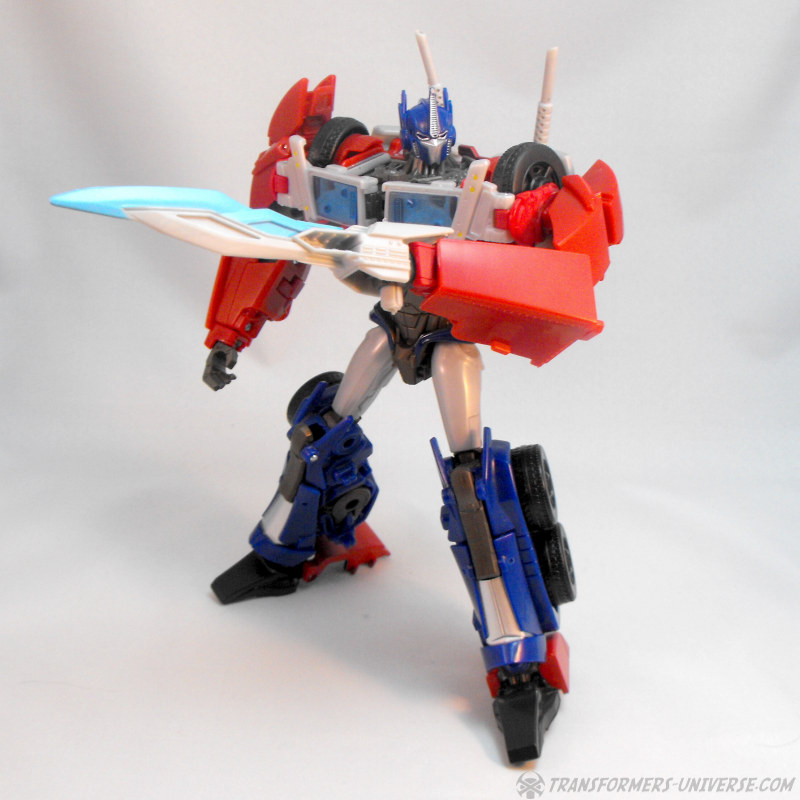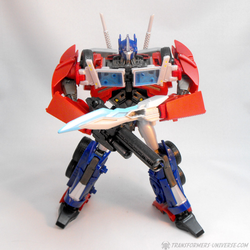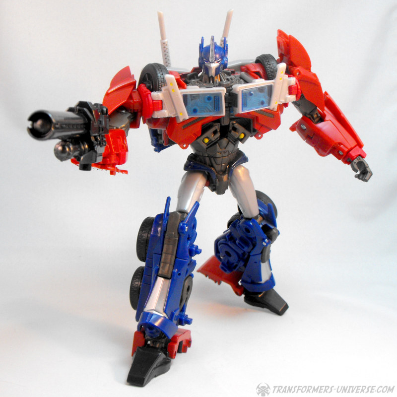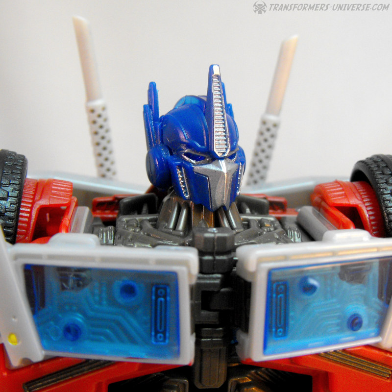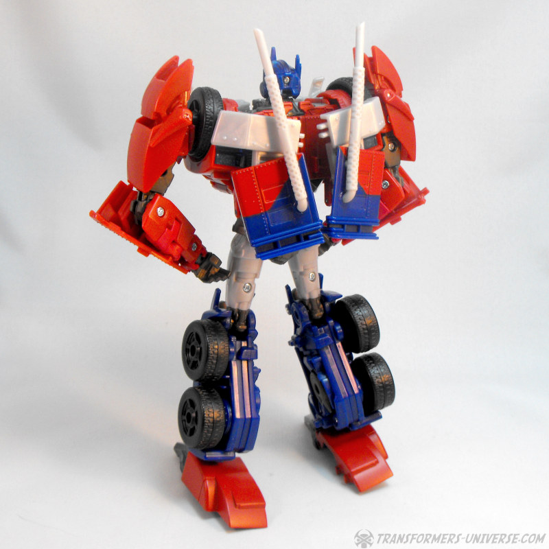 Die Beweglichkeit ist süperb und bietet keinen Grund zur Klage. FE Optimus kann sich fast beliebig in Pose werfen und dank großer Füße hat er kein Problem mit seiner Standfestigkeit dabei. Was man allerdings im Hinterkopf behalten sollte ist, dass die Steckverbindung zwischen Armen und den Rädern auf den Schultern nicht die allerstabilste ist, exzessives Arm-Posing sollte deshalb vorsichtig durchgeführt werden. Außerdem erwähnenswert: eigentlich soll man die unteren Teile der Schulterplatten noch seitlich ausklappen, was mir persönlich allerdings nicht gefällt. Man muss sie bewegen, wenn Optimus’ Arme zur Seite gehen, aber ansonsten empfehle ich sie unten zu lassen.