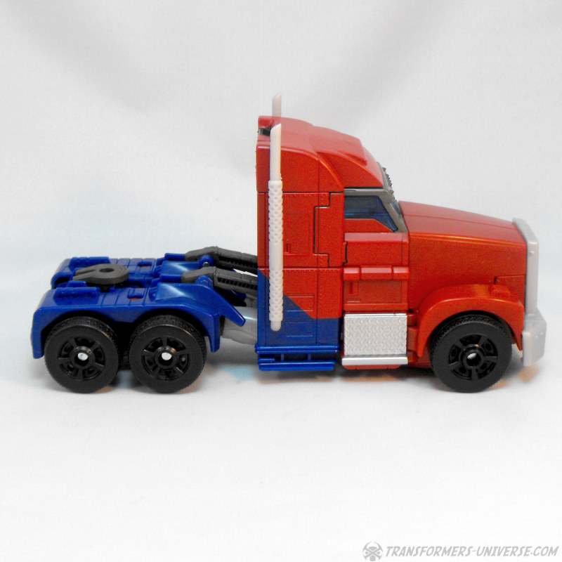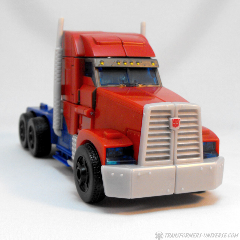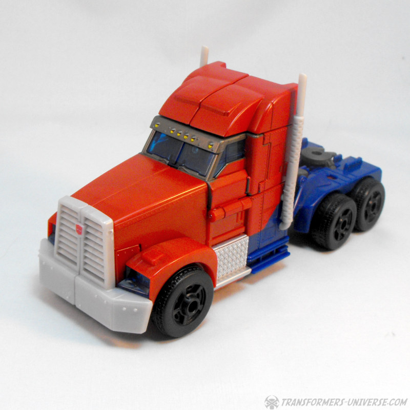Alternativmodus (FE): Bedenkt man die Größe dieses Roboters, so ist sein Alternativmodus erstaunlich klein. Alles faltet sich sehr gut zusammen und fügt sich gut ineinander. Aus irgendeinem Grund muss man die rechte Fahrertür erstmal mit etwas Kraft reindrücken, damit sie auch wirklich an Ort und Stelle bleibt, aber ich denke das wird eher eine Eigenheit meines Exemplars sein und kein generelles Problem. Der entstehende LKW ist ebenso schnittig wie der Roboter und erinnert mich eigentlich mehr an Energon Rodimus denn an irgendeinen der vielen, vielen LKWs, zu denen die diversen Optimus Primes werden. Kleiner Minuspunkt hier: die Windschutzscheibe des LKWs ist nicht die Brust des Roboters. Stört mich persönlich jetzt weniger, aber andere vielleicht.
