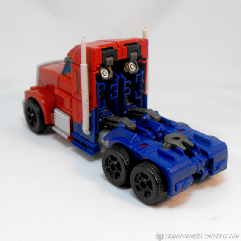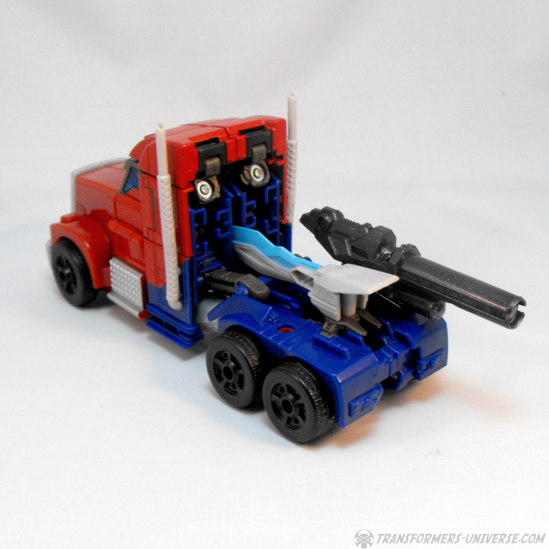 Die Detaillierung des LKWs ist gut, wenn auch unspektakulär. Der Kühlergrill vorne hätte etwas Farbe vertragen können, aber ansonsten keine Beschwerden. Primes Waffen können hinten verstaut werden, man kann sie in die Anhängerkupplung bzw. die beiden Löcher rechts und links davon stecken. Natürlich bleiben sie dort vollkommen sichtbar, insofern lasse ich sie lieber ganz weg, aber es gibt zumindest eine Verstaumöglichkeit. Alles in allem also ein guter LKW-Modus. Nicht so spektakulär wie die von anderen Optimus Primes der letzten Jahre, aber für diese Figur vollkommen ausreichend. Keine Beschwerden.