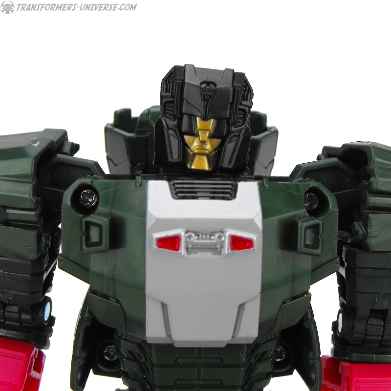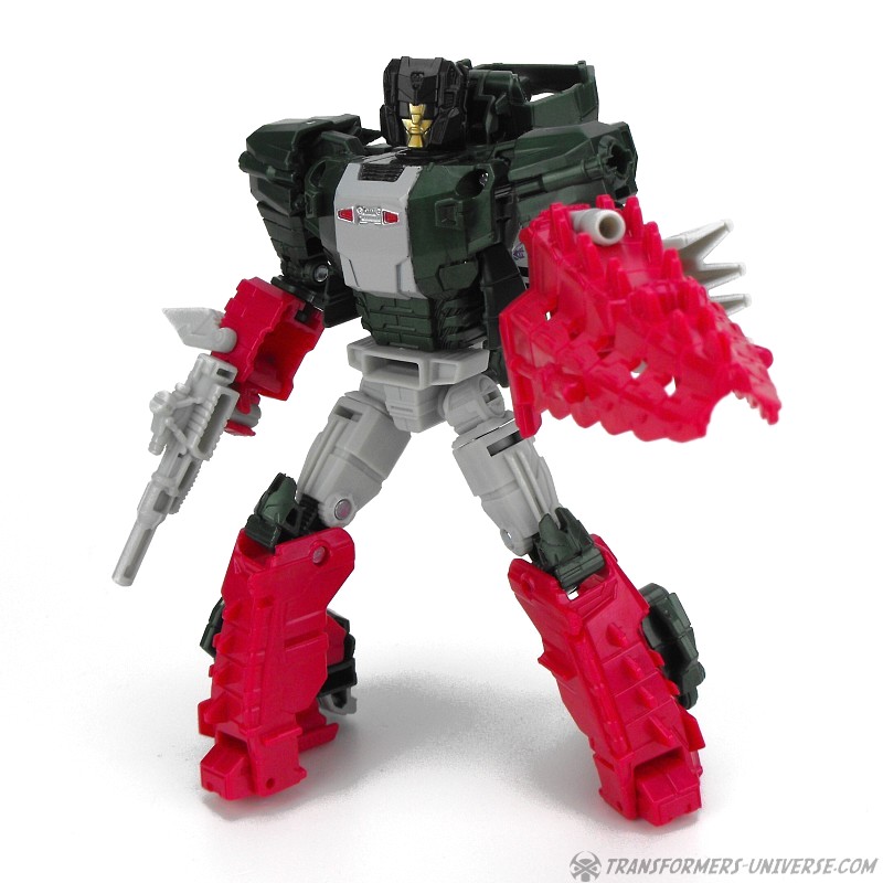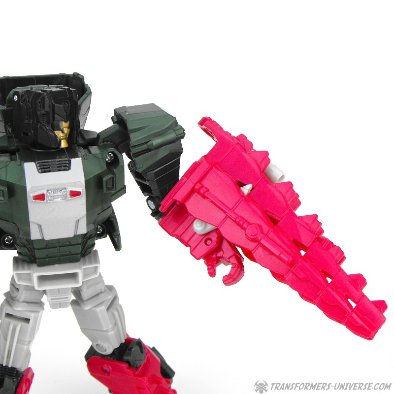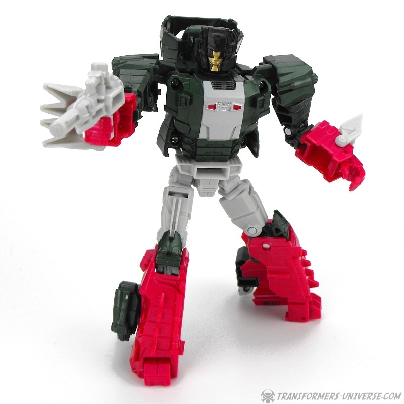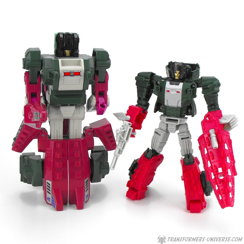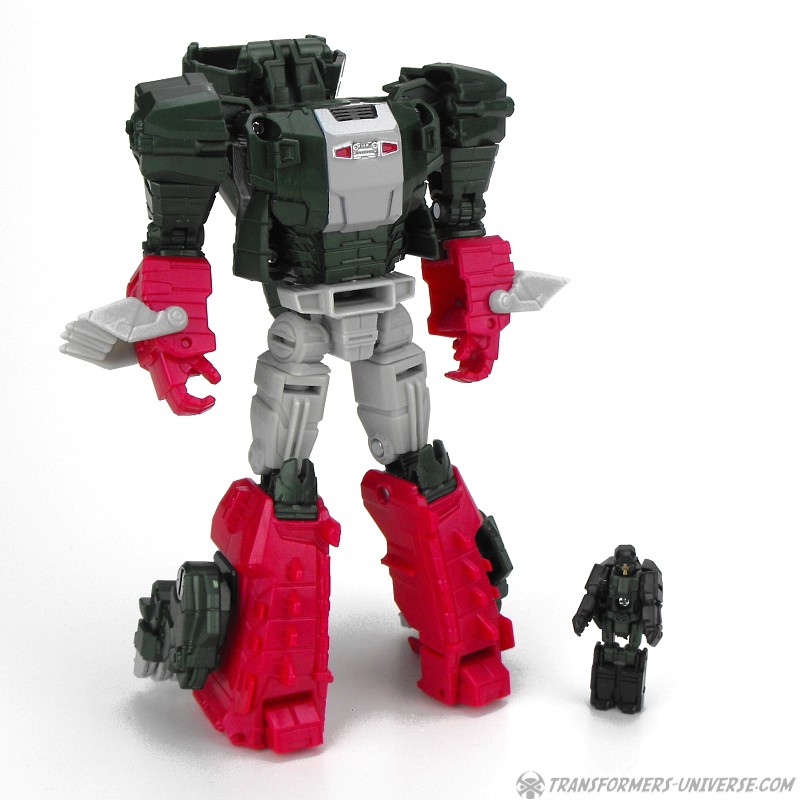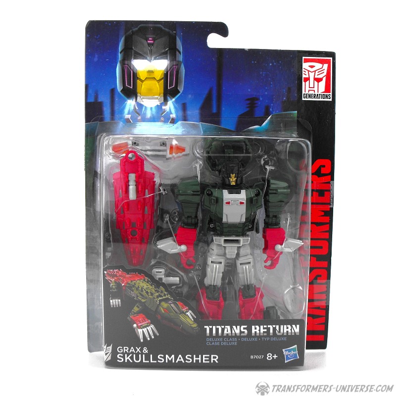 Partner: Skullsmashers Titan Master Partner darf den Namen seines G1 Vorgängers behalten, Grax. Grax ist ein typischer Titan Master mit Kugelgelenk-Schultern und verbundenen Beinen, so gut und beweglich wie man es von einer Figur dieser Größe halt erwarten kann. Er ist natürlich mit allen anderen Titans Return Headmasters kompatibel. Interessanterweise ist bei ihm trotz einer gelungenen Ähnlichkeit mit seinem G1 Vorgänger ein Farbtausch vorgenommen worden. Er hat einen grünen Torso und schwarze Gliedmaßen, bei G1 Grax war es gerade andersrum. Insgesamt also eine gute, durchschnittliche Titan Master Figur.