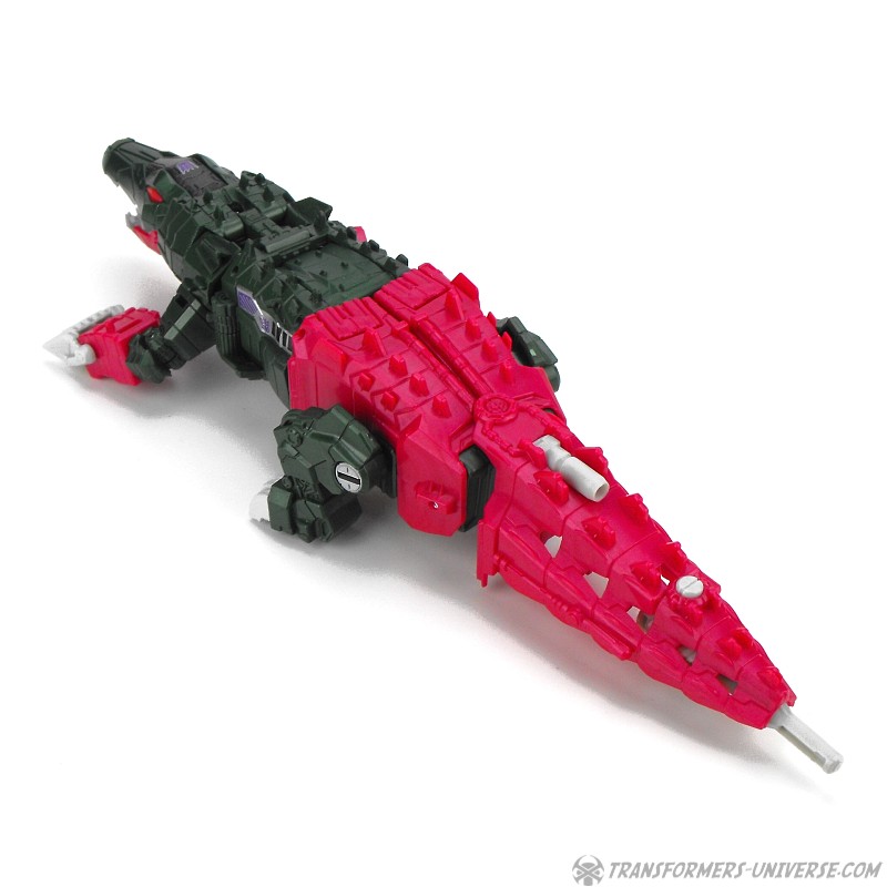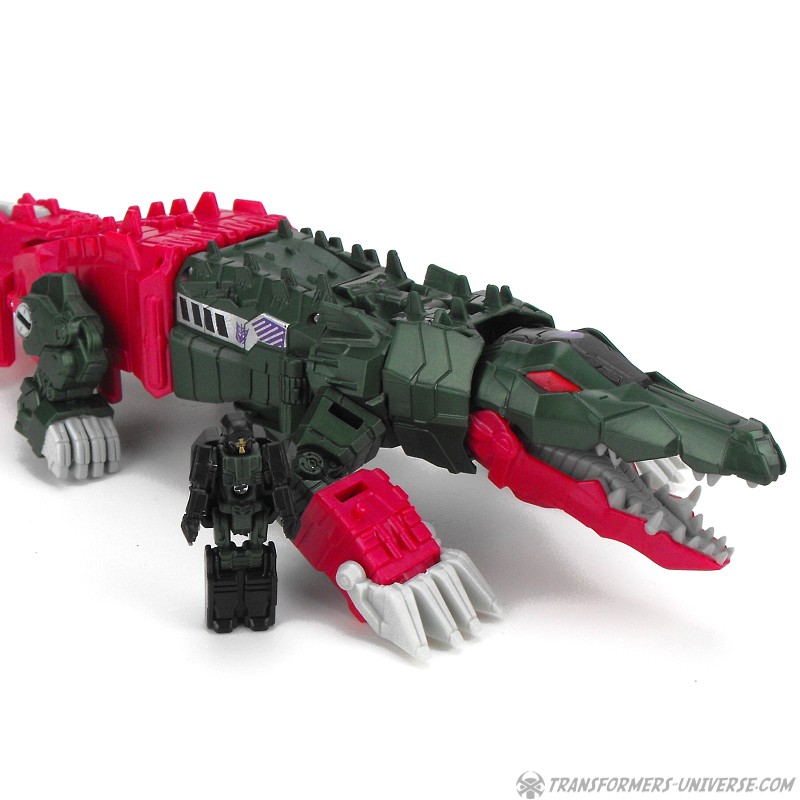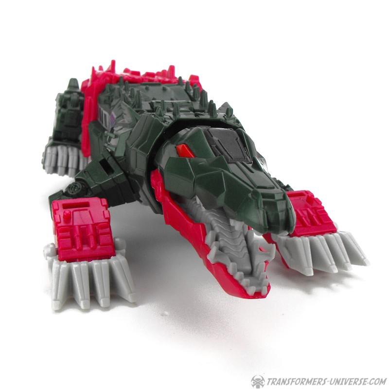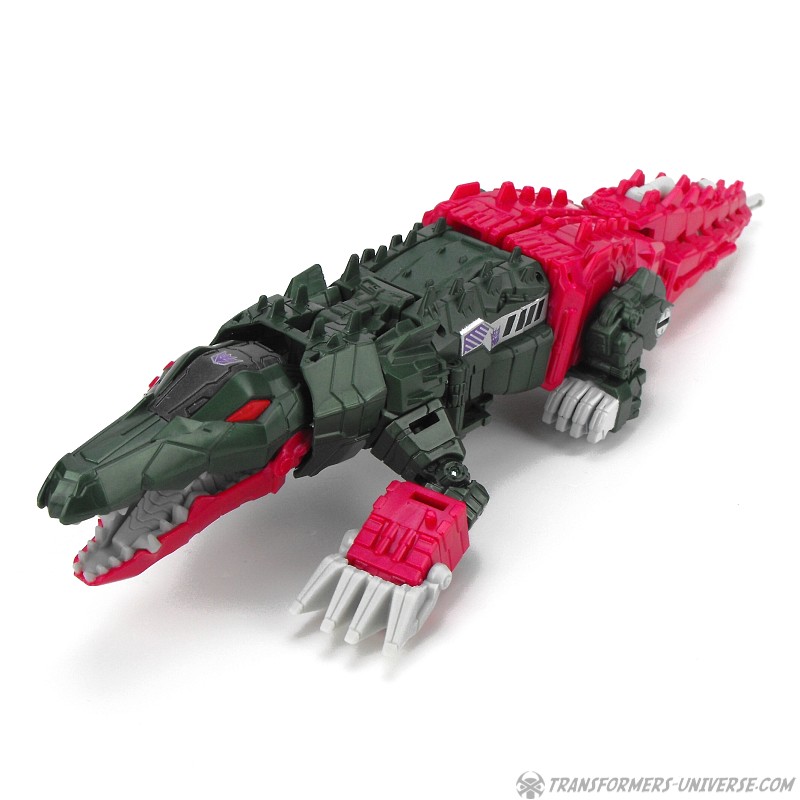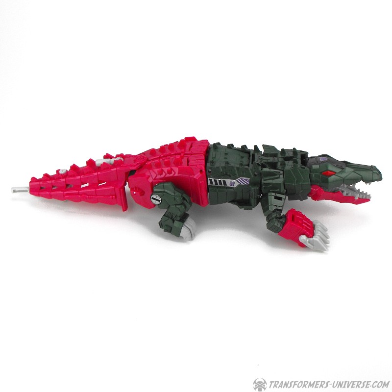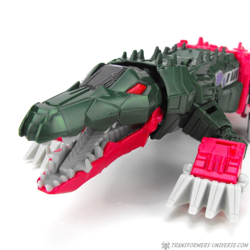 Alternativmodus: Skullsmasher wird immer noch zu einem Roboterkrokodil (oder Alligator? Weiß nie woran man den Unterschied erkennt). Vom Look her gibt es wenig Abweichungen zum G1 Vorbild außer der Größe, aber dieses Krokodil hier ist tatsächlich auch beweglich. Der Kopf ist auf einem Gelenk und somit beweglich, das sich öffnende Maul beinhaltet statt dem Cockpit für Grax eine skulptierte Zunge und der Schwanz ist so befestigt, dass auch er ein wenig hin- und herschwingen kann. Selbst die winzig kleinen Beinchen können sich etwas bewegen. Die Pistole des Roboters wird im Schwanz verstaut, kann also nicht verloren gehen.