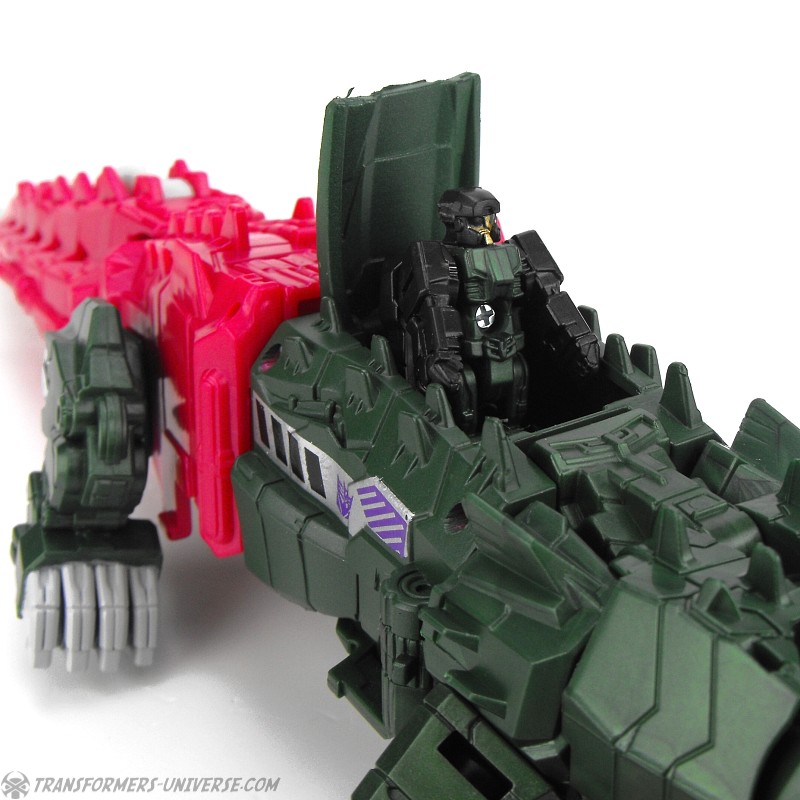 Wie schon erwähnt ist das Cockpit für den Titan Master nicht länger im Mund, sondern weiter hinten im Torso. Aus irgendeinem seltsamen Grund allerdings haben sich die Designer entschieden, die Cockpit-Abdeckung nicht aus Plastik, sondern aus einem gummiartigen Material zu bauen. Keine Ahnung was hier die Idee war. Vom Look her macht es keinen wirklichen Unterschied, aber das Gummi ist bereits frisch aus der Packung etwas verbogen und das Cockpit zu öffnen und auch wieder ordentlich zu schließen ist somit etwas mühselig. Keine große Sache, aber etwas nervig. Somit insgesamt ein guter Krokodilmodus. Wäre das Cockpitpaneel jetzt noch solide, dann hätte ich keinen Grund zur Beschwerde.