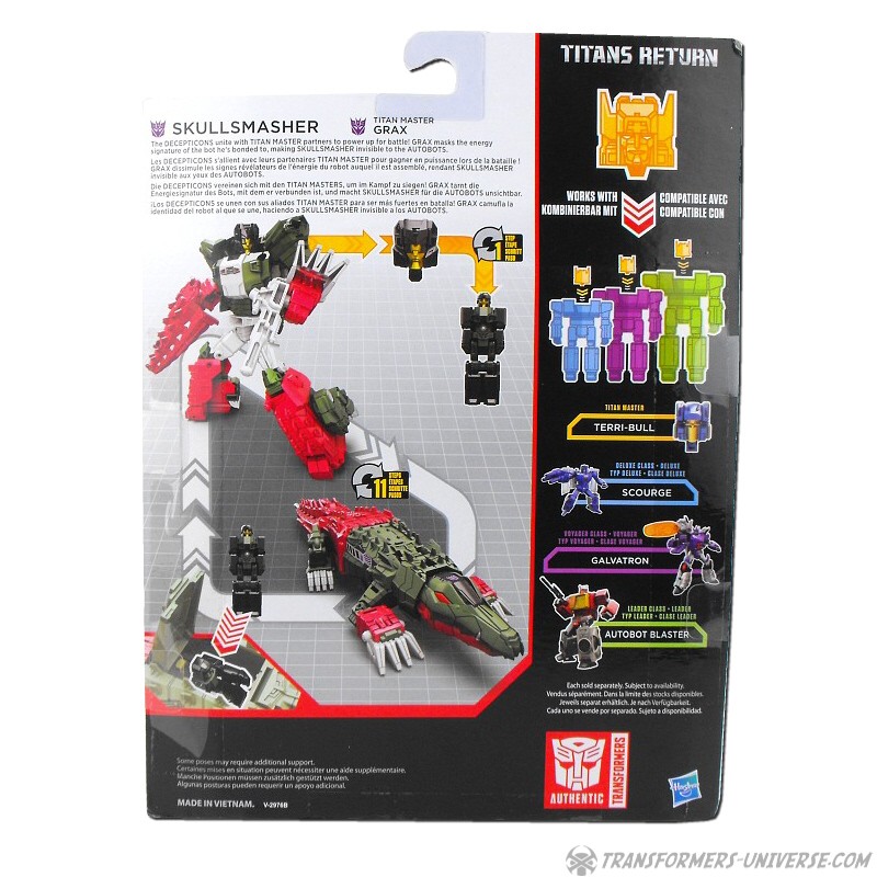 Skullsmashers Schwanz und Pistole können zu einem Geschützstand für Grax zusammengesteckt werden, der außerdem an den Basis-Modi der Titans Return Leader-Klasse Figuren befestigt werden kann.