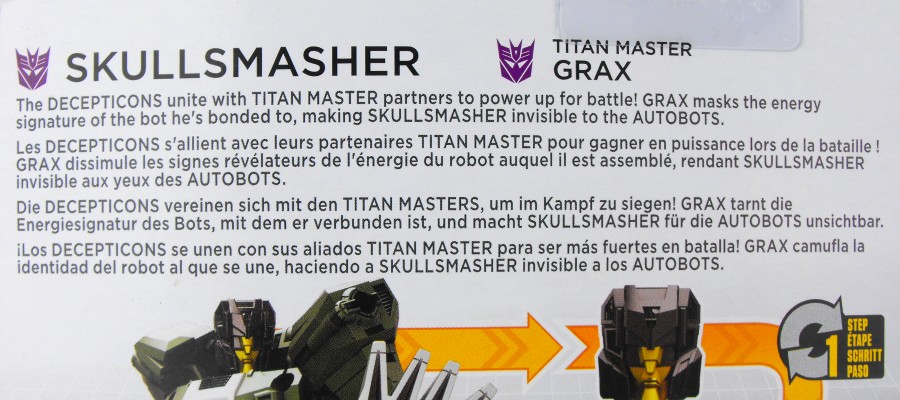 Skullsmasher hat endlos Appetit auf Kampf, und auf Autobots! Er braucht keine Blaster oder andere Waffen -- er besiegt seine Gegner lieber, indem er sie verschlingt. Er gehört nicht zu den leisesten Decepticons, was es ihm erschwert seine Beute zu fangen. Titan Master Grax macht Skullsmasher für die Autobots unsichtbar indem er seine Energiesignatur maskiert. Wenn sie sich vereinen, dann ist Essenszeit.