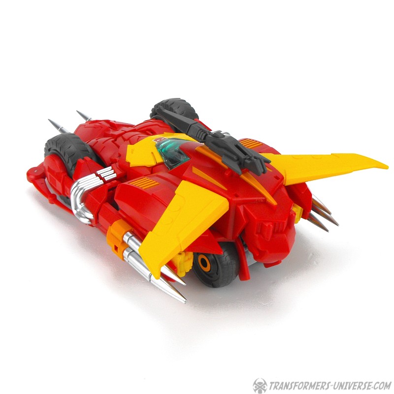 Alternativmodus: Calidus verwandelt sich in ein futuristisches Fahrzeug mit ganz klarem Rodimus / Hot Rod Look, aber trotzdem mit einem ganz eigenen Touch. Große Vorderreifen geben ein Gefühl von Power und der Bogen aus dem Robotermodus dient hier als Stoßstange und Ramm-Spike Kombi. Die Kanone kann oben auf dem Dach montiert werden. Die Transformation in den Auto-Modus ist komplex, aber nicht schwierig, somit auch hier keine Beschwerden. Viel mehr kann ich hier nicht schreiben, was die Bilder nicht besser vermitteln. Ein schöner Fahrzeugmodus, keine sichtbaren Roboterteile und klar aus Auto-Form von Hot Rod / Rodimus erkennbar. Beide Daumen hoch auch hier.