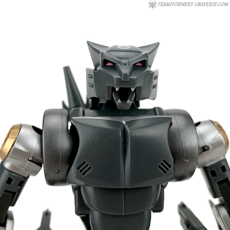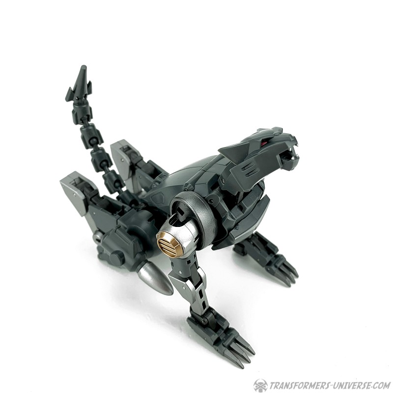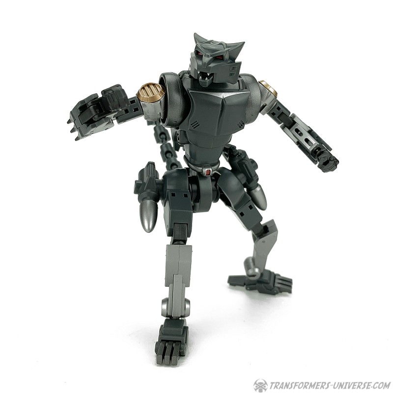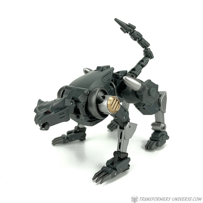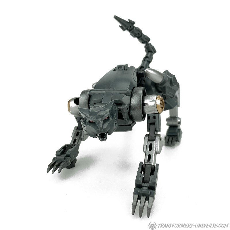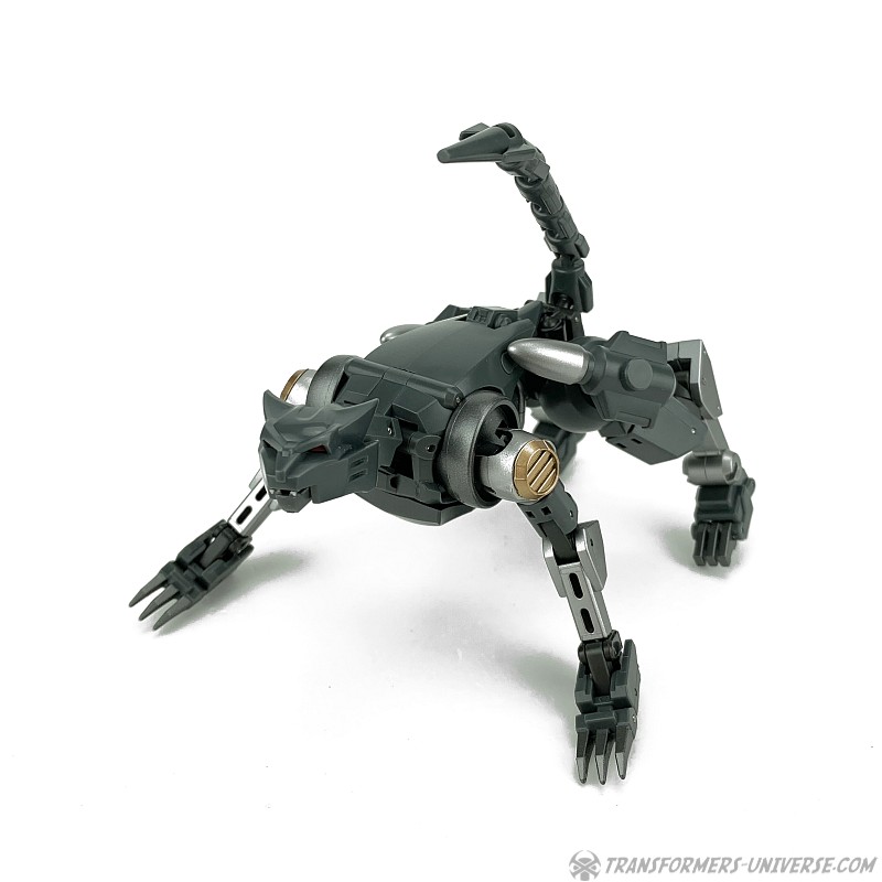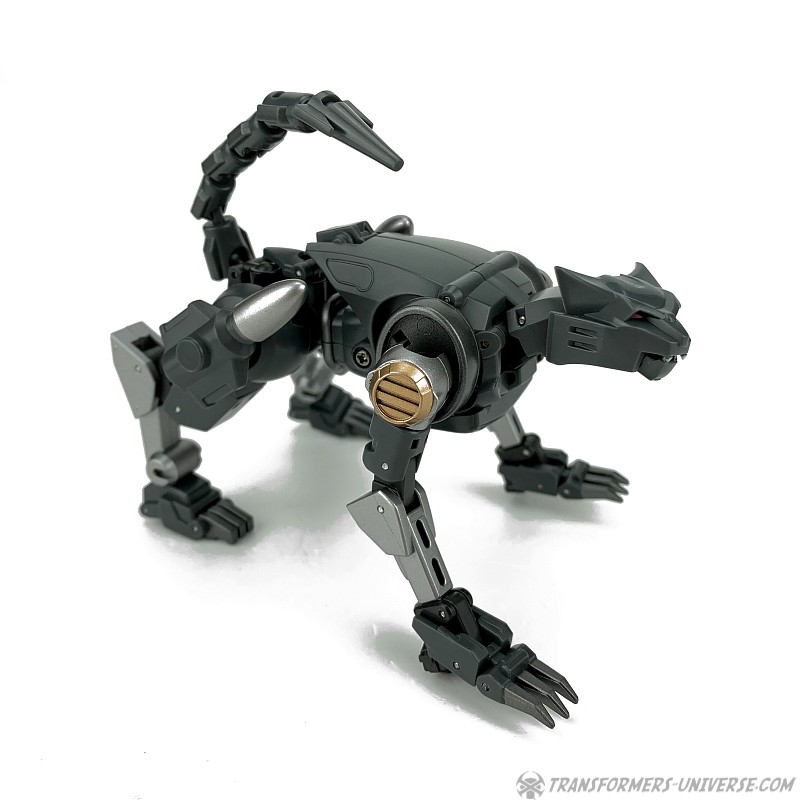 Biestmodus: Die meisten Versionen von Ravage hatten niemals einen humanoiden Robotermodus, sein Primärmodus war meistens der eines Jaguars (oder besser gesagt eine generische schwarze Roboterkatze). Der Biestmodus der MMC Figur ist in etwa Deluxe-groß und präsentiert sich als sehr bewegliche Roboterkatze. Alle vier Beine sind voll beweglich, der Kopf sitzt auf einem mehrgelenkigen Hals, das Maul lässt sich öffnen, es gibt ein Hüftgelenk, und der Schwanz besteht aus einzelnen Kugelgelenken. Somit hier keinerlei Beschwerden, Jaguar ist wunderbar beweglich.