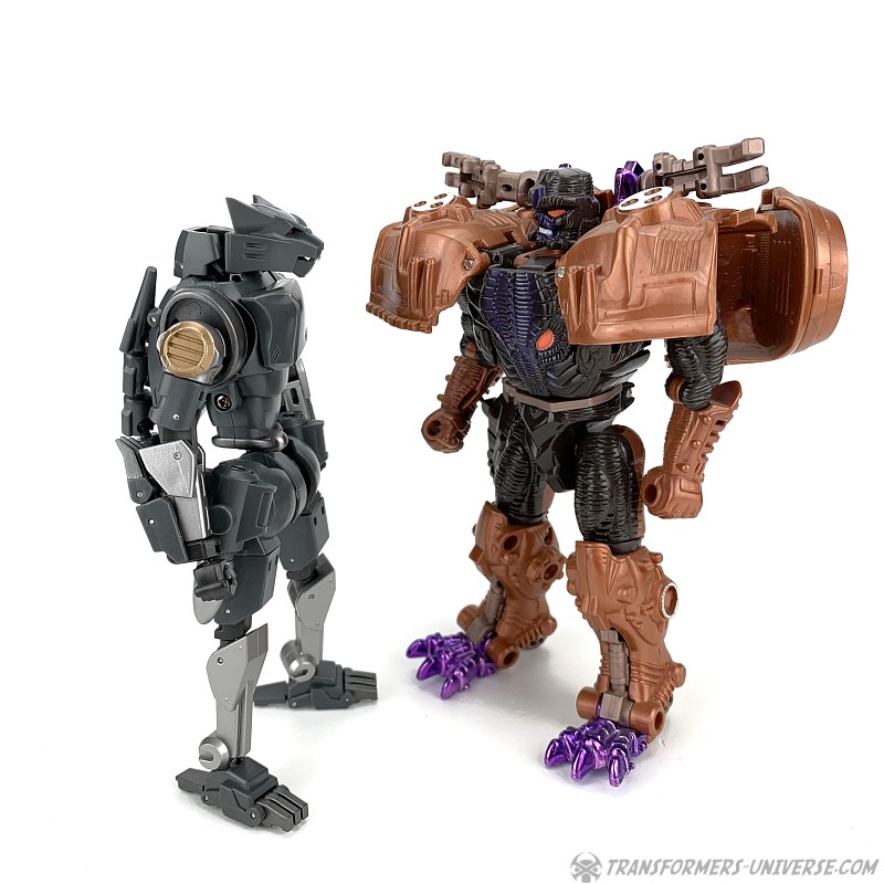Als Roboter behält er natürlich die volle Beweglichkeit seines Biestmodus, hier also keine Probleme. Außer den Raketen an den Hüften hat er noch zwei Pistolen als Waffen dabei, die er in der Hand halten oder hinten an den Hüftraketen wie in einen Halfter stecken kann. Randnotiz: die Pistolen und dass er im Prinzip ein aufrecht stehender Jaguar ist, machen – zumindest für mich – MMC Jaguar hier zu Beast Wars Ravage (wie im Beast Wars Dreiteiler „The Agenda“ zu sehen). Als in etwa Deluxe-großer Roboter passt er auch vom Maßstab her hervorragend zu Beast Wars Figuren. Somit unterm Strich für den Robotermodus: nicht wirklich viel anders als der Biestmodus, aber funktioniert genauso gut.