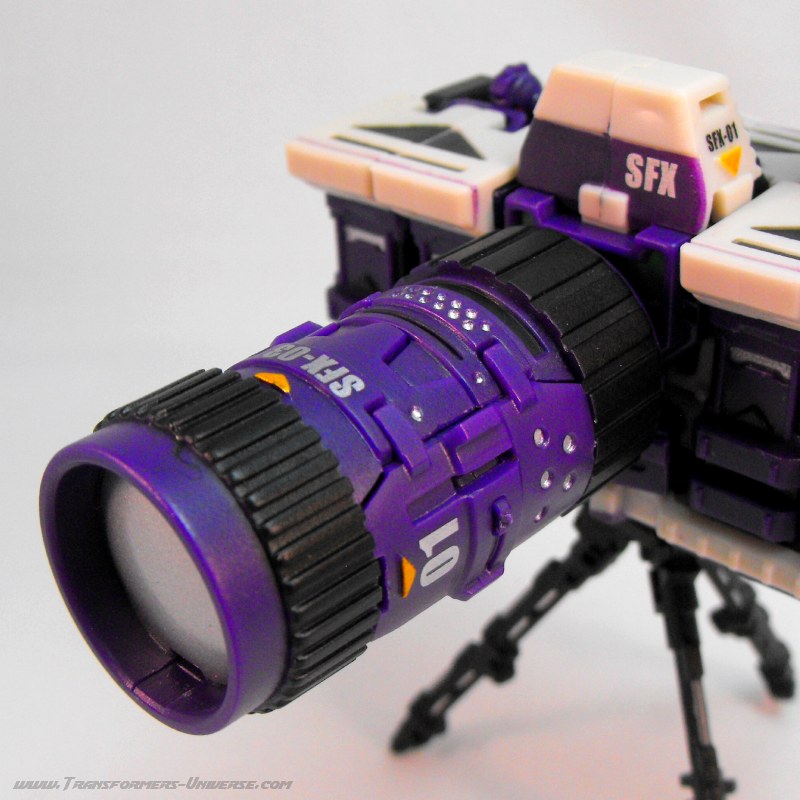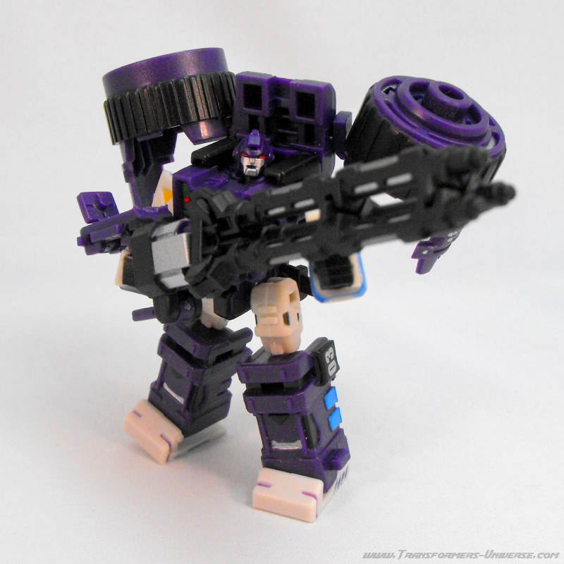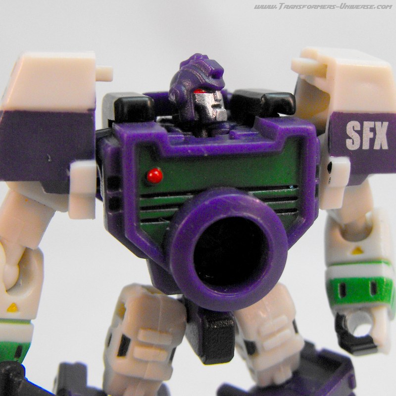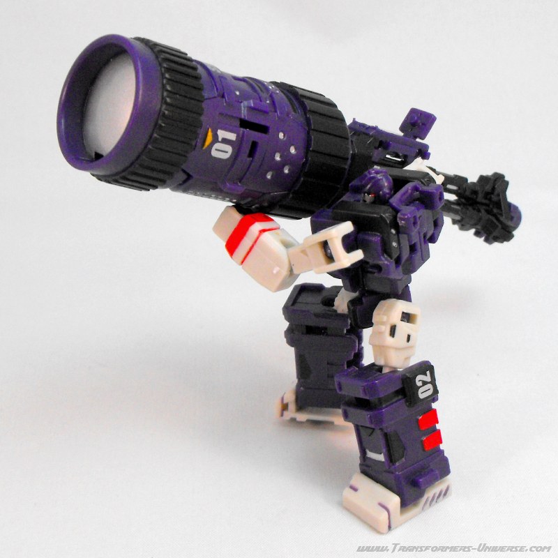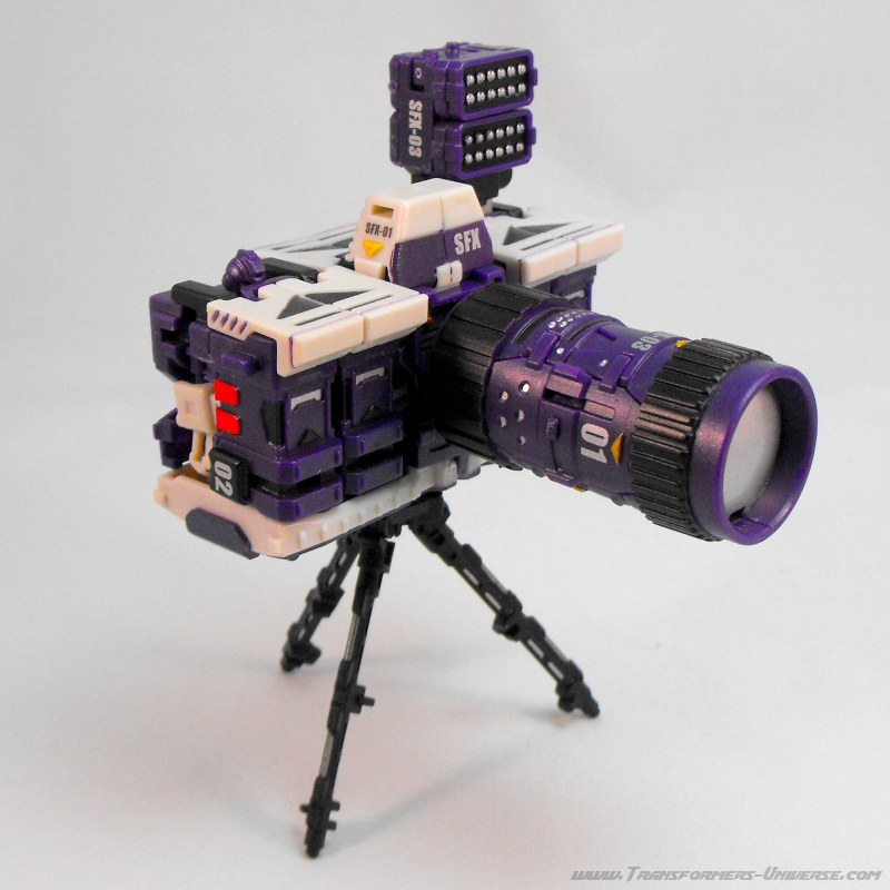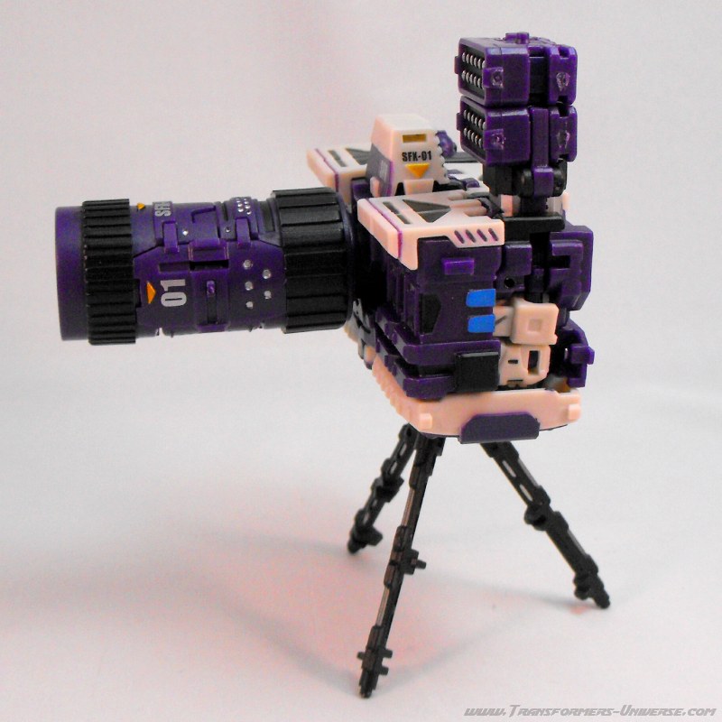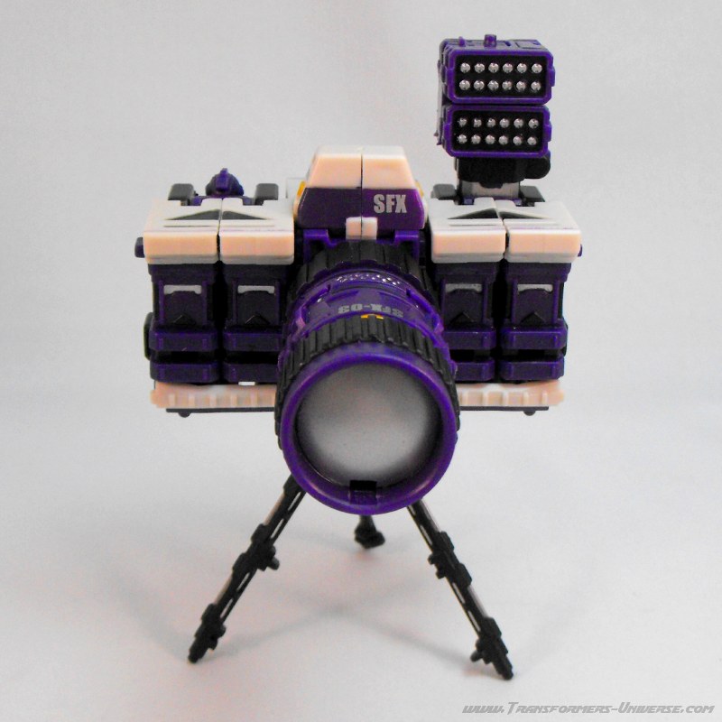 Alternativmodus: Wie schon in den guten alten Tagen kombinieren sich die drei Roboter zu einer Kamera (und ob es Sinn macht dass sich drei Roboter zu einem einzigen, unbeweglichen Gegenstand vereinen sollte an anderer Stelle ausdiskutiert werden). Zum einen will ich anmerken, dass es mich sehr beeindruckt hat, dass das gesamte große Arsenal an Zusatzteilen der Roboter hier vollends und nicht sichtbar integriert ist. Die drei Gewehre werden im Objektiv verstaut, die Raketenwerfer werden zum Blitz, das große Schild wird zum Unterteil der Kamera und die große Minigun wird ein Dreibein, wo man sie draufstellen kann. Sehr schön gemacht, alles ist gut verpackt und somit ist auch die Gefahr, Einzelteile zu verlieren, auf ein Minimum reduziert.
