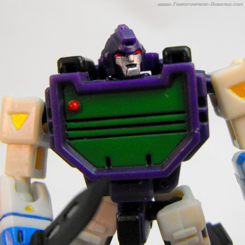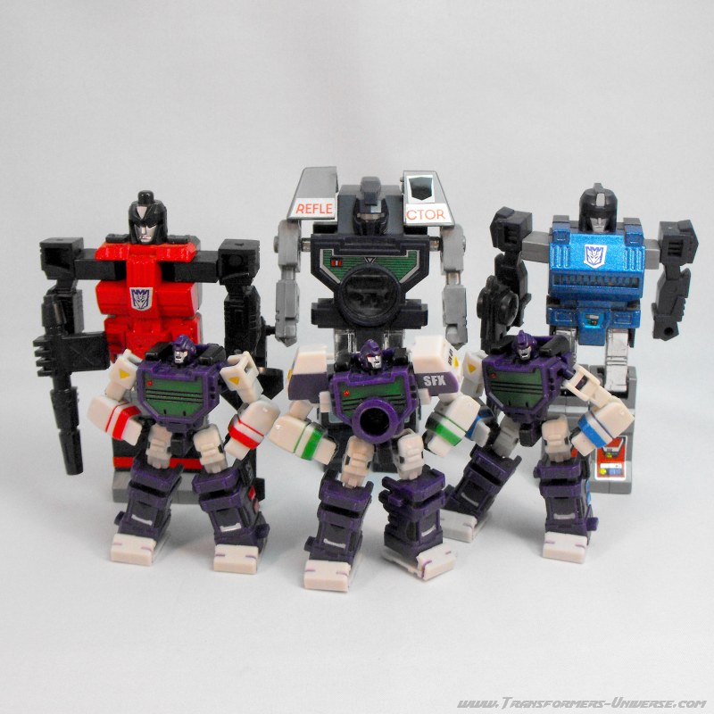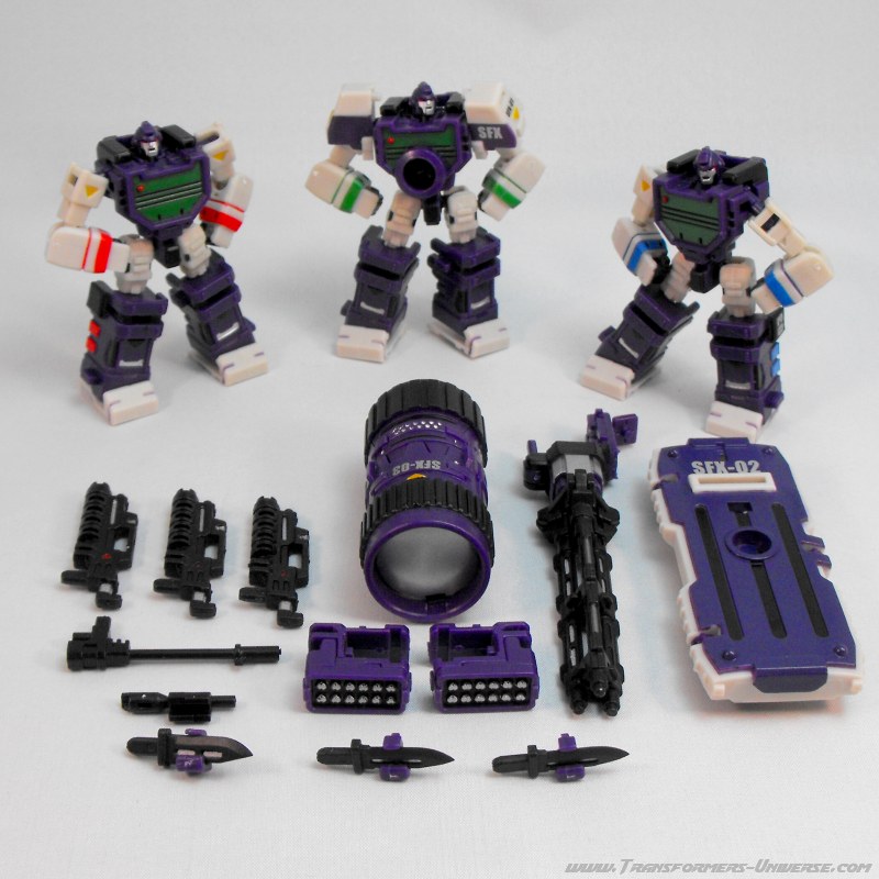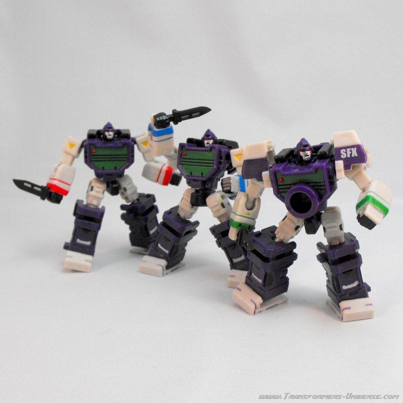 Da das nun aus dem Weg ist, sprechen wir über die drei Roboter, die die Scouting Force bilden. Sie sind Reflectors TV Charakter nachempfunden, nicht den Spielzeugen, und somit sehen sie alle drei praktisch identisch aus. Die einzigen Unterschiede sind die farbigen Streifen an Unterarmen und Beinen (grün, blau und rot, eine Referenz an die vorherrschenden Farben bei den G1 Vorgängerfiguren), sowie die Kameralinse auf der Brust von Edge. Alle drei Roboter sind hervorragend beweglich mit voll gelenkigen Armen und Beinen, einem Kopf auf Kugelgelenk, sowie beweglichen Füßen. Ihre Detaillierung ist auch sehr gut, speziell in Hinblick auf ihre geringe Größe.