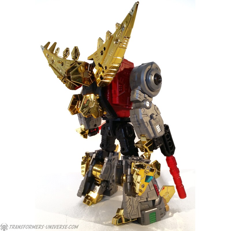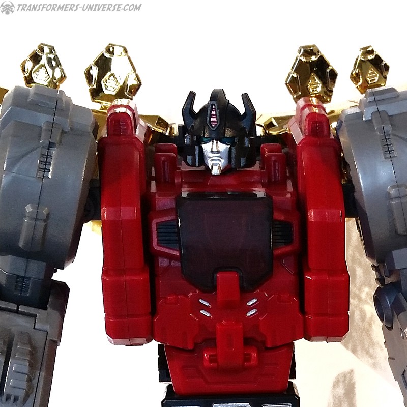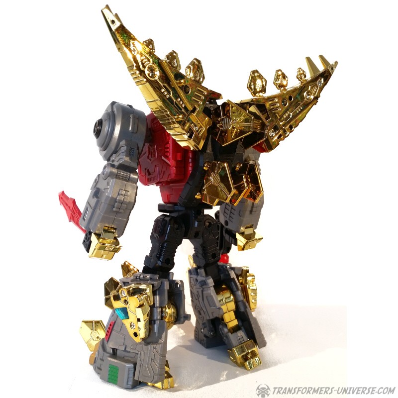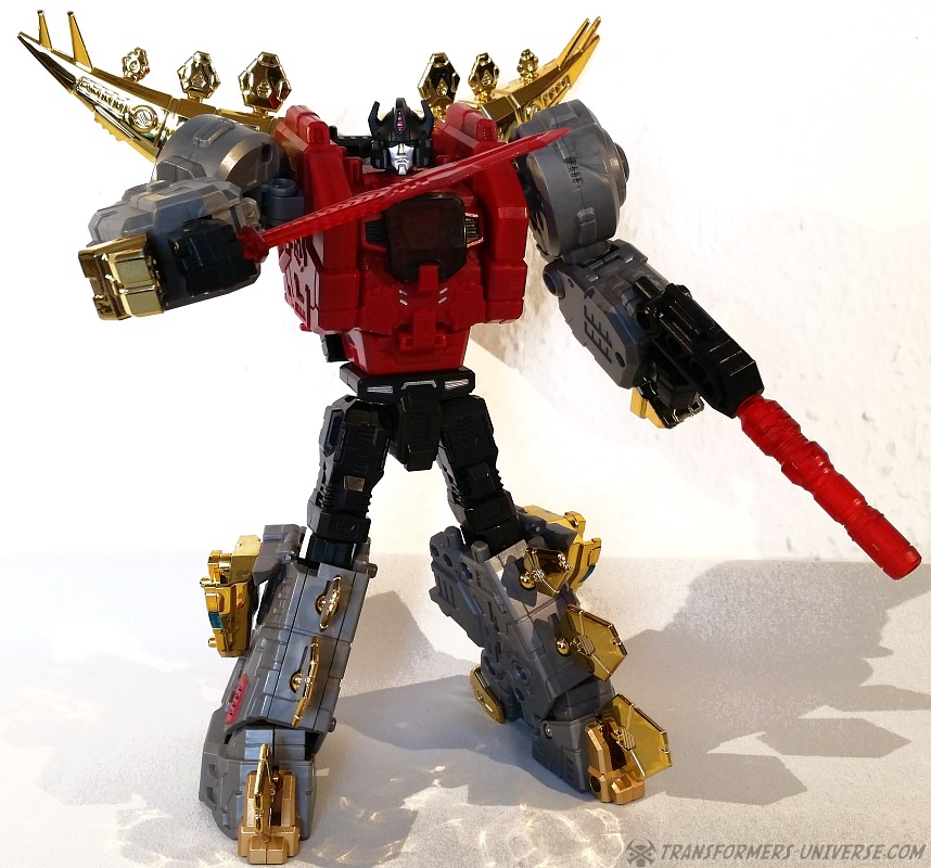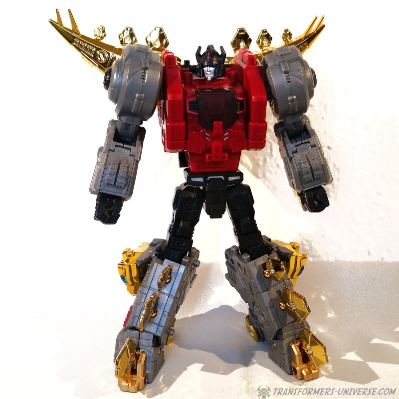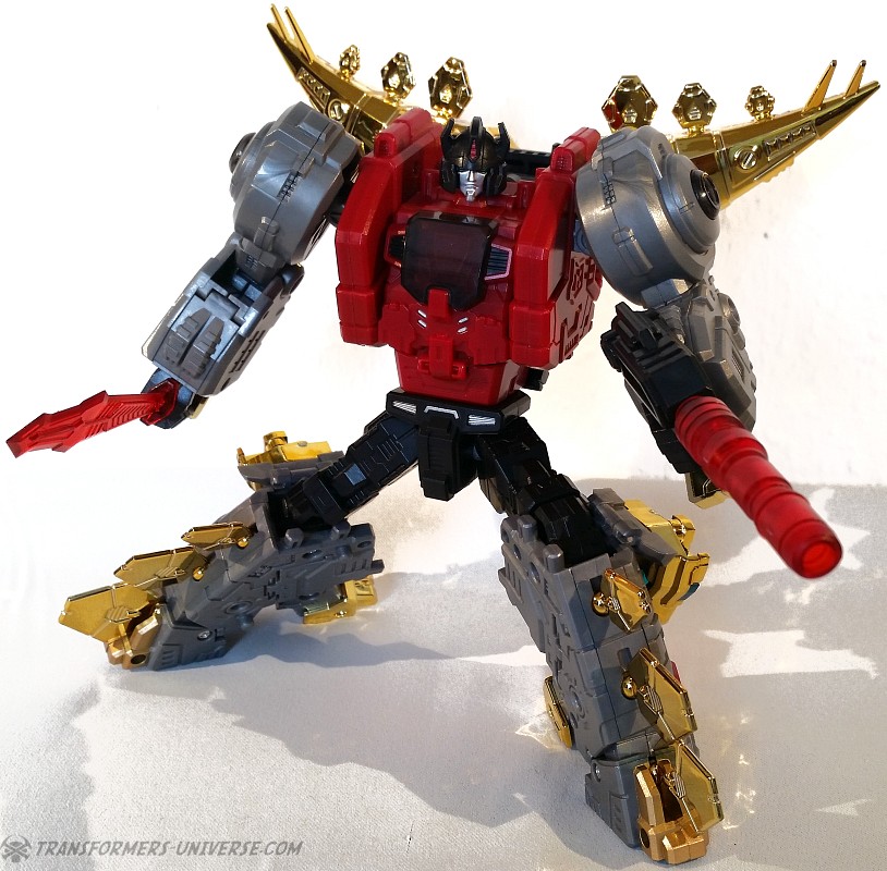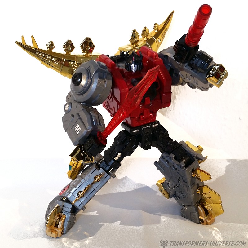 Kurz zu den Waffen. Das Schwert ist ein wenig klein und nicht sonderlich toll und die Handfeuerwaffe jetzt auch nichts Besonderes, aber ausreichend. Diese lässt sich auch in zwei Teile zerlegen, was eine Kombination der Waffen für den fertigen Combiner nahelegt. Mehr kann man kaum sagen, er ist groß, bullig, golden glänzend und einfach G1 Snarl. Super gemacht und den zweiten Daumen hoch!