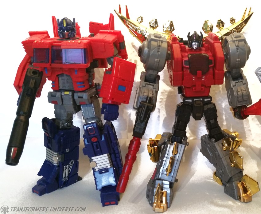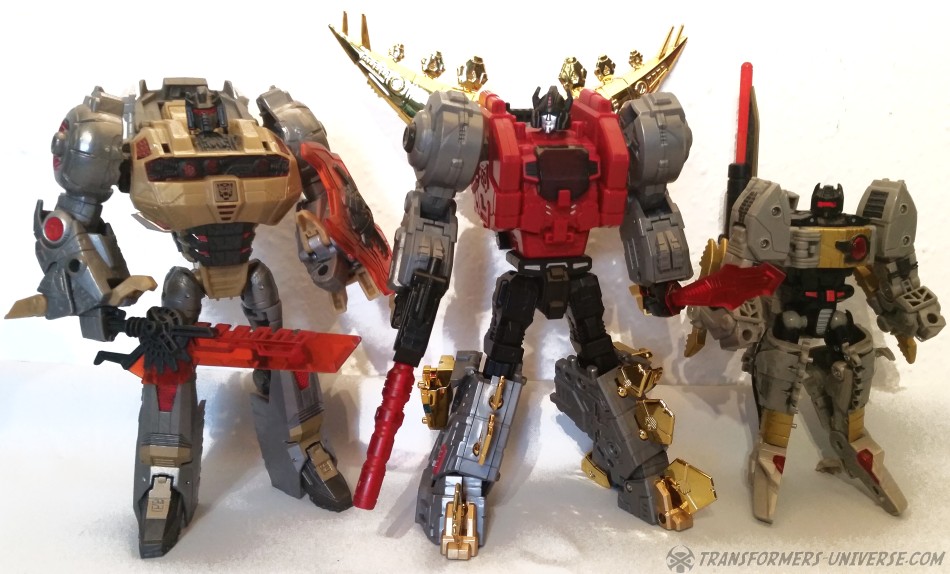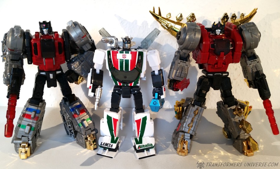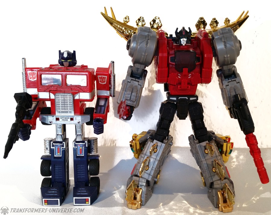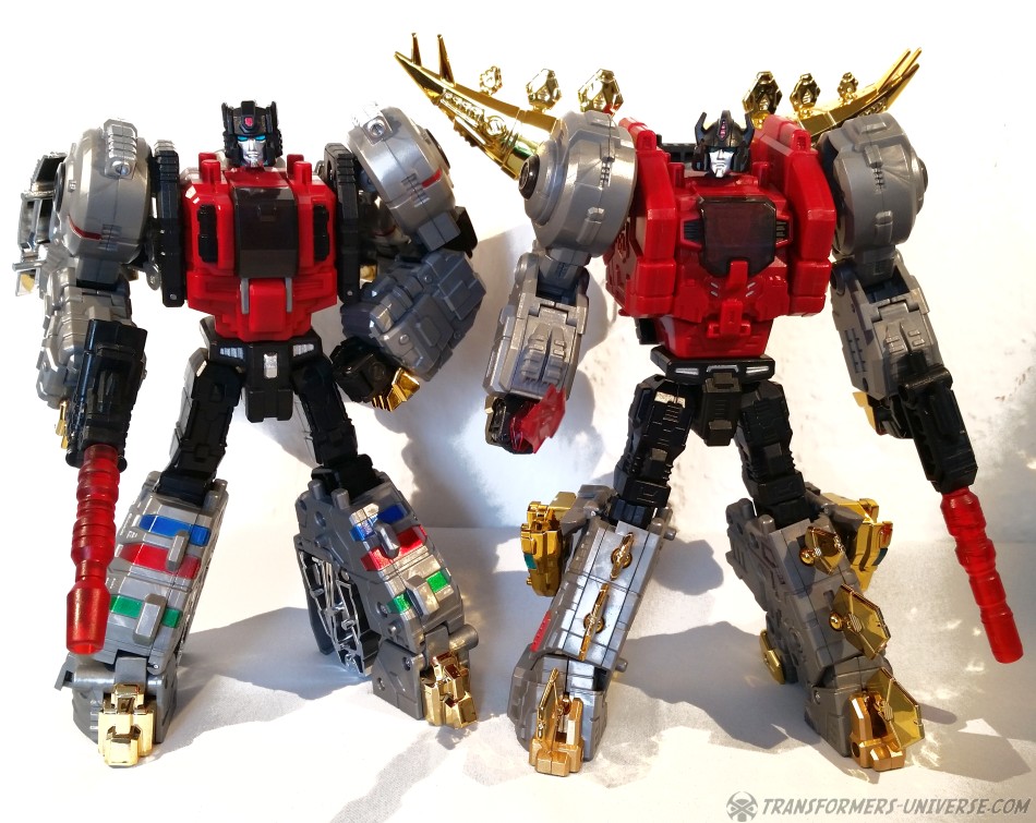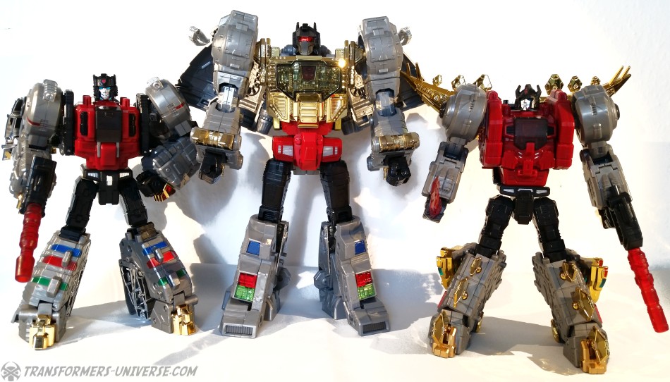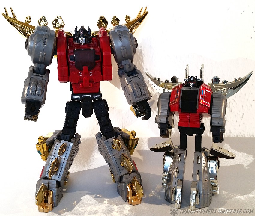 Kurz zu den Waffen. Das Schwert ist ein wenig klein und nicht sonderlich toll und die Handfeuerwaffe jetzt auch nichts Besonderes, aber ausreichend. Diese lässt sich auch in zwei Teile zerlegen, was eine Kombination der Waffen für den fertigen Combiner nahelegt. Mehr kann man kaum sagen, er ist groß, bullig, golden glänzend und einfach G1 Snarl. Super gemacht und den zweiten Daumen hoch!
