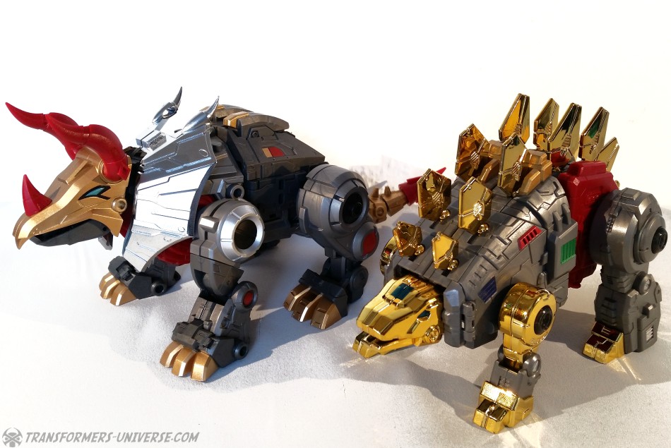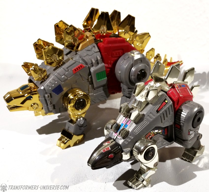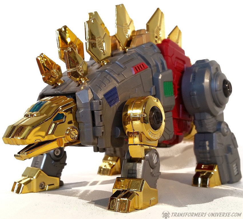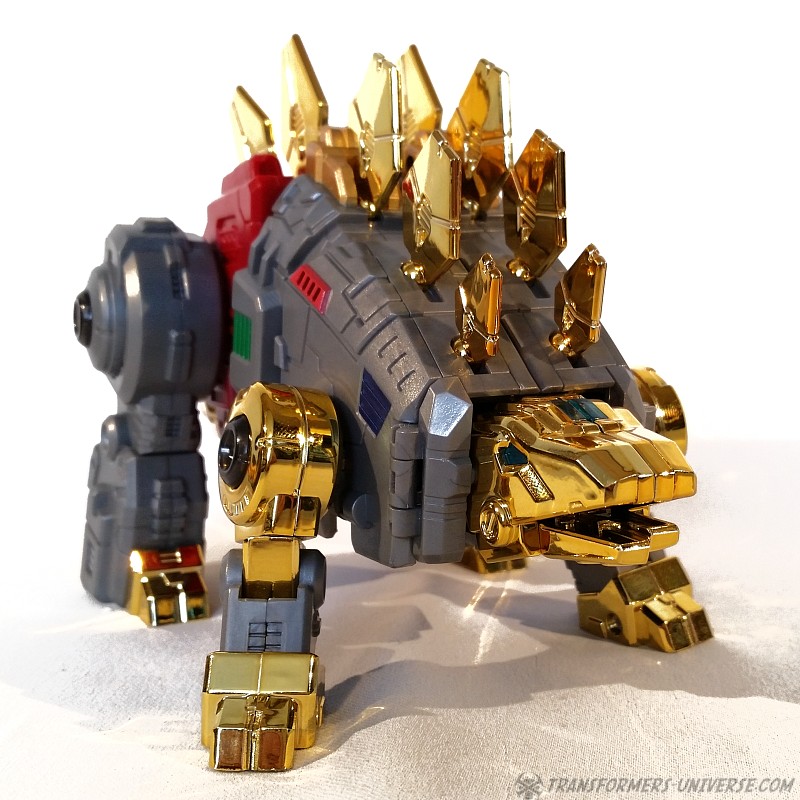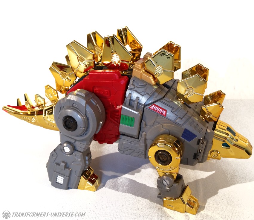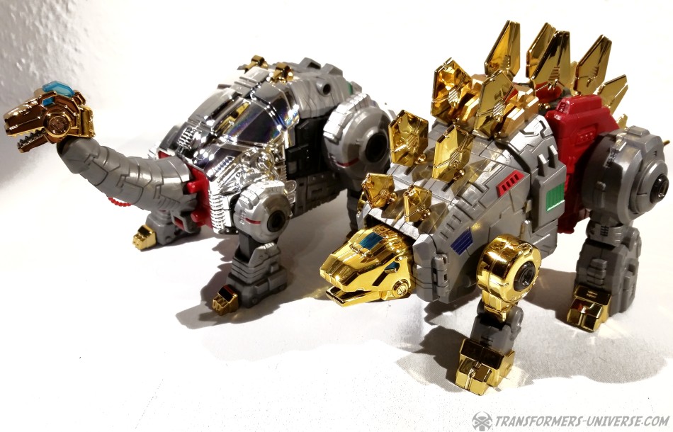 Dinomodus: Hier haben wir ihn, G1 Snarl. Nun ja, eigentlich ja Toyworld Snarl, die beiden sehen sich zum Verwechseln ähnlich. Der Stegosaurus ist das pure, reine Abbild der G1 Figur, in jeder Hinsicht und wohl kaum besser hin zu bekommen. Nicht überdetailliert, aber sehr schön proportioniert. Auch nicht überbeweglich, aber völlig ausreichend, da ein Stegosaurus mit Sicherheit kein Sprinter oder Jäger war. Einfach ein großer, wuchtiger Dinosaurier und er glänzt. Ja und wie er glänzt. Man mag von Chrom halten was man will, aber zu Dinobots passt es eben. Umso mehr wenn man so G1 wie möglich sein möchte. Abgesehen von den lästigen Fingerabdrücken sieht es toll aus. Es glänzt und schimmert vom Feinsten und damit ist dieser Snarl einfach ein toller Anblick. Die G1 Ästhetik ist natürlich Geschmackssache, aber wer es mag oder für Classics/G3 sogar fordert, dann ist das hier genau wonach ihr gesucht habt. Ein großer glänzender Brocken von G1 Dinobot Snarl und das nicht nur im Dinomodus. Aber für diesen schon einmal absolut Daumen hoch!
