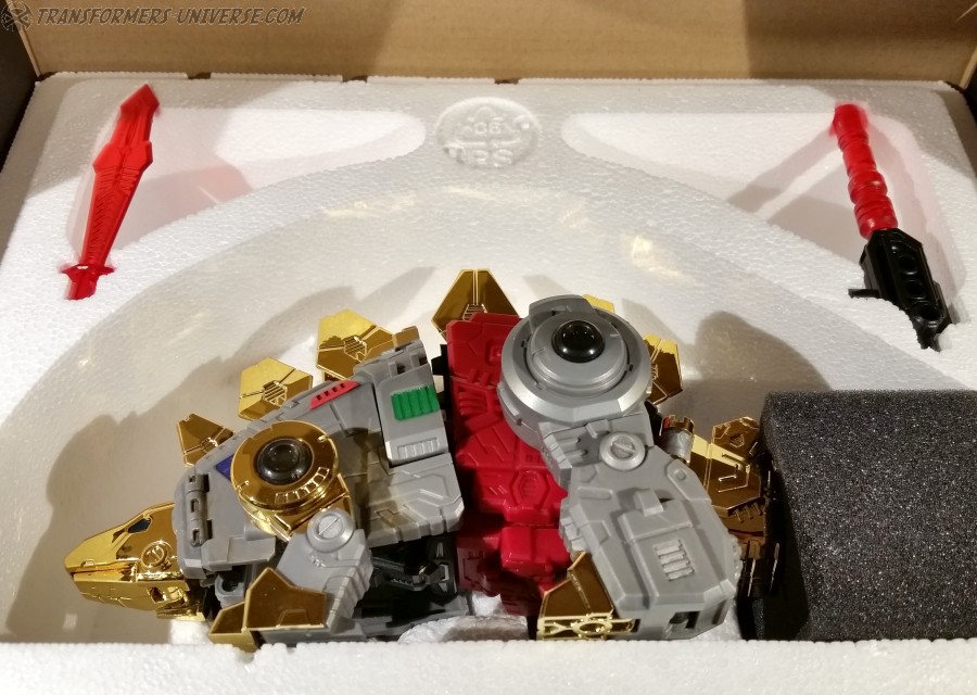 Verpackung: Diese ist hier wichtig, nicht nur weil es eine schöne große Schuhschachtel mit kompletter Einlage aus Styropor ist, sondern auch noch maßlos überdimensioniert daher kommt. Umso mehr, da außer den beiden kleinen Waffen keine Combiner Teile beiliegen. Soll heißen: schön im Aufbau und in Optik, aber viel zu groß und bei aller Größe und dem Schutz, den die Figur darin erfährt, war das erste was ich nach dem Öffnen gesehen habe, eine klaffende Wunde direkt in der Mitte der Figur. Der komplette Torso war nur lose verschraubt, was dazu geführt hat, dass nichts richtig zusammen passt und ein Zahnradgelenk im Oberkörper nicht funktionierte. Da hilft auch Schaumstoff und Styropor nichts mehr. Glücklicherweise war ein Schraubendreher zur Hand und nach kurzer Arbeit wieder alles mehr als in Ordnung. Wer jetzt denkt, typisch Toyworld und nichts für mich, kann mit Lesen aufhören. Die Figur selbst kann dafür allerdings nichts und wer dennoch wissen will, was sie zu bieten hat, der möge weiterlesen.