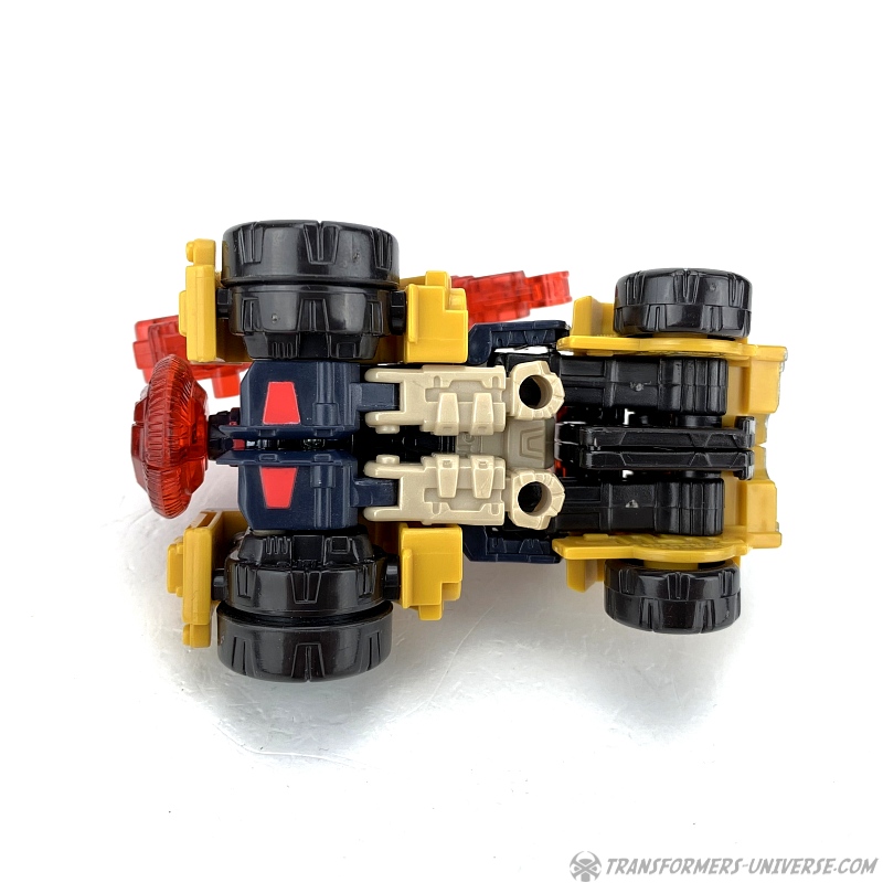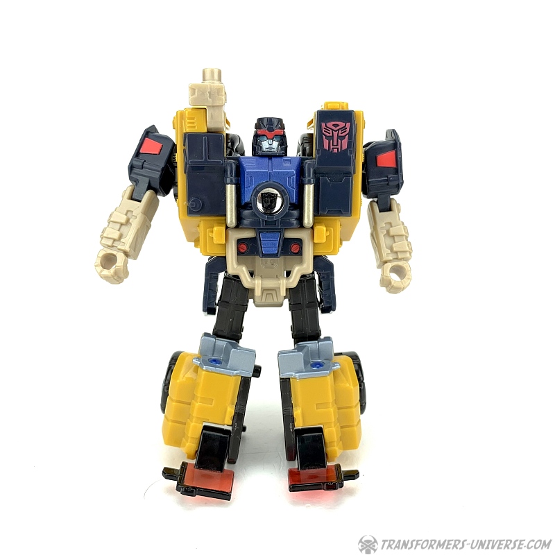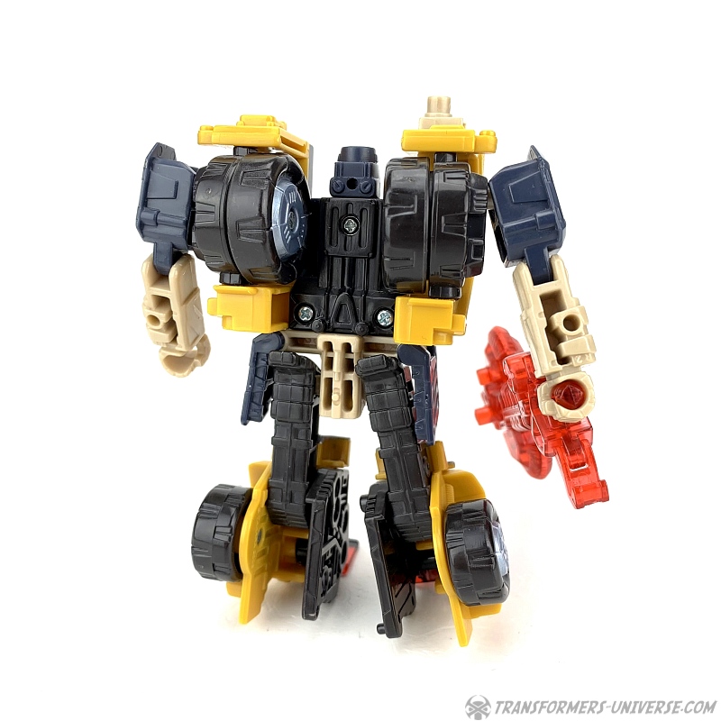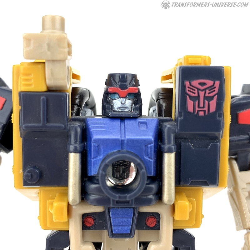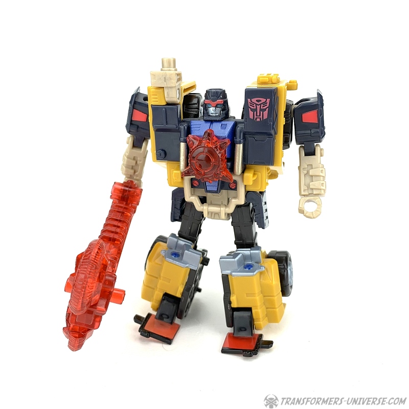 Robotermodus: Strongarm ist ein Roboter der Basic-Klasse (später als Scout-Klasse bekannt und nicht wirklich so viel kleiner als die heutigen Deluxe-Klasse Figuren) mit einer sehr stämmigen Gestalt und riesigen Schultern. Er ist größtenteils gelb und dunkelblau (beinahe schwarz). Seine Beweglichkeit ist hervorragend, inklusive drehendem Kopf, drehender Hüfte, beweglichen ‚Zehen‘ (die Windschutzscheibe des Automodus) und die Art, wie die Schultern designt sind, macht diese ebenfalls sehr beweglich. Es ist nicht so ganz einfach, seine Windschutzscheiben-Füße in einen stabilen Stand zu bringen, aber insgesamt ist Strongarm ein wirklich gelungener Roboter. Speziell der Kopf gefällt mir sehr gut, ein schön skulptiertes Gesicht.