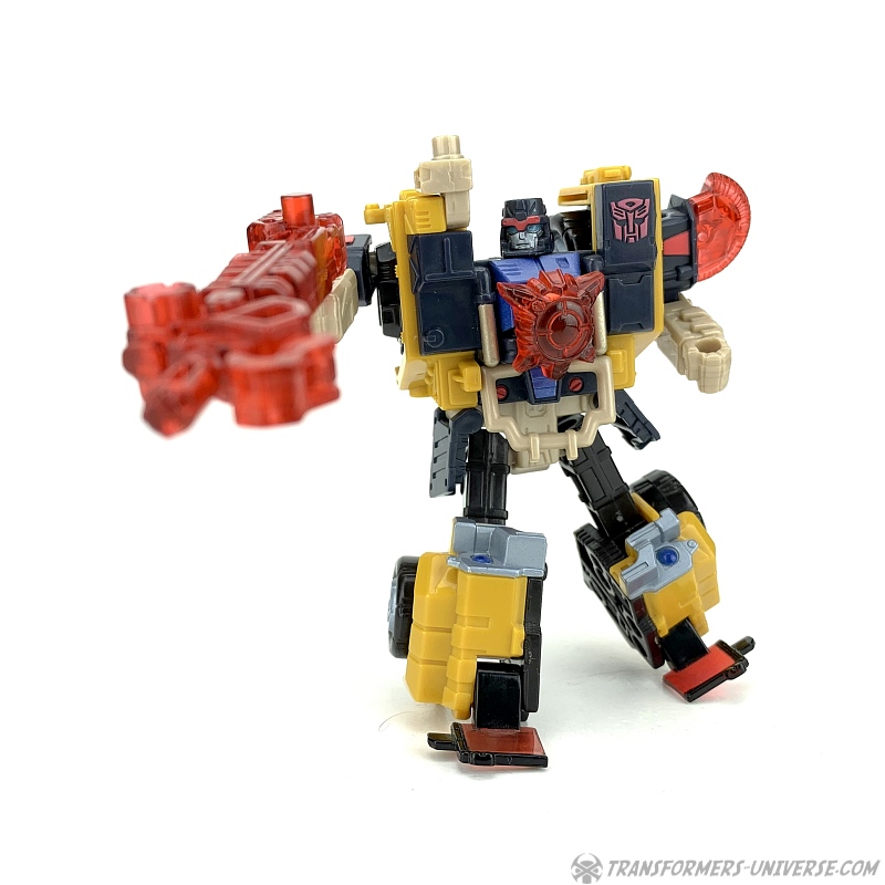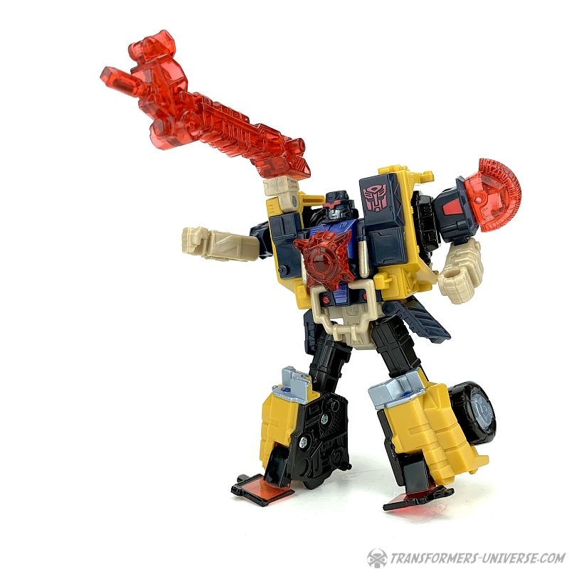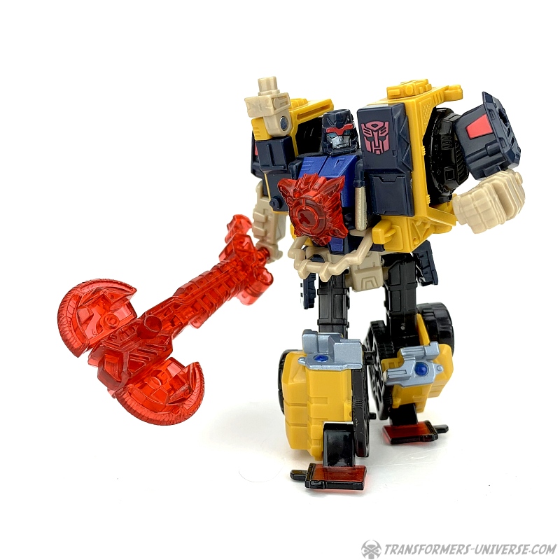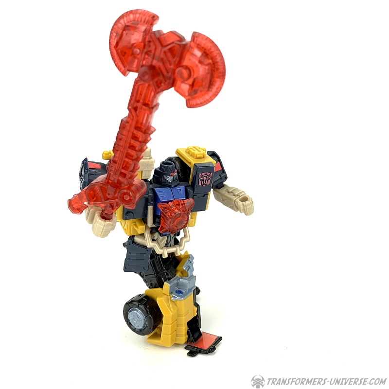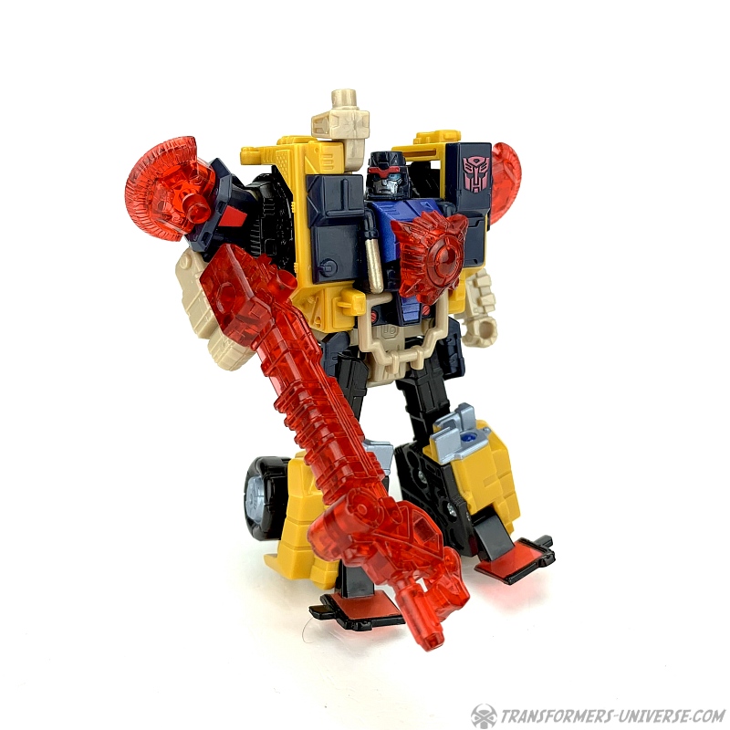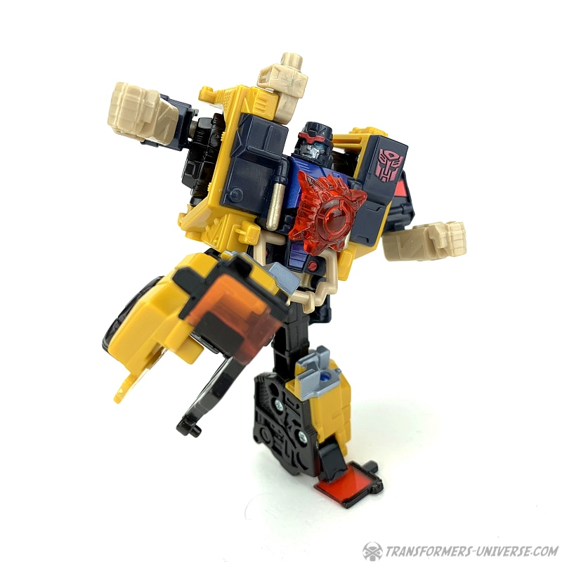 Außerdem hat er seine sehr coole Energon-Waffe dabei. Ein Kran / Gewehr, dass er in der Hand halten oder auf der Schulter montieren kann, verbindet sich mit zwei Hälften einer Energon-Scheibe zu einer mächtigen Streitaxt. Dank seiner tollen Beweglichkeit kann Strongarm diese in allen möglichen coolen Kampfposen führen. Sehr schön gemacht. Als Omnicon hat er außerdem einen roten Energonstern dabei, den er sich auf die Brust stecken kann. Unterm Strich somit: ein toller Robotermodus mit nur ganz wenig Punktabzug für die nicht hundertprozentig stabilen Füße.