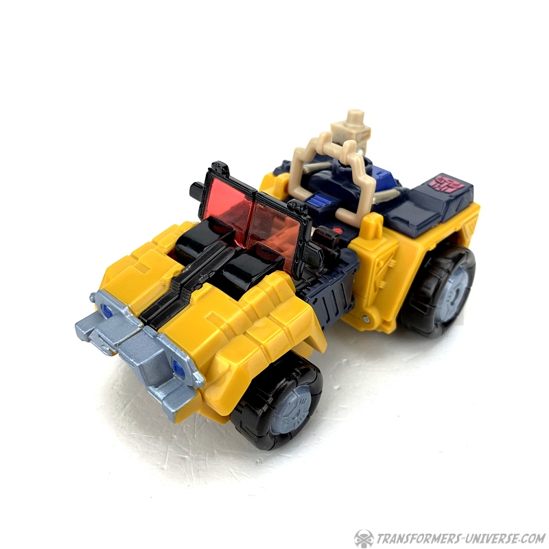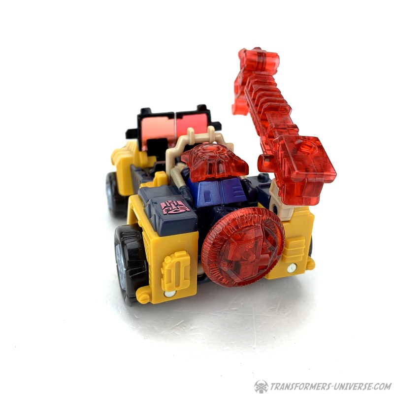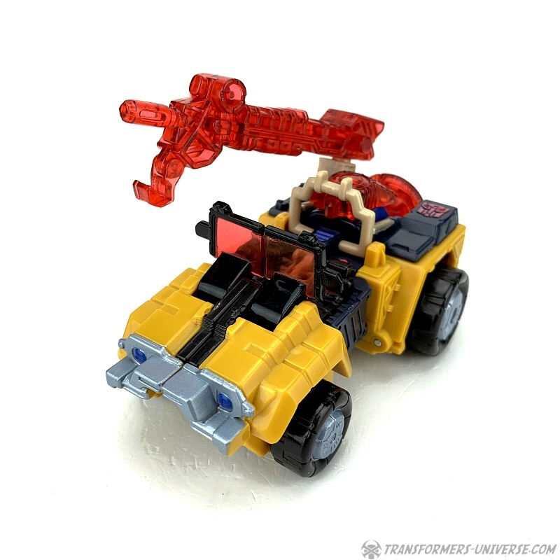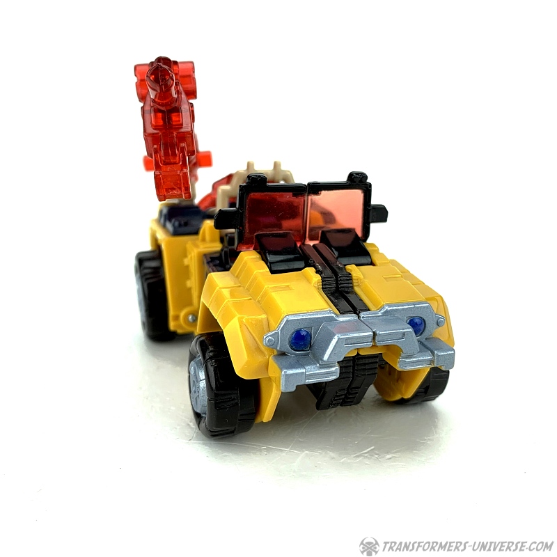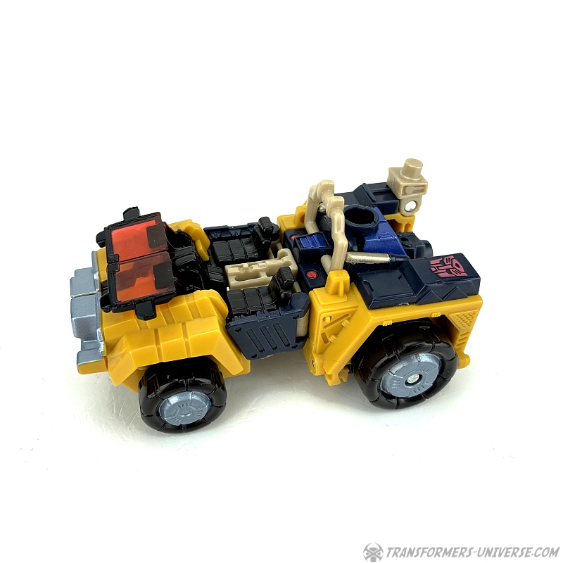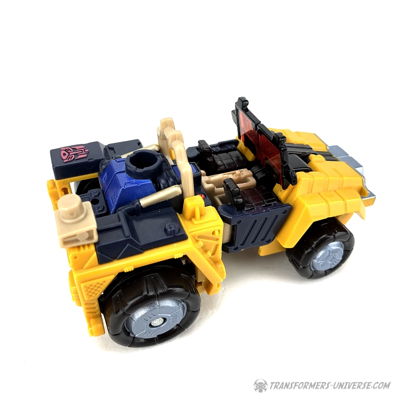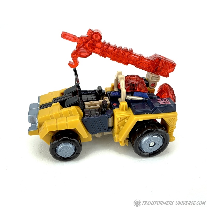 Alternativmodus: Strongarm verwandelt sich in einen futuristischen Jeep mit offener Fahrerkabine. Alles fügt sich gut zusammen und selbst von unten sieht man kaum was vom Robotermodus (nur die Hände). Die Windschutzscheibe kann umgeklappt werden, im Inneren sieht man zwei Sitze, und die Energonwaffe kann ebenfalls montiert werden. Die Energon-Scheibe kommt als Reserverad hinten dran, das Gewehr / der Kran oben drauf, und auch der Energonstern kann oben drauf, wobei er dort allerdings sich ein wenig an dem Überrollbügel stört.