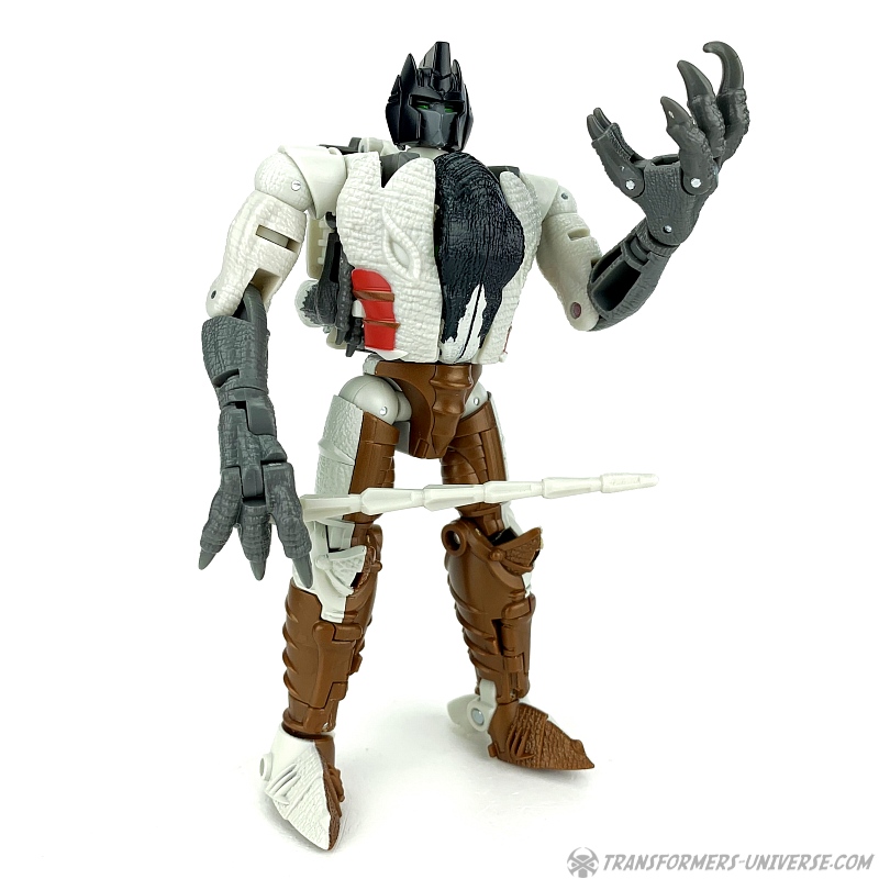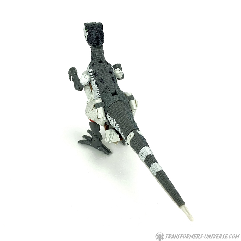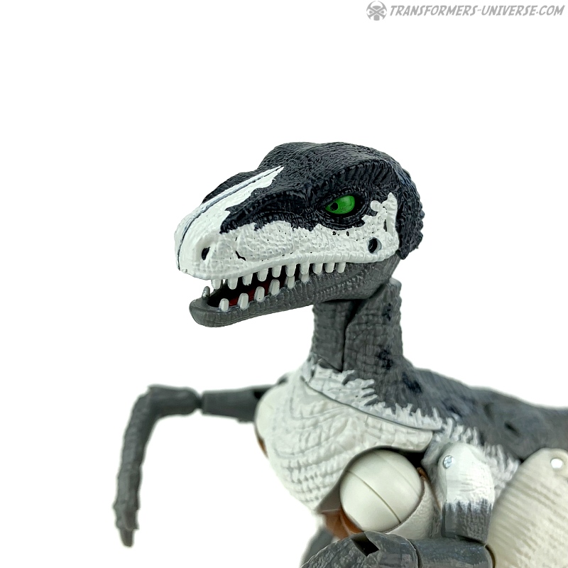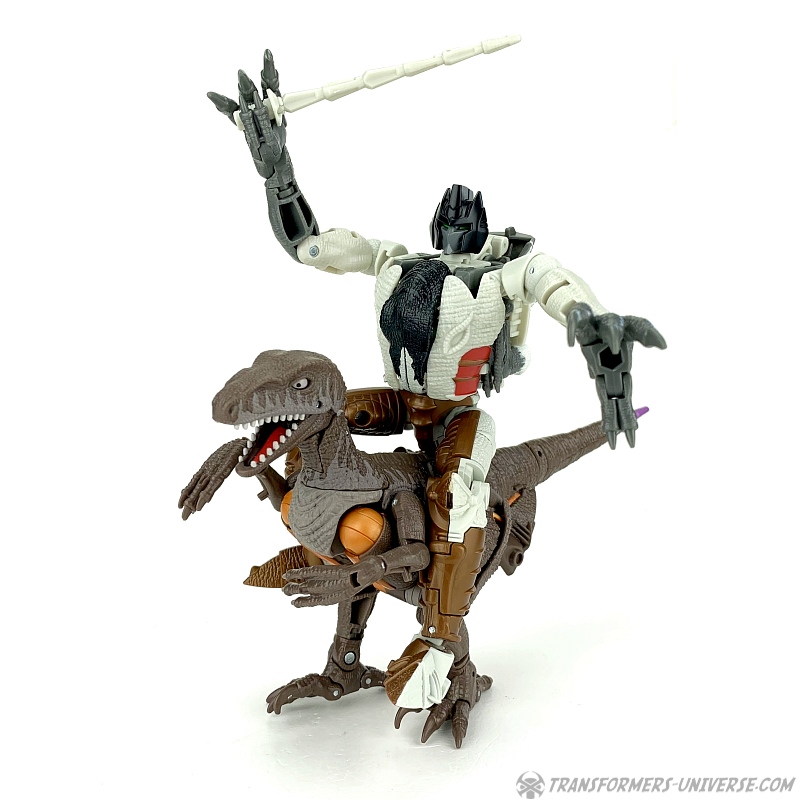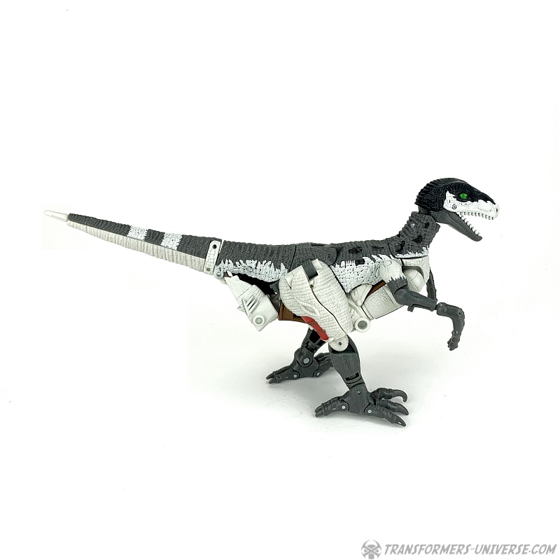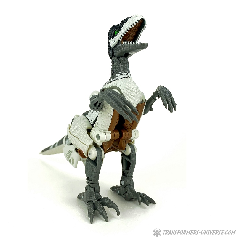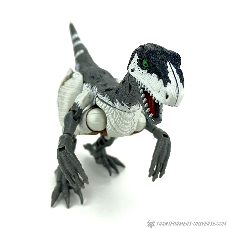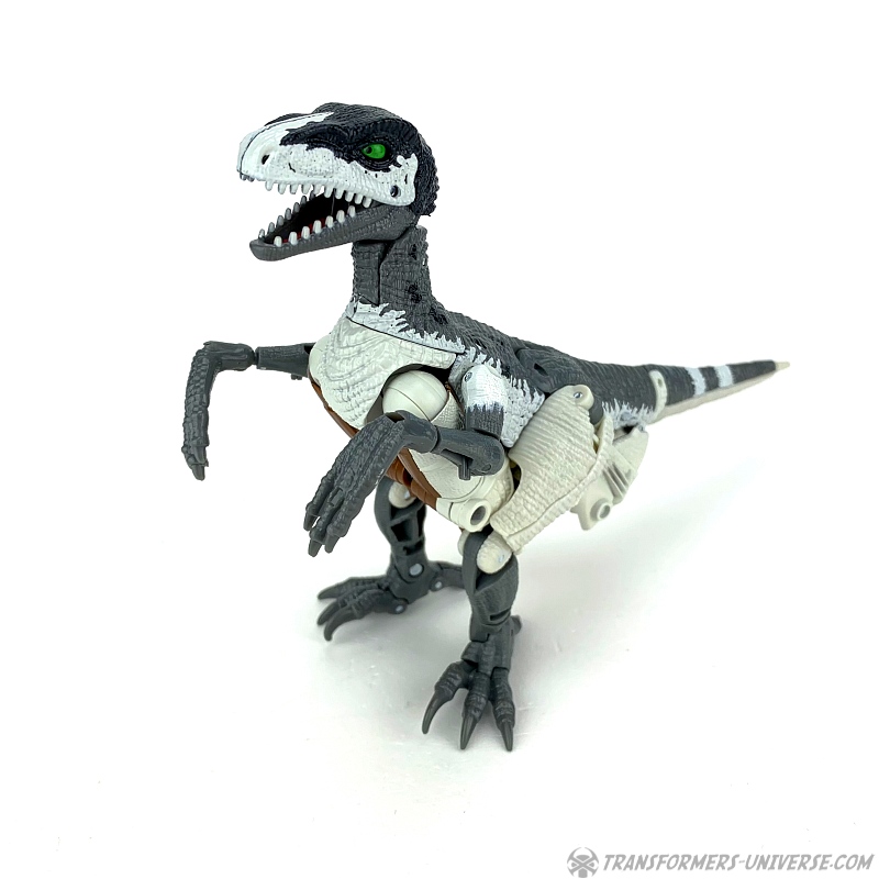 Alternativmodus: Natürlich wird auch Grimlock zu einem Velociraptor, hier keine Änderungen außer die Farben. Der originale Beast Wars Grimlock war hier größtenteils weiß mit schwarzen Dalmatiner-Flecken auf dem Rücken. Hier weicht Kingdom Grimlock doch um einiges ab. Er ist zwar weiß an den Flanken und am Bauch, aber sein Rücken und die Unterschenkel sind grau, während der Kopf oben schwarz ist. Keine Ahnung welche Farbwahl jetzt die schrägere ist, um ehrlich zu sein.