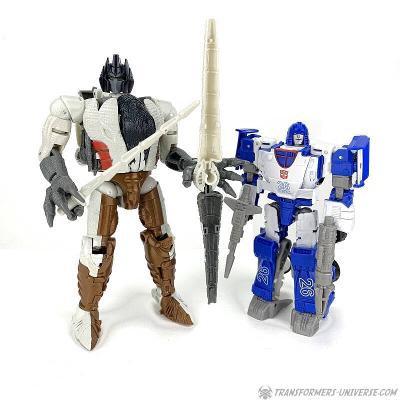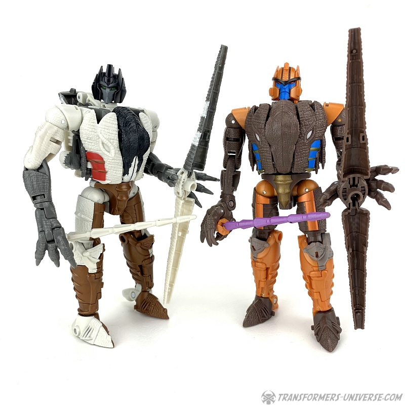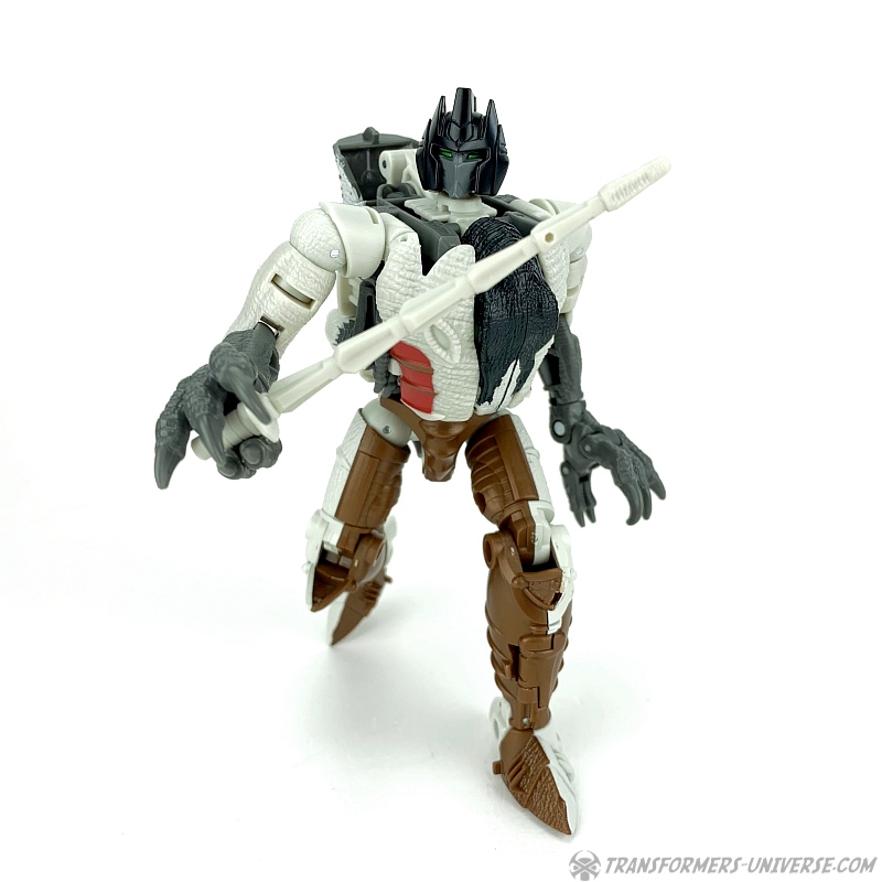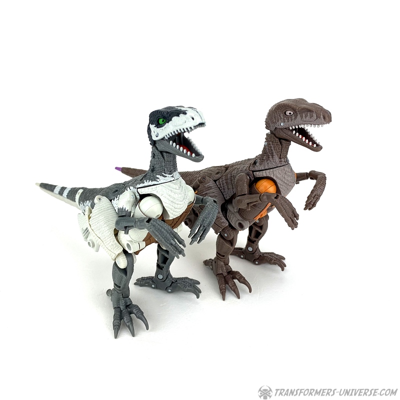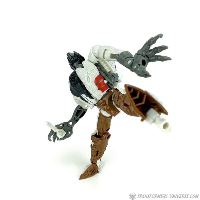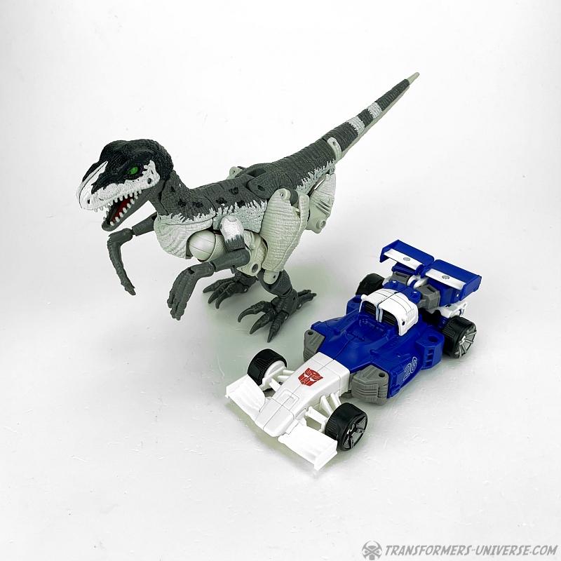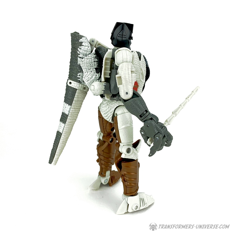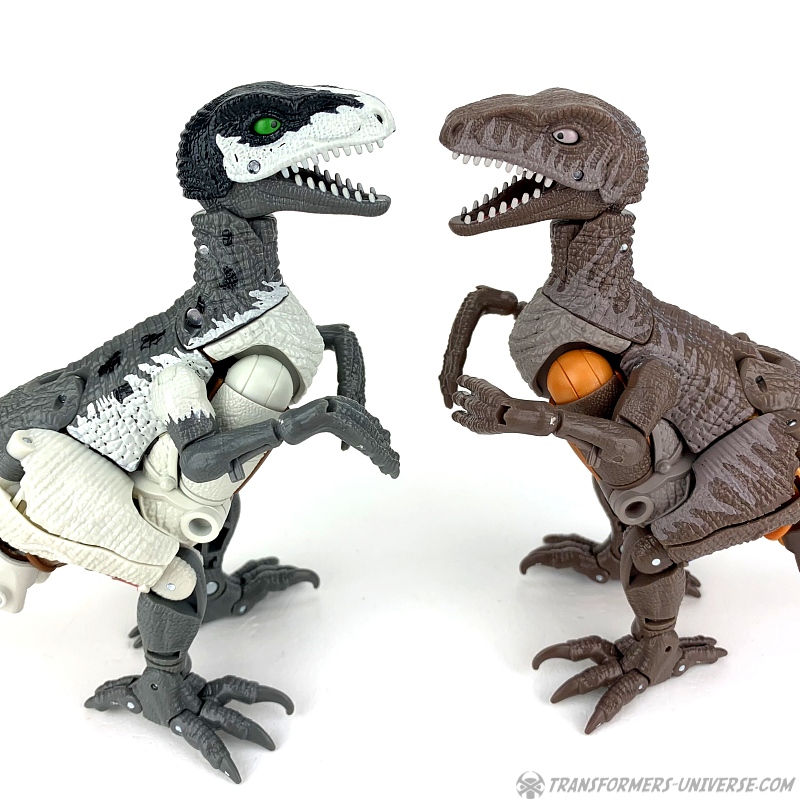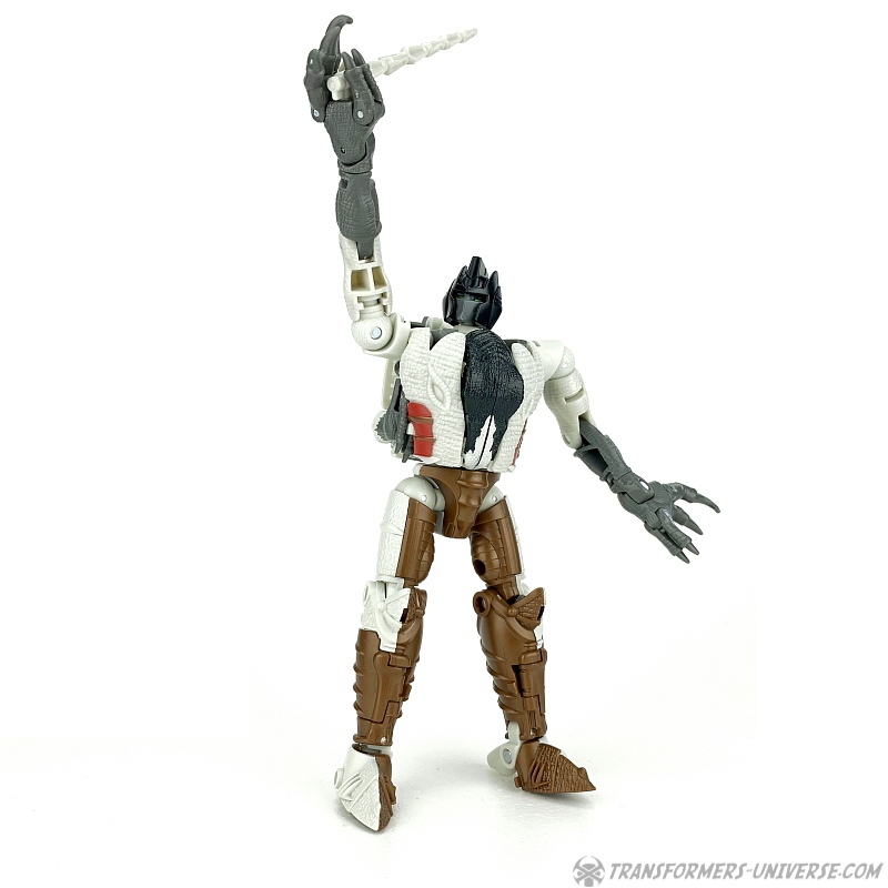 Alternativmodus: Natürlich wird auch Grimlock zu einem Velociraptor, hier keine Änderungen außer die Farben. Der originale Beast Wars Grimlock war hier größtenteils weiß mit schwarzen Dalmatiner-Flecken auf dem Rücken. Hier weicht Kingdom Grimlock doch um einiges ab. Er ist zwar weiß an den Flanken und am Bauch, aber sein Rücken und die Unterschenkel sind grau, während der Kopf oben schwarz ist. Keine Ahnung welche Farbwahl jetzt die schrägere ist, um ehrlich zu sein.