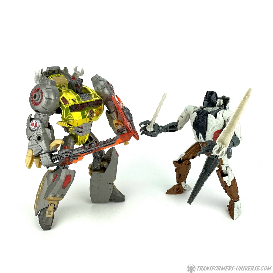 Bemerkungen: Grimlock war in der Beast Wars TV Serie nicht dabei. Er war nur in der Spielzeugreihe vertreten (und „nur“ ein Repaint noch dazu) und ob er jetzt wirklich der G1 Dinobot Anführer sein sollte oder nicht, darüber wurde gerne und heftig diskutiert. Obwohl es der Profiltext der Originalfigur eigentlich ziemlich deutlich macht, aber so sind Fans halt. IDW Comics haben es dann endgültig offiziell gemacht mit ihrem Beast Wars Sourcebook und den beiden IDW Beast Wars Miniserien. Und da wir ja in der Kingdom Reihe eine tolle Dinobot Figur bekamen, ist es jetzt nicht so überraschend, dass wir ein Grimlock Repaint davon kriegen, auch wenn es nur in einem Doppelpack mit einer G1 Figur ist. Auf das Hardhead Repaint warte ich allerdings noch.