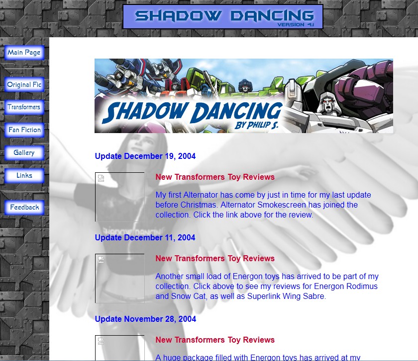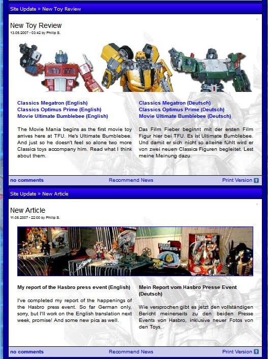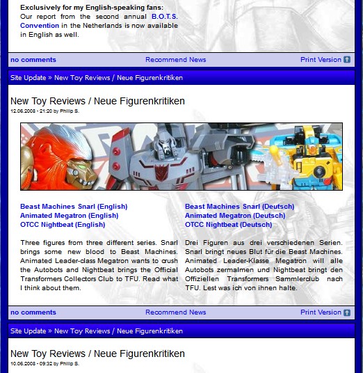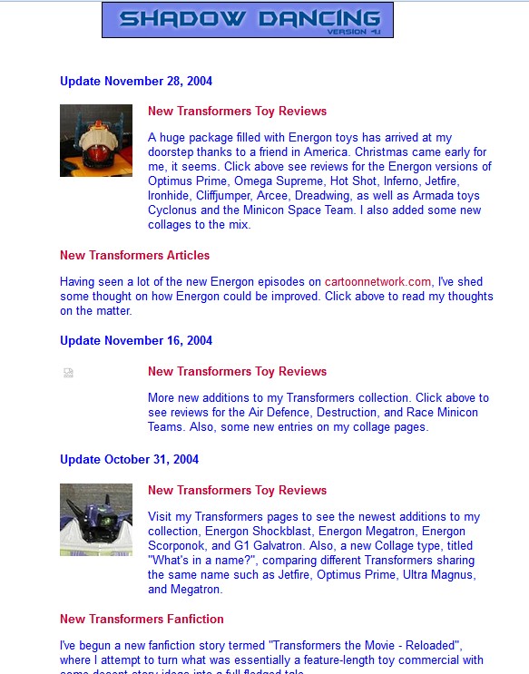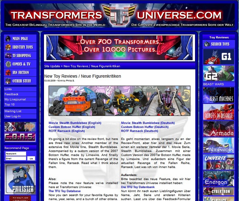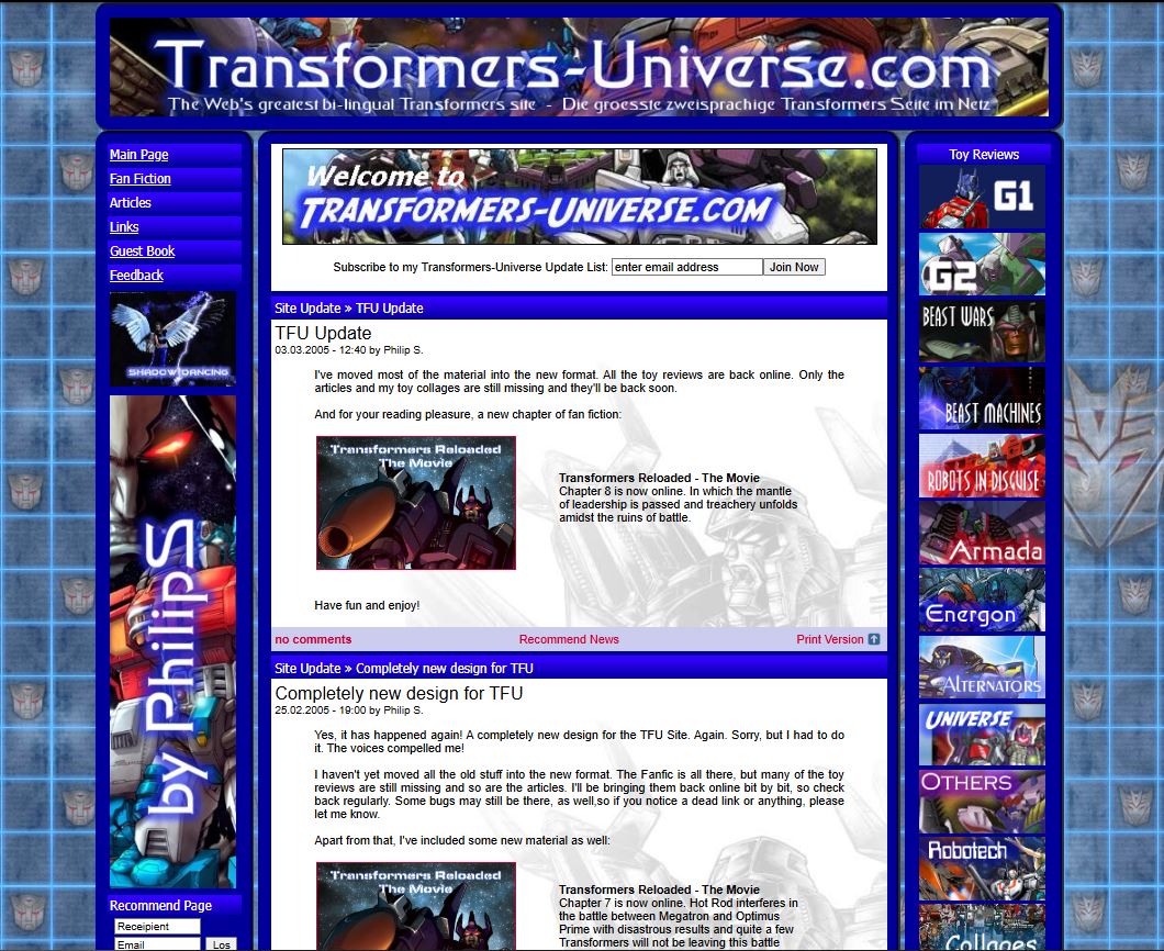 That wasn't the beginning of my writing and publishing of toy reviews, of course. I had done a bit of that back in 2004 already, just some hand-coded HTML pages with a few pretty bad pictures of my recently acquired toys (mostly G1 and Armada at the time). The whole thing quickly grew in size, though, so I registered the domain in early 2005 and published my first website entirely dedicated to the Transformers in late February, using a PHP-based CMS that wasn't entirely brand-new even back then.