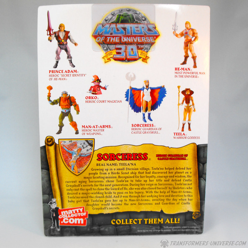 Growing up in a small Eternian village, Teela’na helped defend her people from a Horde Scout ship that had discovered her planet on a magic locating mission. Recognized for her loyalty, courage and wisdom, the current Sorceress chose Teela’na to take up her title and defend Castle Grayskull’s secrets for the next generation. During her reign as Sorceress, Teela’na not only cast the spell to clone the Sword of He, she was cloned herself by Skeletor who desired a magic wielding bride to pass on his legacy. With the help of Man-At-Arms, Teela’na saved the cloned child. And it was through her undying love and devotion to this baby girl that Teela’na gave her up to Man-At-Arms, awaiting the day where her daughter would become the new Sorceress and Guardian of Castle Grayskull’s secrets.