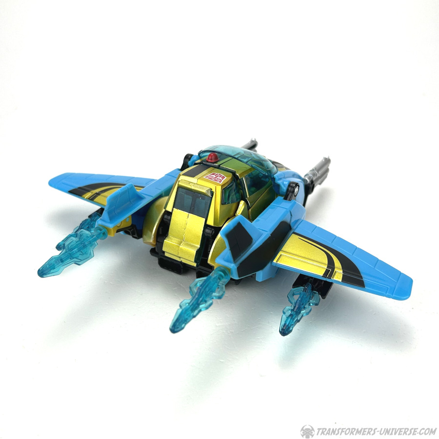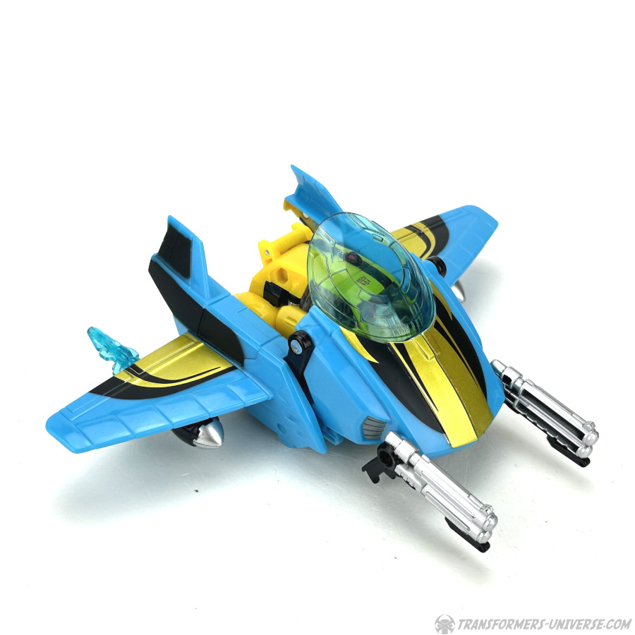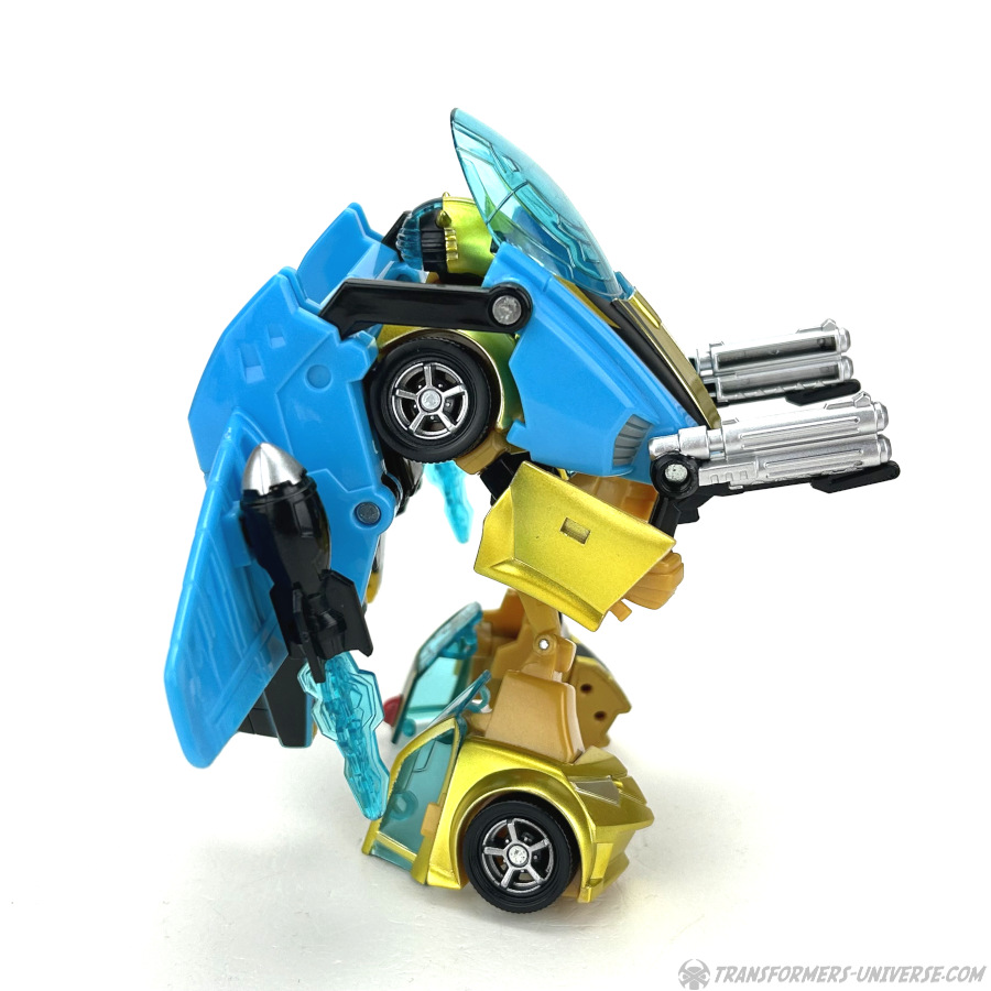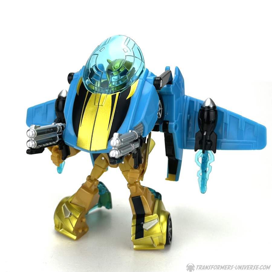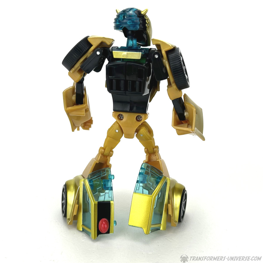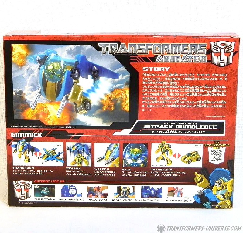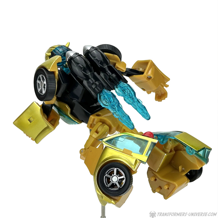Remarks: Transformers Animated ended far too soon, which not only means we were deprived of some great stories, but a lot of toys never saw the light of day, either. Thankfully a few of those toys were released by Takara in Japan, including Blackout, Wingblade Optimus Prime, and this little fellow here. Now we never saw Bumblebee wearing anything like this jetpack in the Animated cartoon, but maybe he would have appeared this way in the never-produced season 4, who knows? A Hasbro release was apparently intended for this toy at some point under the name “Hydrodrive Bumblebee”, but it never came to pass.