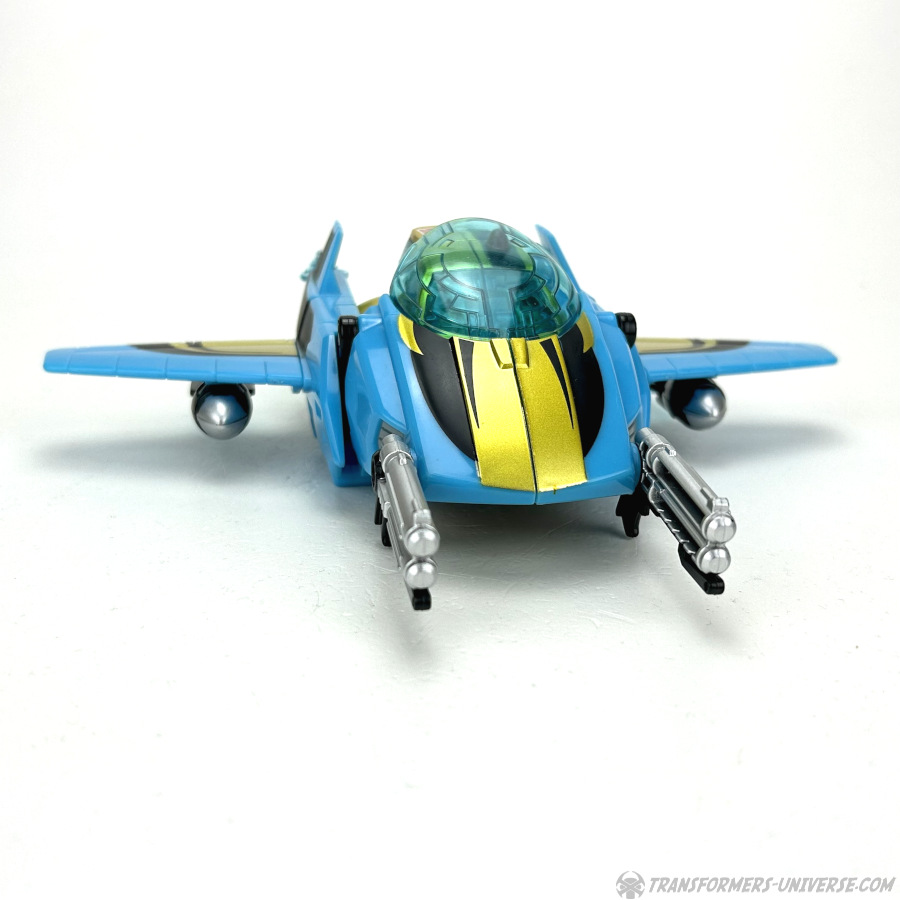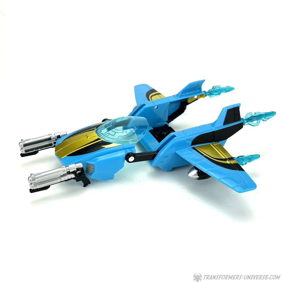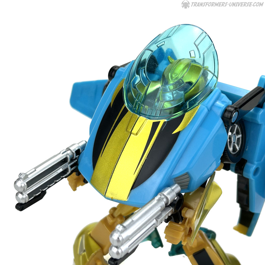 Jetpack: The main attraction of this set is, of course, the Jetpack that provides the prefix for the name. It’s basically a blue frame with a set of wings and a cockpit with guns attached to the front, which can swing up and forward on two black struts. Bumblebee can wear the Jetpack in both of his modes. In robot mode it attaches to his back and the cockpit part with the gun flips forward over his head, providing him with both armor and a set of guns he can (almost) hold in in his hands. The guns do not detach, by the way. The rocket boosters are on the wings now instead of on his back and you can easily imagine Bee zooming through the sky with this thing.
