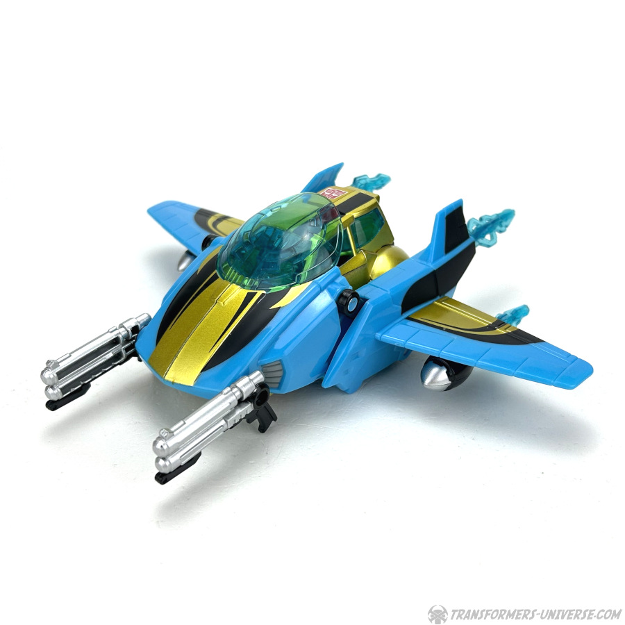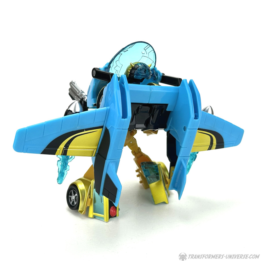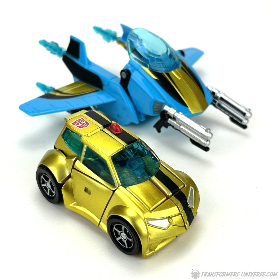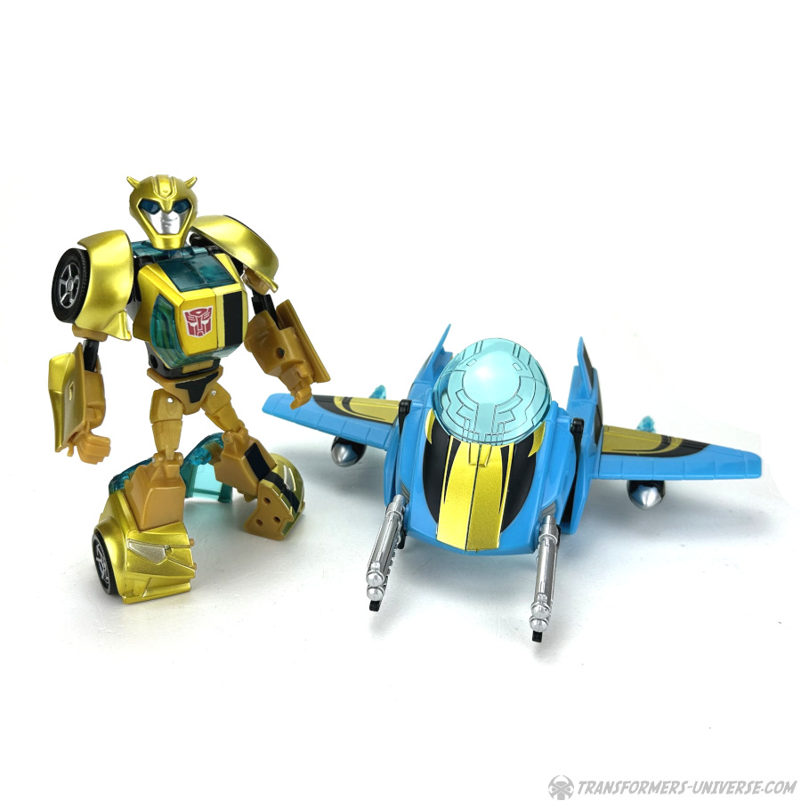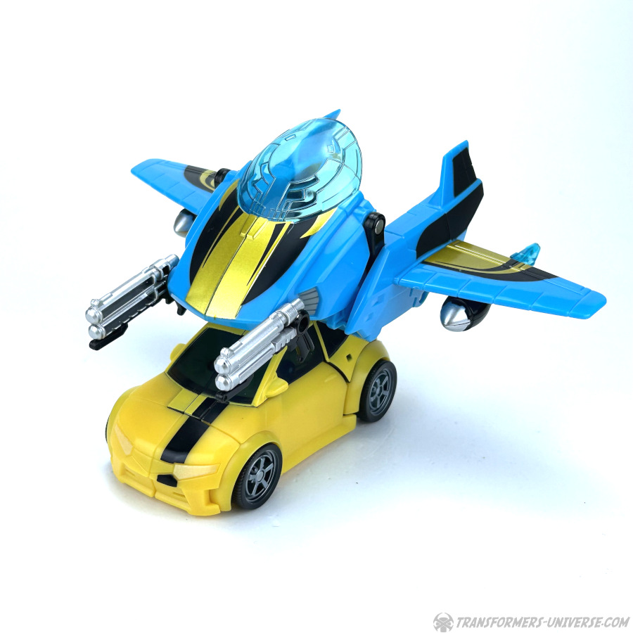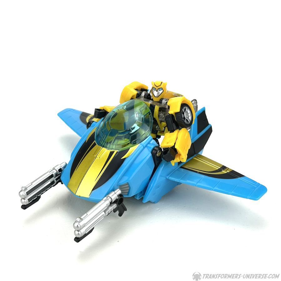 The jetpack also works in vehicle mode. Bumblebee in car form basically just drives into the frame from the back and the car’s underside attaches to it. Now it looks like a miniature plane with a car inside it, but again: you can easily imagine Bee driving the sky roads in this form. Nicely done. Interesting note: Legacy Animated Bumblebee, who is a good deal smaller than the included Bumblebee figure, can also use this jetpack. It doesn’t solidly attach, naturally, but he fits inside in both robot and car mode. Animated Deluxe Bee however is a tad too big, so he can either stand on top of it in robot mode or balance it on his roof in car mode.