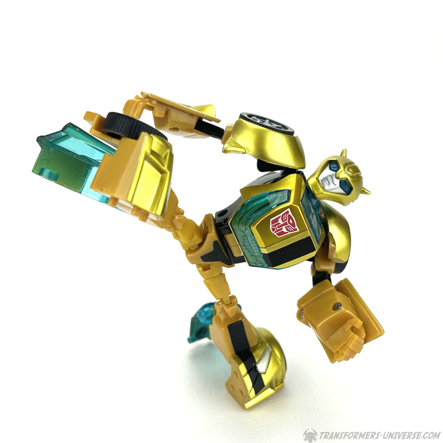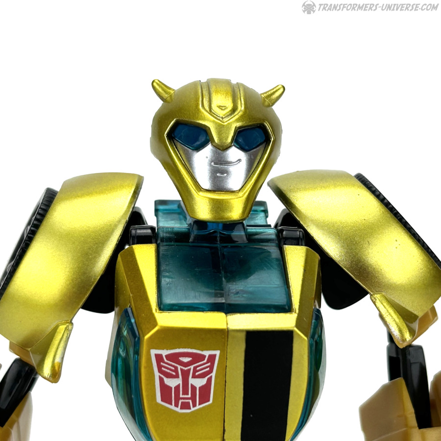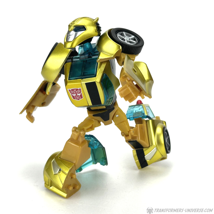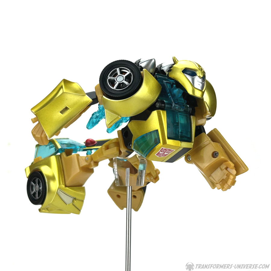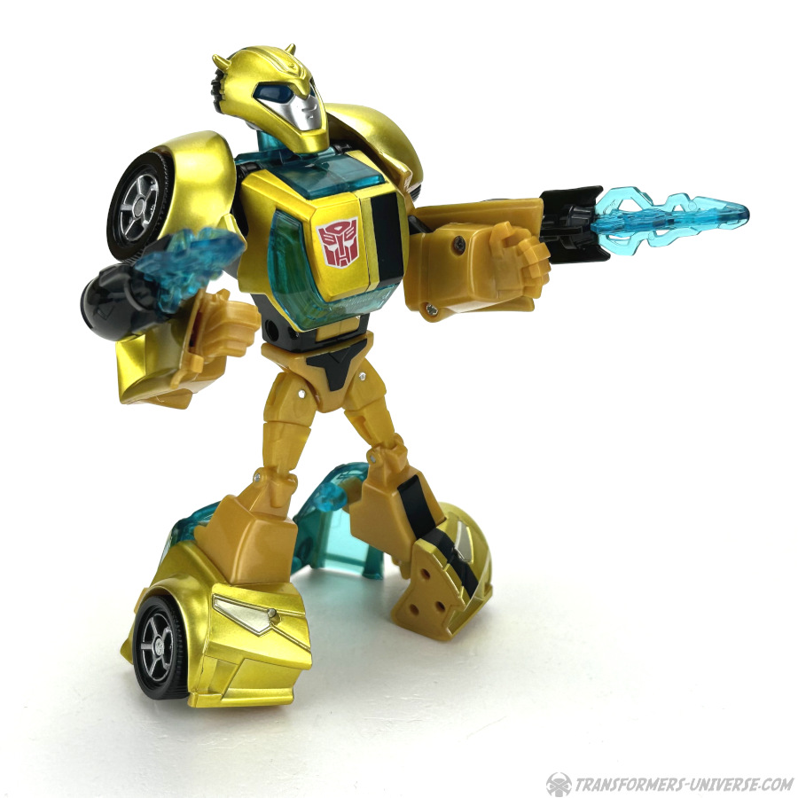Robot Mode: We have had several Animated figures that were reissued with additional upgrade pieces, but unlike Wingblade Optimus Prime or Samurai Prowl, the Bumblebee figure in this set here is an entirely new figure, entirely different from Deluxe Bumblebee. This new Bumblebee figure is smaller than the Deluxe, yet larger than the Activator, roughly the size of a present day Deluxe. Like most of the Takara-Tomy Animated figures, he has a very shiny finish on all of his car parts, which… let’s just say I could have done without that. The look is pure Animated Bumblebee, though, and in terms of proportions this guy here might actually be the best version of the character. He is very nicely articulated, including a twisting hip, ankle tilt, and a ball-jointed head.