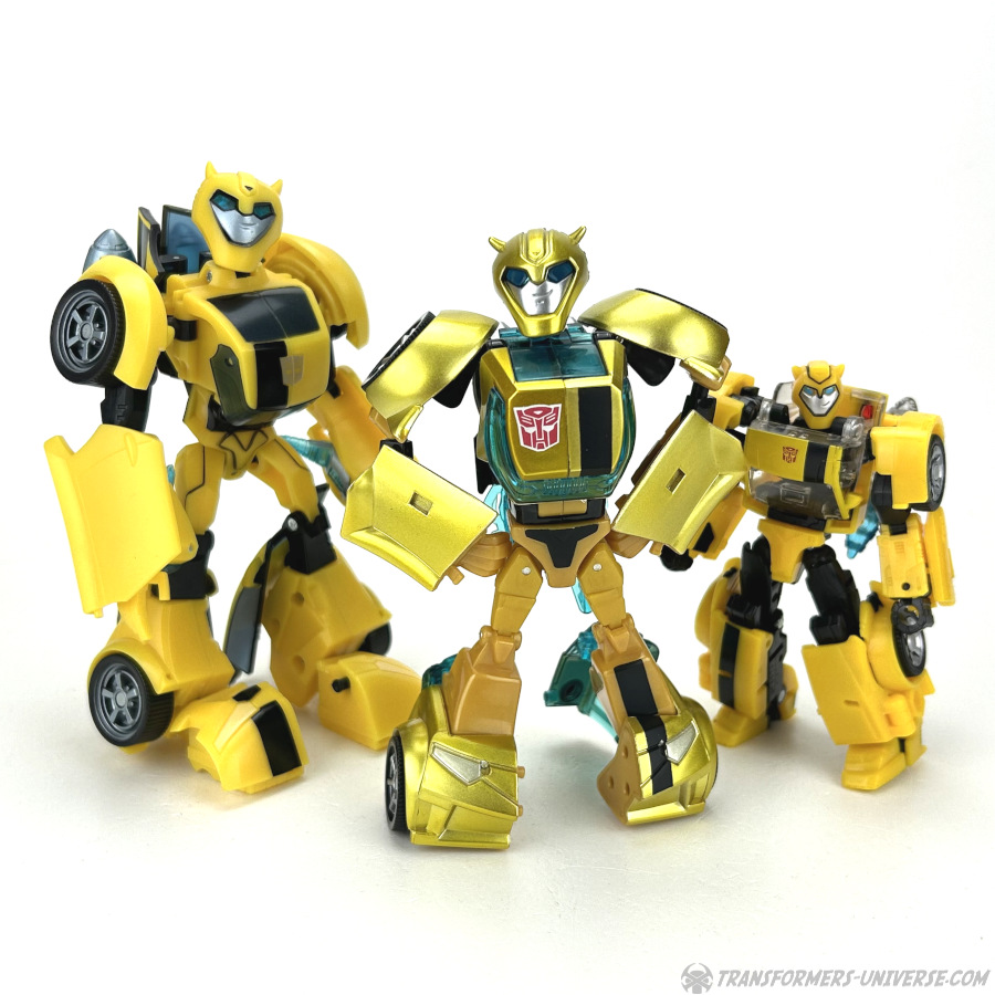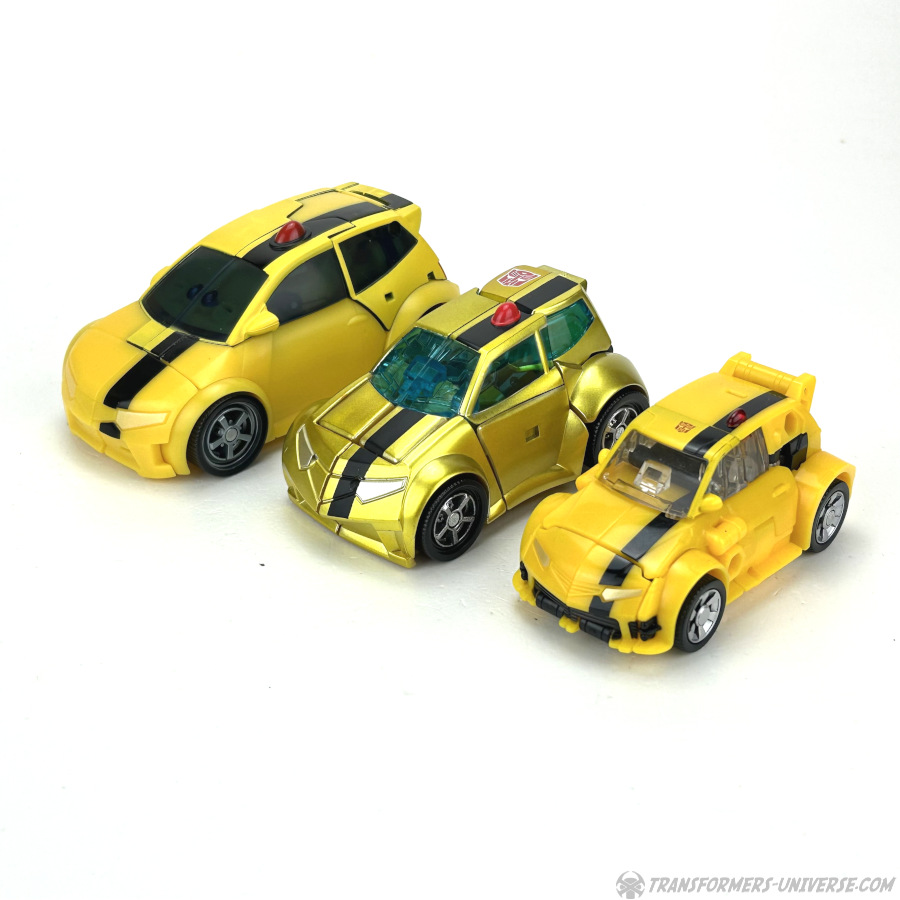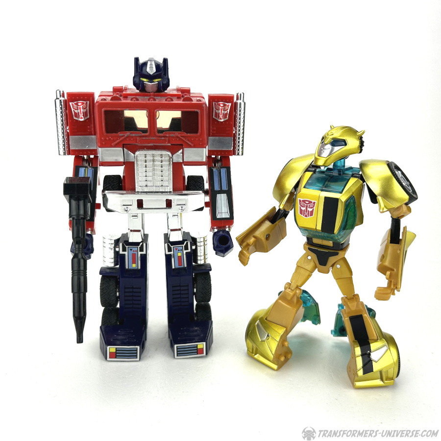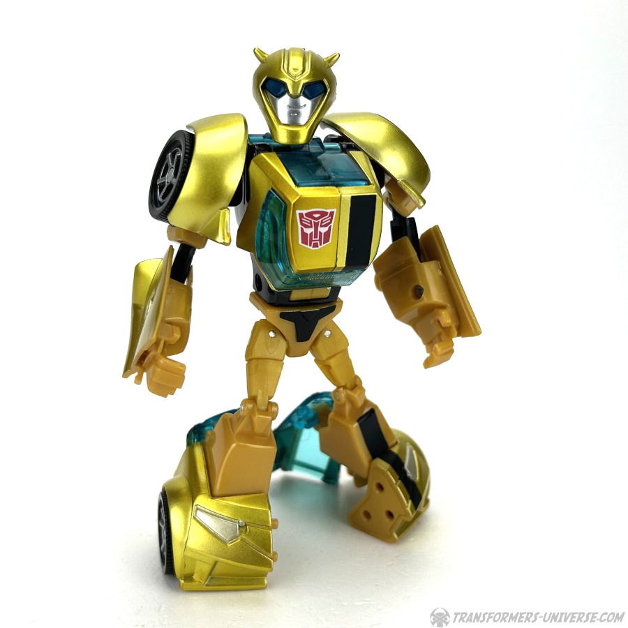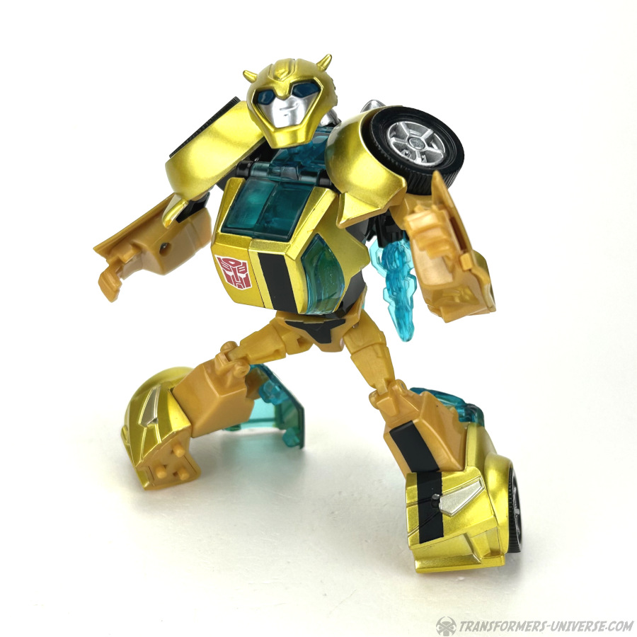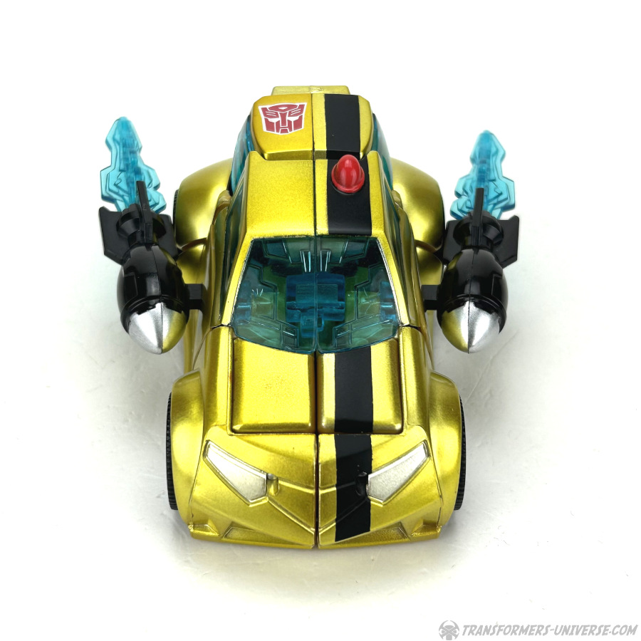 Robot Mode: We have had several Animated figures that were reissued with additional upgrade pieces, but unlike Wingblade Optimus Prime or Samurai Prowl, the Bumblebee figure in this set here is an entirely new figure, entirely different from Deluxe Bumblebee. This new Bumblebee figure is smaller than the Deluxe, yet larger than the Activator, roughly the size of a present day Deluxe. Like most of the Takara-Tomy Animated figures, he has a very shiny finish on all of his car parts, which… let’s just say I could have done without that. The look is pure Animated Bumblebee, though, and in terms of proportions this guy here might actually be the best version of the character. He is very nicely articulated, including a twisting hip, ankle tilt, and a ball-jointed head.