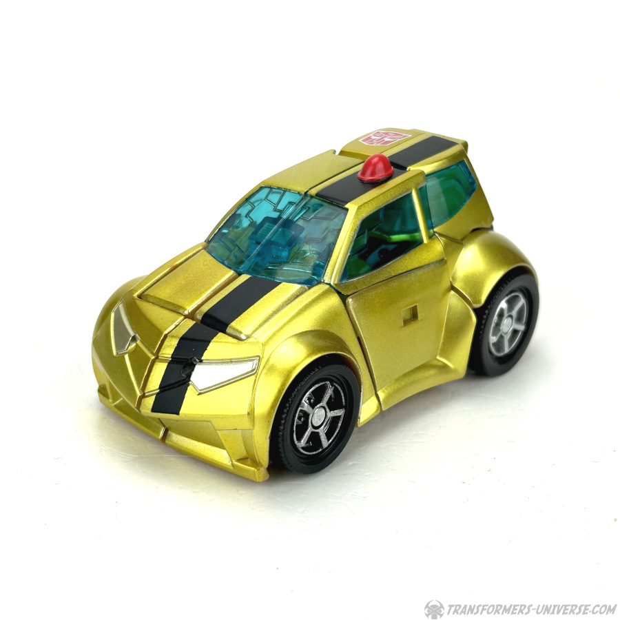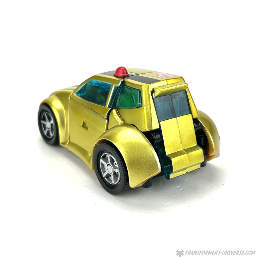 Alternate Mode: Bumblebee unsurprisingly transforms into the same slightly deformed looking compact car he always does, complete with black stripe and police siren on top. The transformation is pretty straight-forward and the resulting car shows no visible robot bits. Again, a very shiny finish, but that’s just standard for the Takara Animated figures. The only real difference to Deluxe Bee’s car mode is that you cannot attach the rocket boosters to the back of the car mode. They can clip into the doors, but due to the non-removable flame effects, they always stand at a slight angle where the flame part collides with the rear rims. Apart from that, though, a very nice little car mode. No complaints.