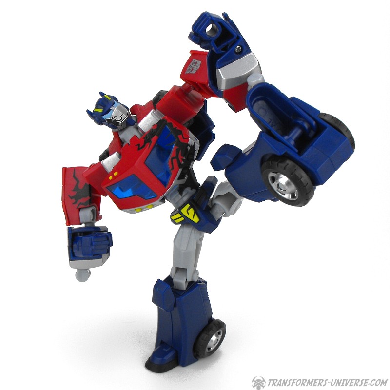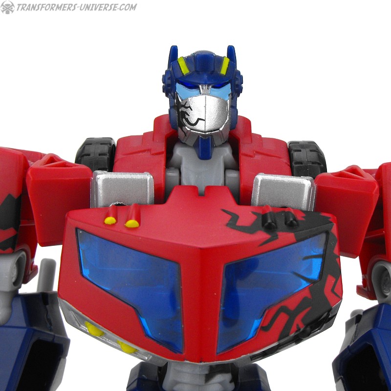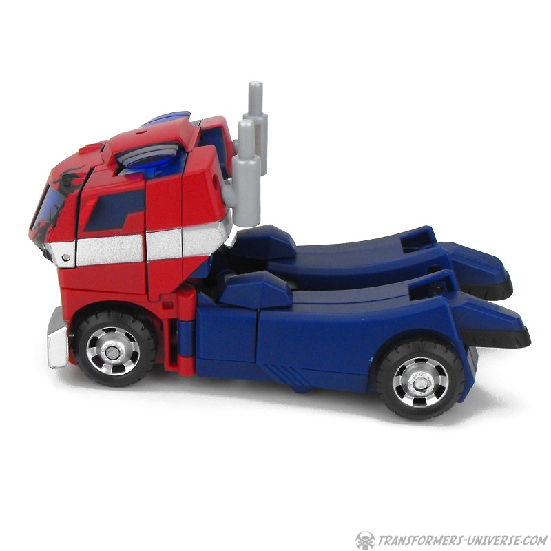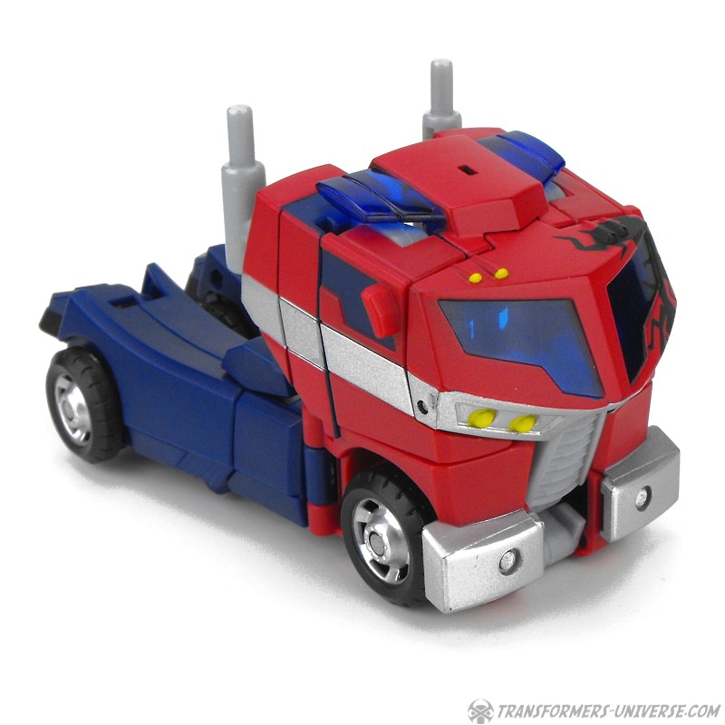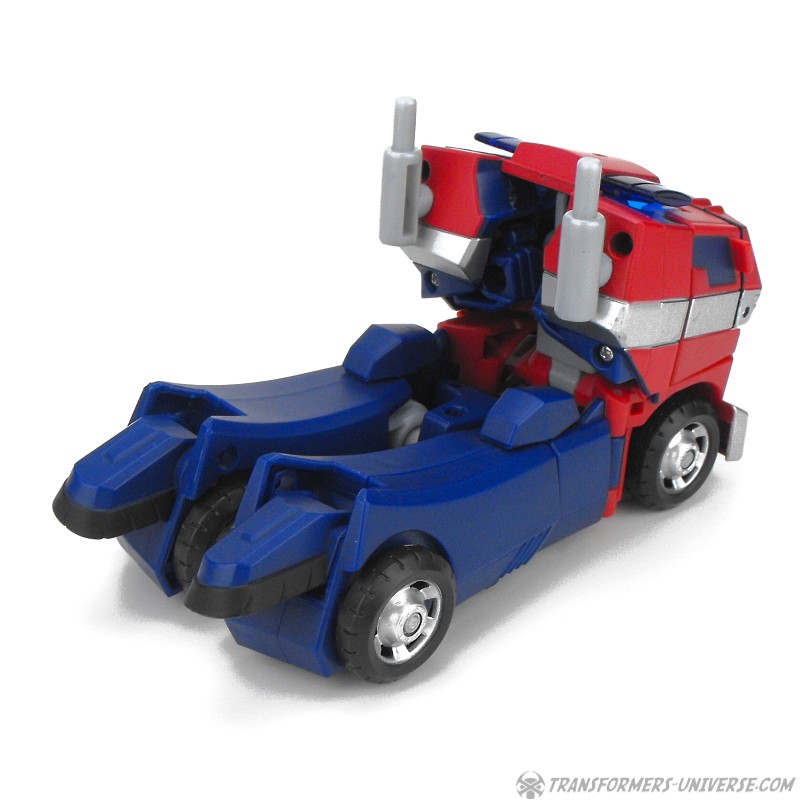 Alternate Mode: Big surprise, Optimus transforms into a truck. Not just any truck, though, a fire truck. Though that is evident solely by the lights on top of his driver's cab, which replace the removable roof/shield that Cybertron Mode Prime sported. Apart from that, though, there is only very little difference in the two truck modes. This is an Earth truck, of course, so it has the divided windshield and tires instead of tank threads.