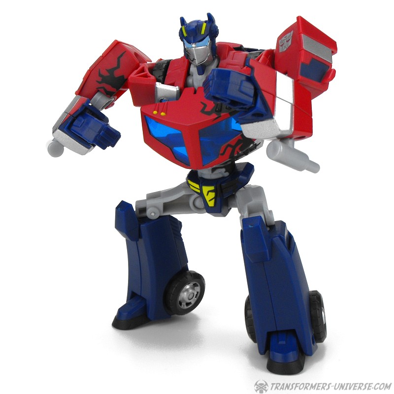 Robot Mode: This Deluxe version of the Animated Autobot leader is very similar, both in look and in design, to the other Deluxe Prime, Cybertron Mode Optimus Prime. This is Prime in his Earth Mode, though, so he has the usual divided windshield as a chest and wheels on his legs instead of tank threads. Also, his arms are a lot boxier in this version, as they form the sides of the driver's cab for the alternate mode. The smokestacks are on his forearms here and can be twisted around to function as guns, if you fancy that. Finally, his head's been changed a bit, as he has the Prime-typical mouthguard here. Interestingly enough, while I'm not usually a fan of Primes with mouths, I do prefer Animated Prime without the mouthguard. Go figure.