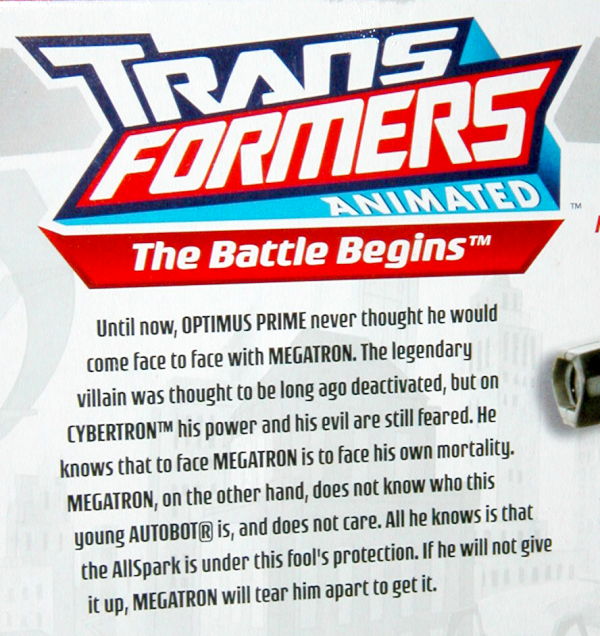 Until now, Optimus Prime never thought he would come face to face with Megatron. The legendary villain was thought to be long deactivated, but on Cybertron his power and his evil are still feared. He knows that to face Megatron is to face his own mortality. Megatron on the other hand does not know who this young Autobot is, and does not care. All he knows is that the Allspark is under this fool's protection. If he will not give it up, Megatron will tear him apart to get it.