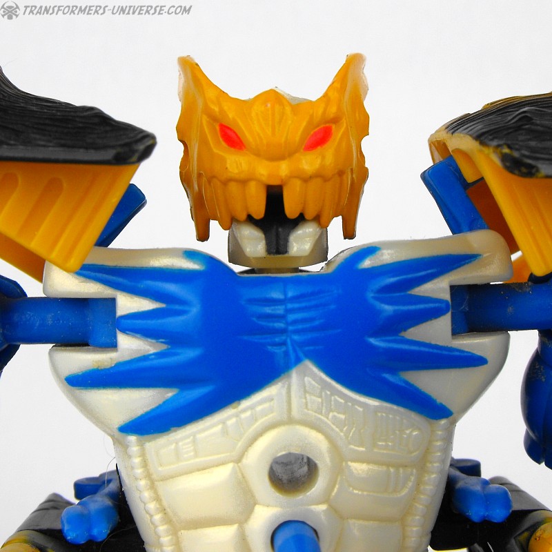 Robot Mode: K-9 might actually be the first robot from the early Beast Wars waves where I like the 'mutant head' gimmick. He slides an organic-looking visor over his normal head and it looks cool. Anyway, K-9 is a decent, if unspectacular robot with nice colouring and details, but some engineering problems. His posability is good, if somewhat hampered by the dog head halves on his shoulders, which clash with the dog front legs on his upper arms. K-9 can use the back of his beast mode as a shield and the dog tail as a gun, the missiles for which he stores in his upper body. All in all a decent mode with some minor problems.