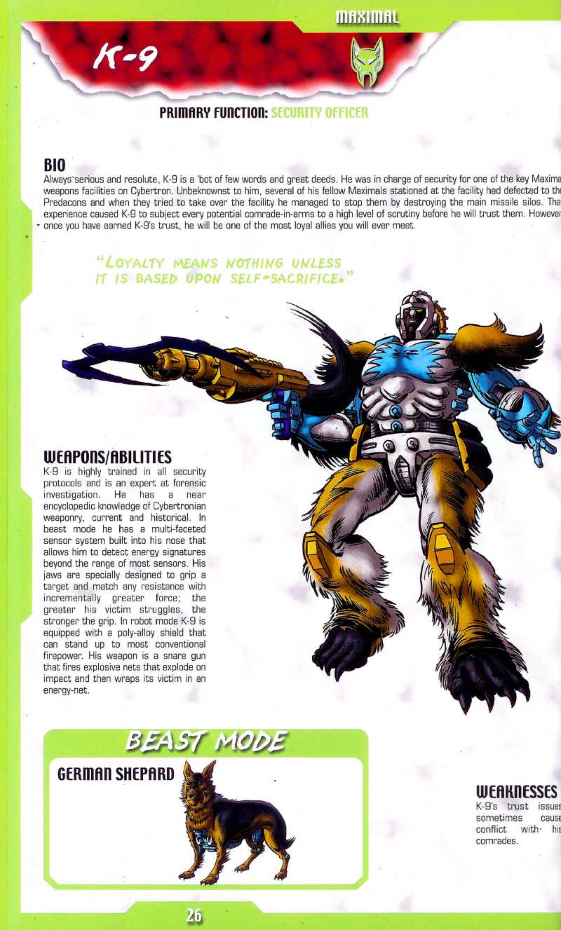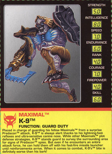 Placed in charge of guarding his fellow Maximals from a surprise Predacon attack, K-9 is always alert thanks to his lightning-fast reflexes and ultra-sensitive canine nose. While other Maximals plot defense strategies, K-9 stands guard to survey the surrounding area for signs of Predacon spies. But even if he encounters an entire attack force, he can hold them off with his fast-fire missile launcher until reinforcements arrive. When it comes to combat, K-9's bite is definitely worse than his bark!