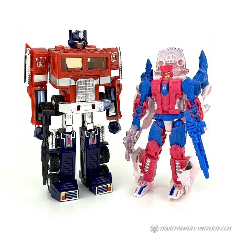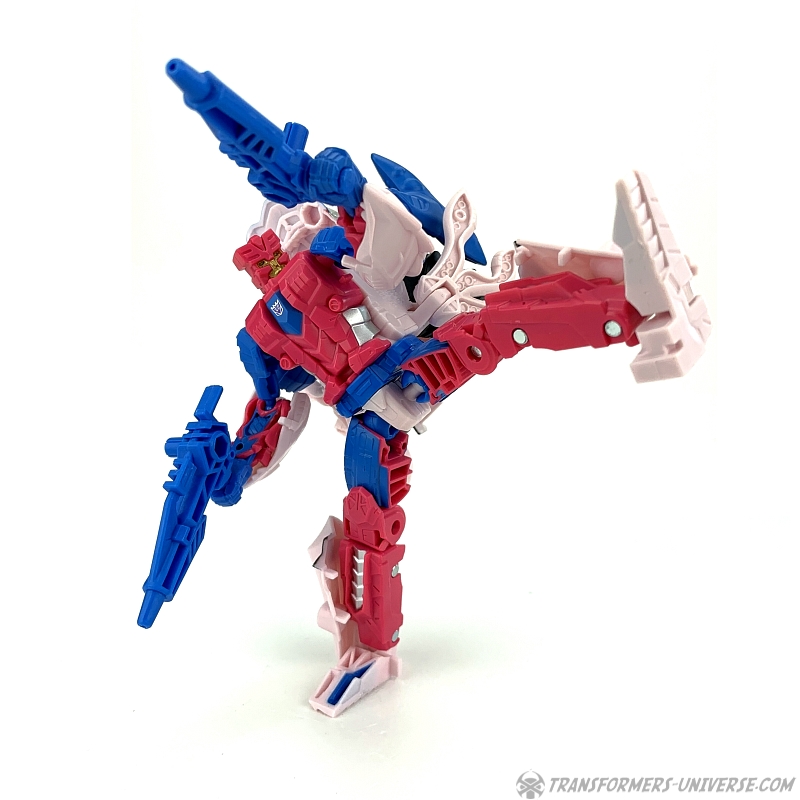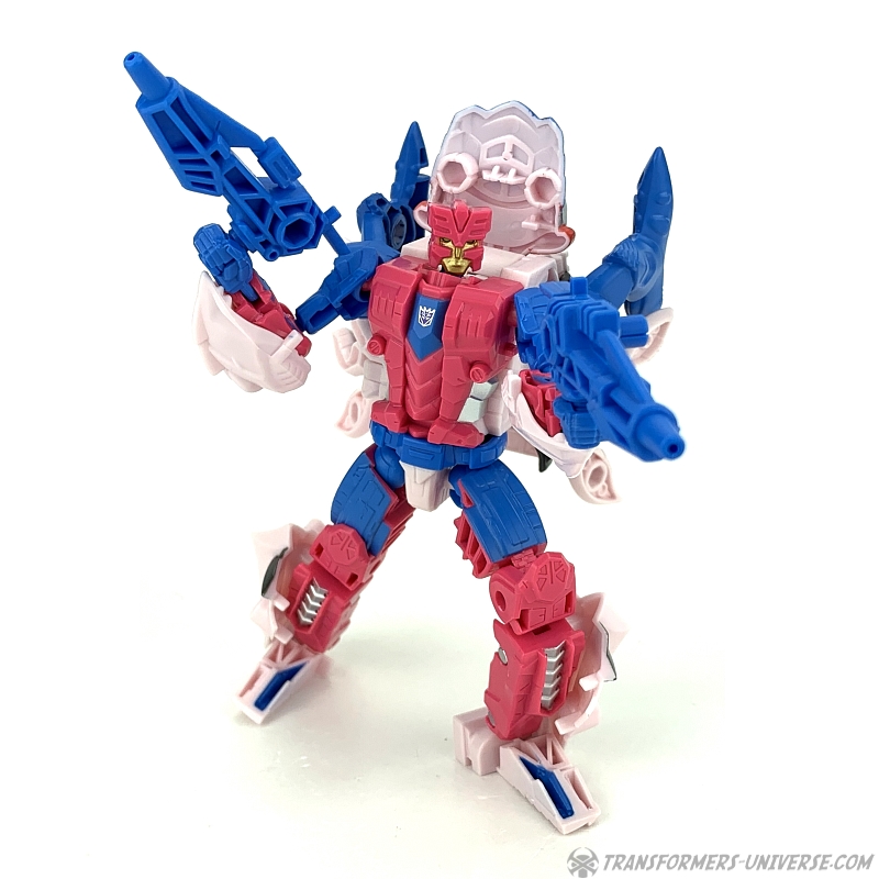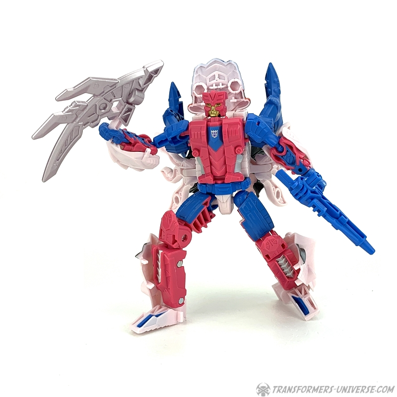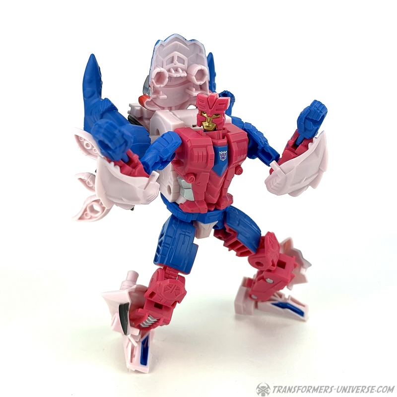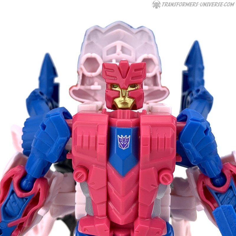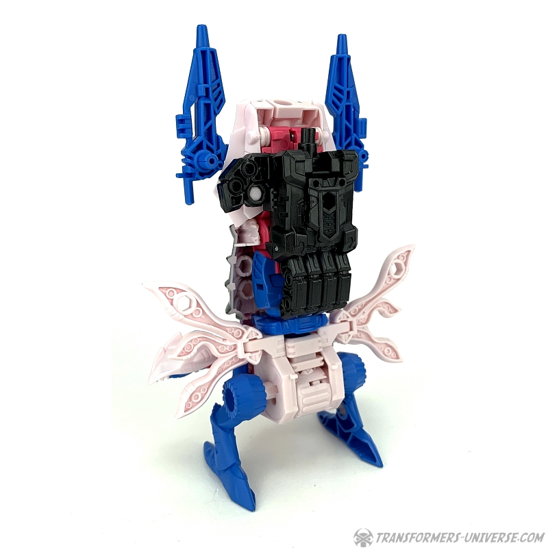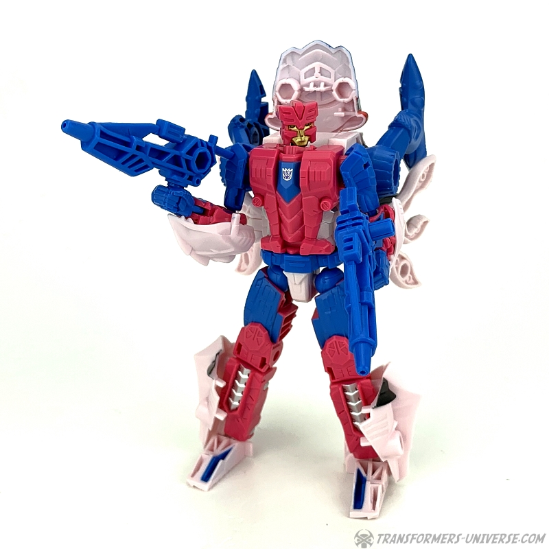 Tentakil is a lean, very nicely articulated robot in salmon-red, blue, and light pink (mostly the kibble). He’s got a golden face and it’s pretty hard to tell what he transforms into. There is quite a bit of kibble, but it doesn’t really hinder him any. He can move very nicely and pull off all sorts of poses without problems. He strongly resembles his predecessor G1 Tentakil, so no complaints here.