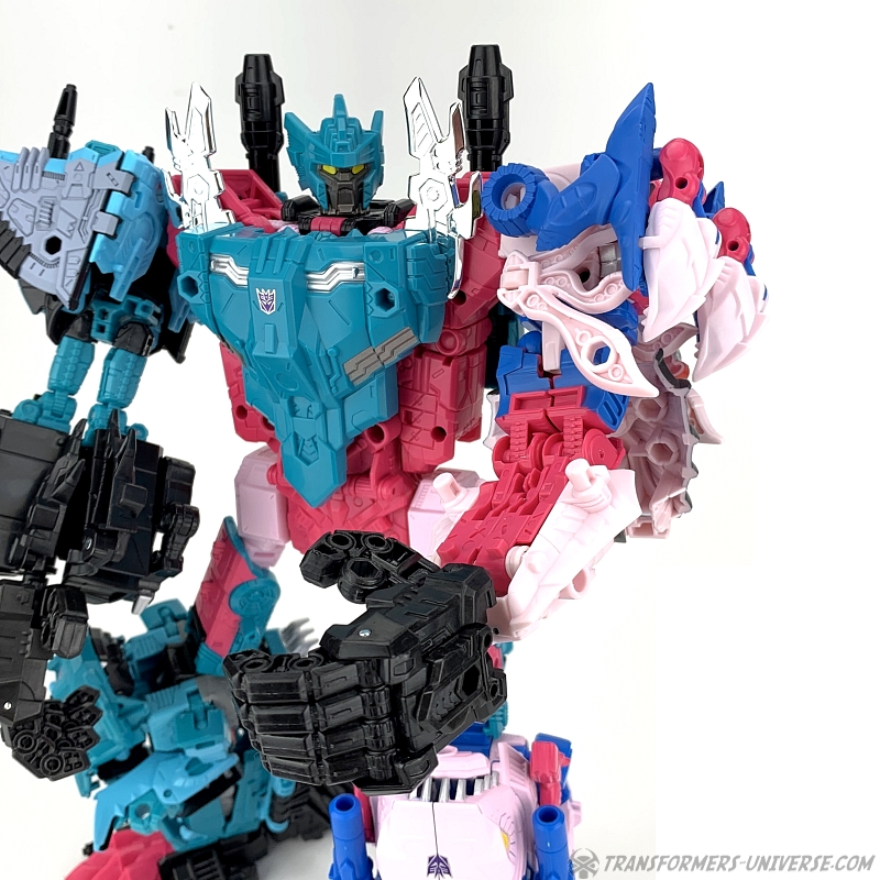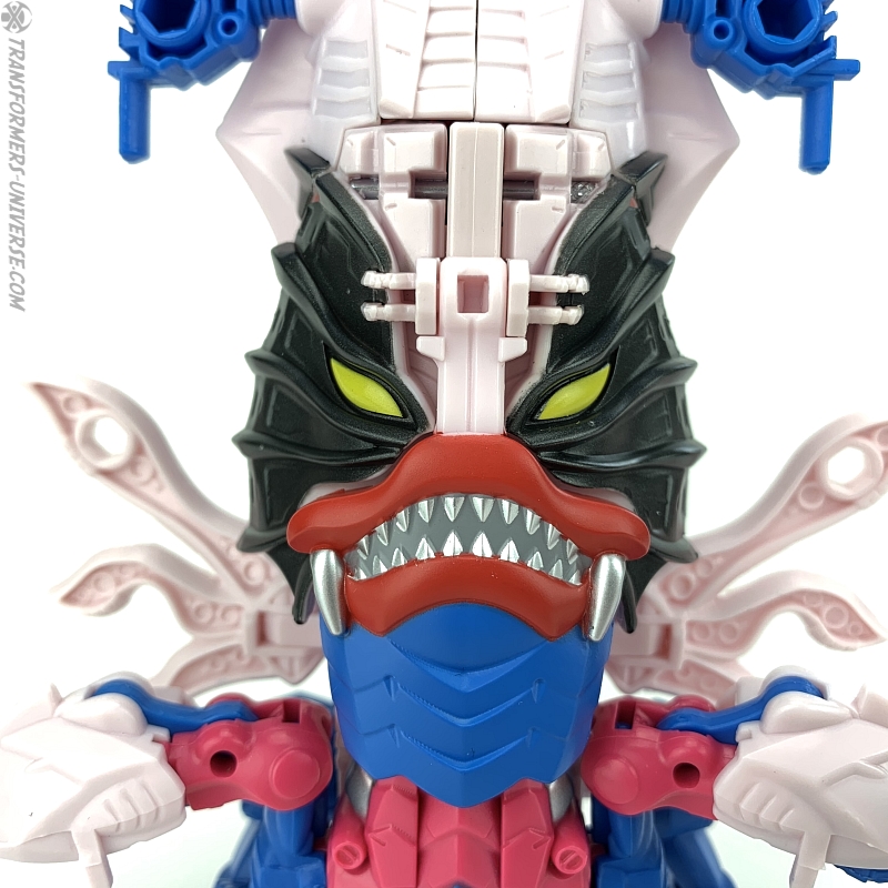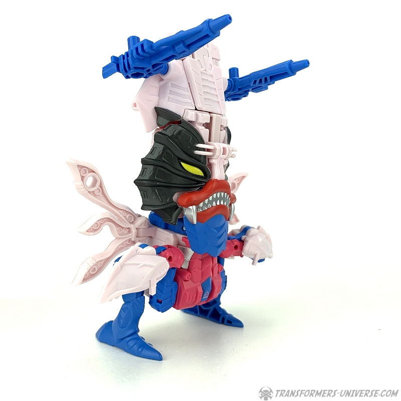 Alternate Mode: Tentakil transforms into a ten-armed robotic squid. Of those ten arms, six are basically just ornamental, two are the robot mode arms, and the final two are short stubby legs. The proportions of the beast mode are actually more or less realistic, but the face of the squid basically blows all attempts at realism to smithereens. It’s a nightmare face, its toothy grin surrounded by the lipstick of doom, and it will do irreparable damage to your soul to gaze at it for too long a time. Apart from that, you can’t really do that much with the squid. The laser guns can be mounted on the sides of its huge head, the combiner fist can go on the back, and that’s pretty much it. Do your best to forget about this mode, lest it haunts your dreams.