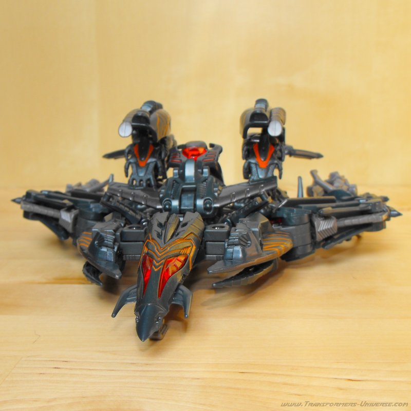 The Fallen transforms into an alien-looking space craft that bears a certain resemblance to the alternate mode of Megatron from the first movie. The transformation isn't really all that much. He unfolds a cockpit from his back, folds in his legs, and that's pretty much it. I've seen different ways for the lower legs to be arranged in this mode, either folded in or pointing outwards. Personally I like the former better, but to each his own. To its credit, this looks more like an alien space craft (and less like a folded-up robot) than the first Movie Megatron did.
