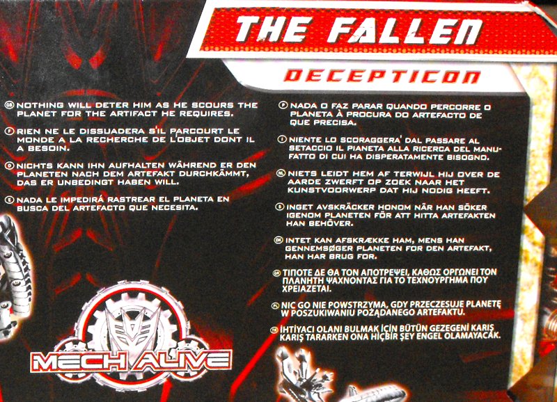 As a toy the Fallen combines a very nice robot mode with a decent, if unspectacular and somewhat unnecessary vehicle mode. It's a bit strange that he has two gimmicks (the red panels and the ability to transform) he didn't have in the movie, while missing the one thing (the spear) that he did have there, but whatever. The Fallen is a nice toy. Far from the best of the ROTF line-up, but far from the worst, either. A good, solid robot and pretty much a must-have anyway, seeing as he's the main bad guy.