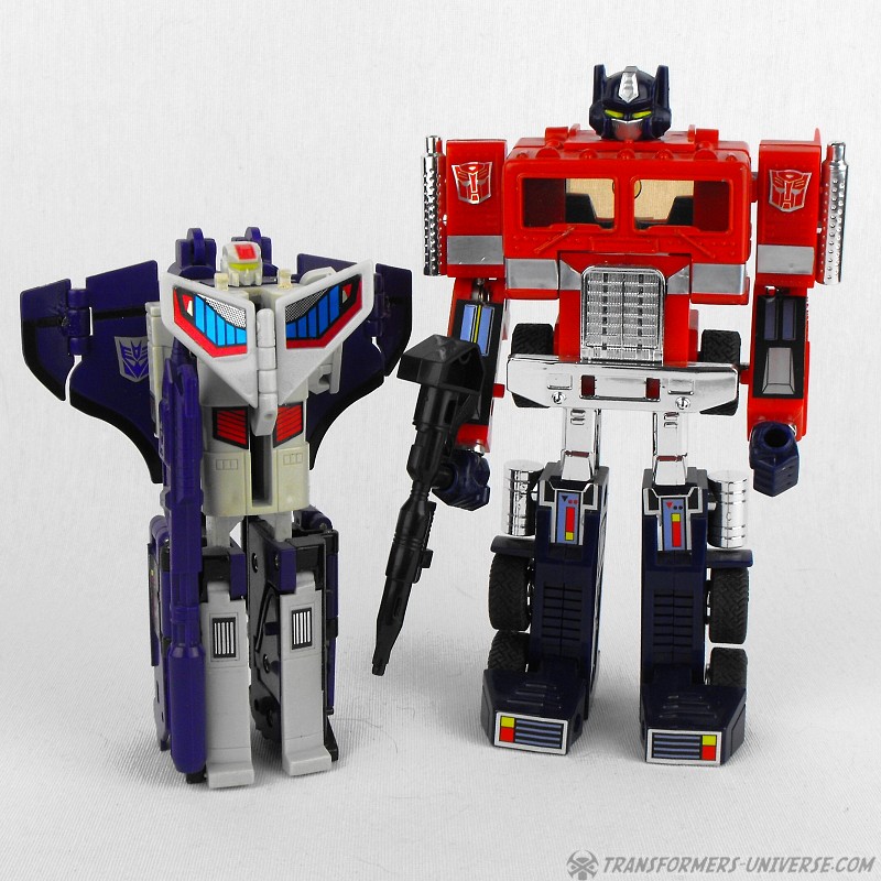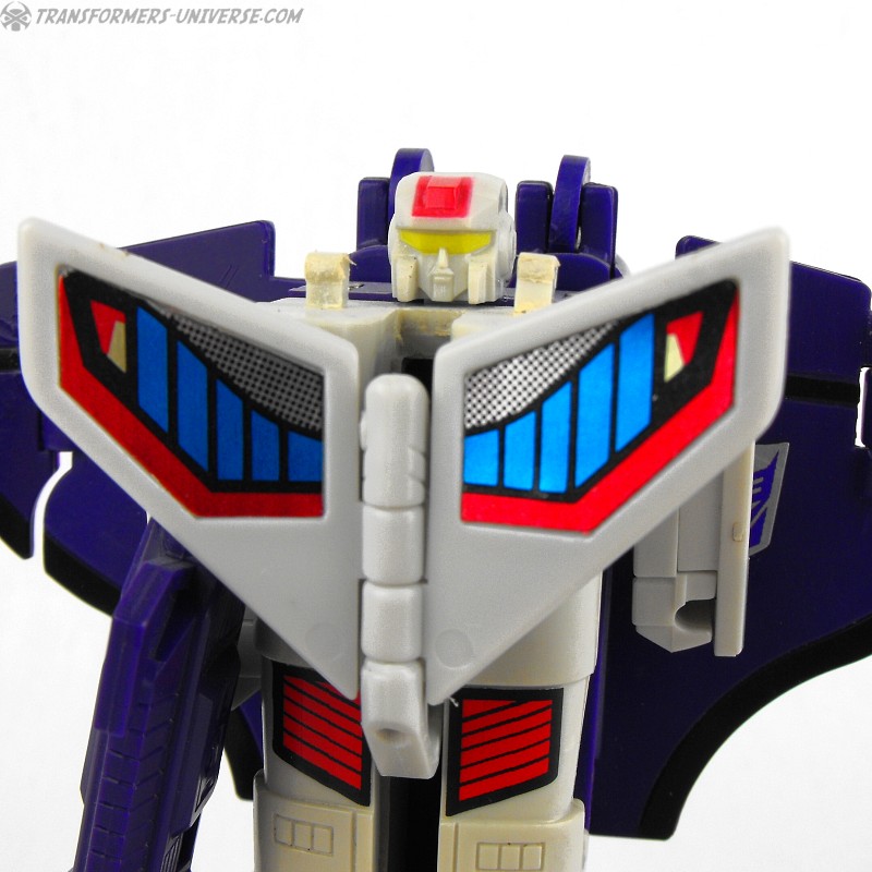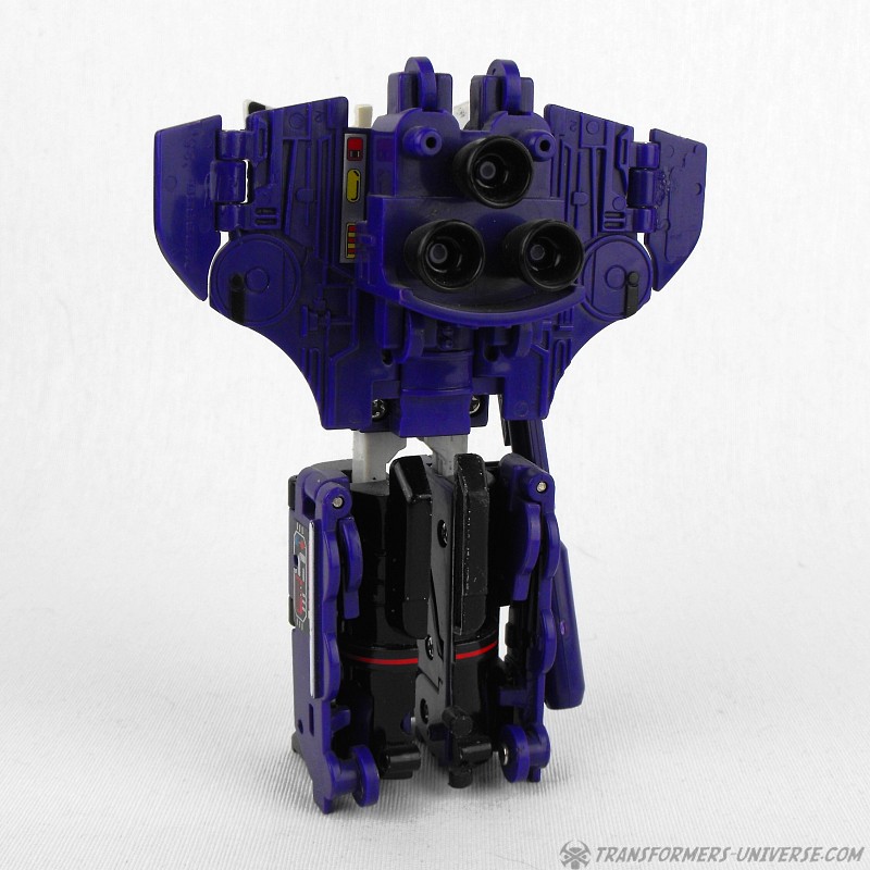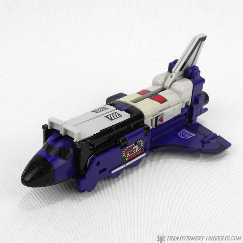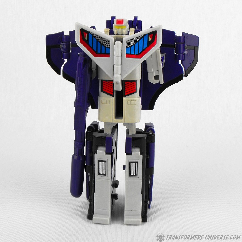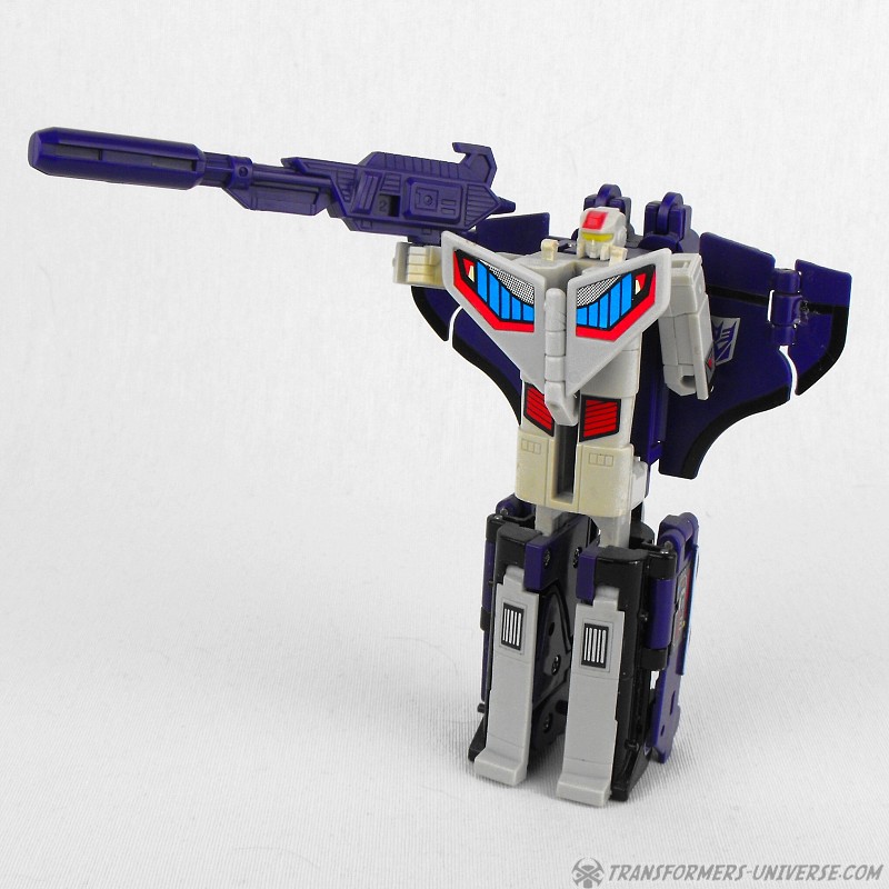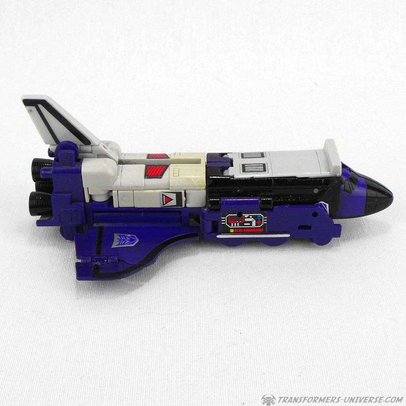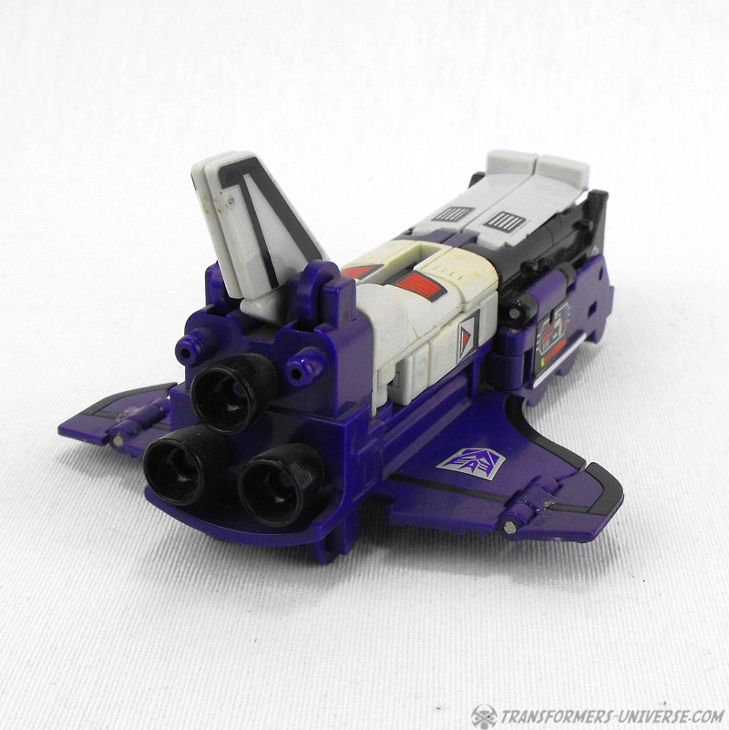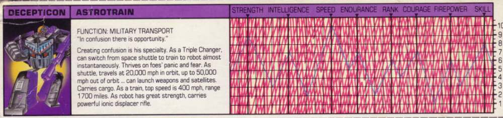Creating confusion is his specialty. As a Triple Changer, can switch from space shuttle to train to robot mode almost instantaneously. Thrives on foes' panic and fear. As shuttle, travels at 20,000 mph in orbit, up to 50,000 mph out of orbit. Can launch weapons and satellites. Carries cargo. As a train, top speed is 400 mph, range 1700 miles. As robot has great strength, carries powerful ionic displacer rifle.