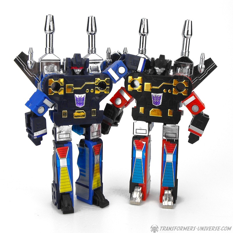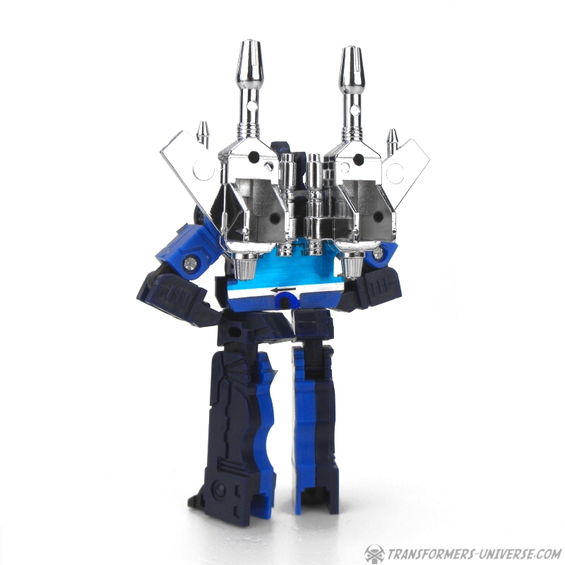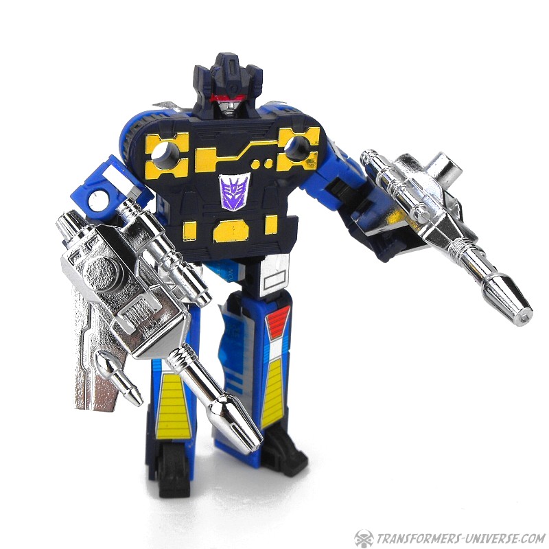 Robot Mode: Frenzy is a small robot with lots of blue (not red, see below!) in him and looks like what he is: A small, mean little punk. Sadly he's missing the pile drivers he (or rather his red sibling Rumble) used so often in the G1 cartoon, but even without them he is a surprisingly posable and well-sculpted little guy for all that he turns into a simple cassette. Frenzy carries two weapons on his back that double as handguns. A very good robot mode.