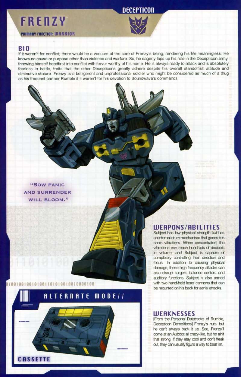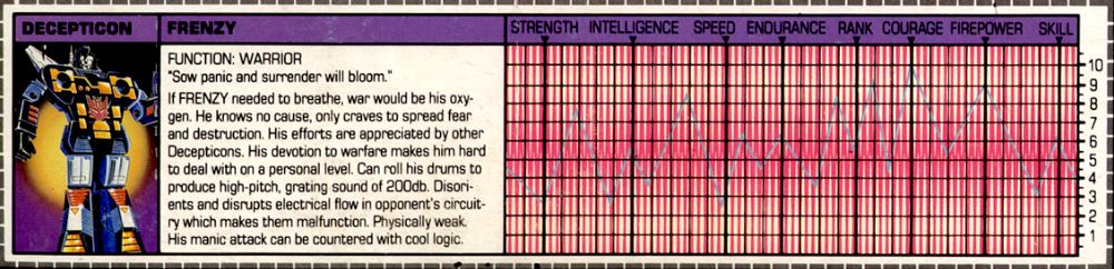 If Frenzy needed to breathe, war would be his oxygen. He knows no cause, only craves to spread fear and destruction. His efforts are appreciated by other Decepticons. His devotion to warfare makes him hard to deal with on a personal level. Can roll his drums to produce high-pitch, grating sounds of 200 db. Disorients and disrupts electrical flow in opponent's circuitry, which makes them malfunction. Physically weak. His manic attacks can be countered with cool logic.