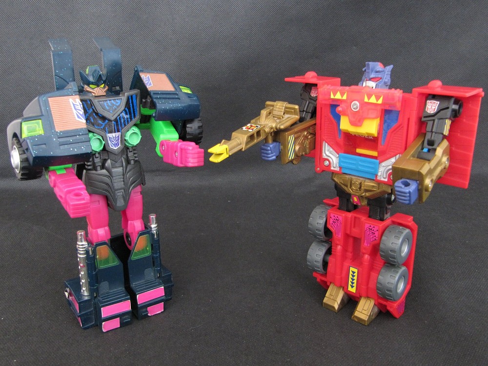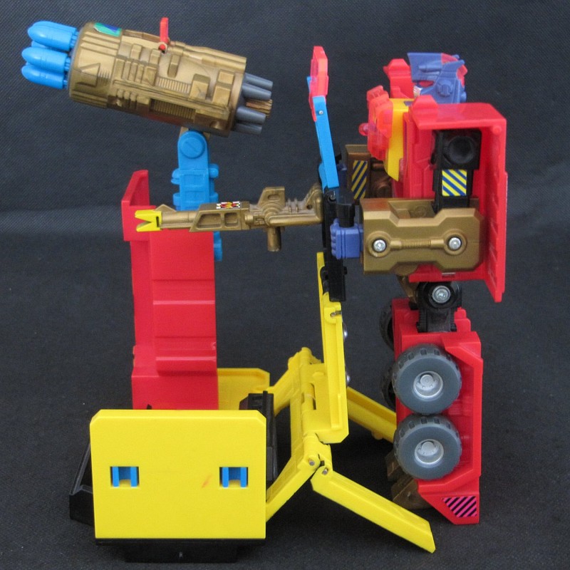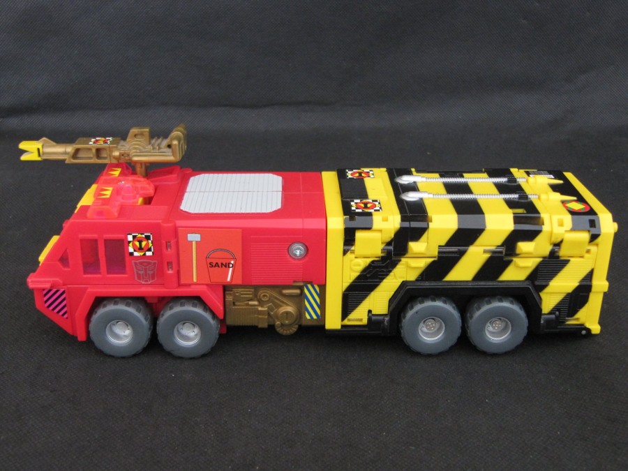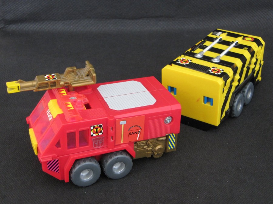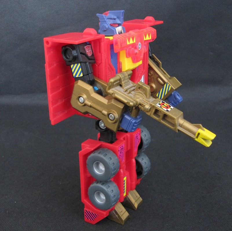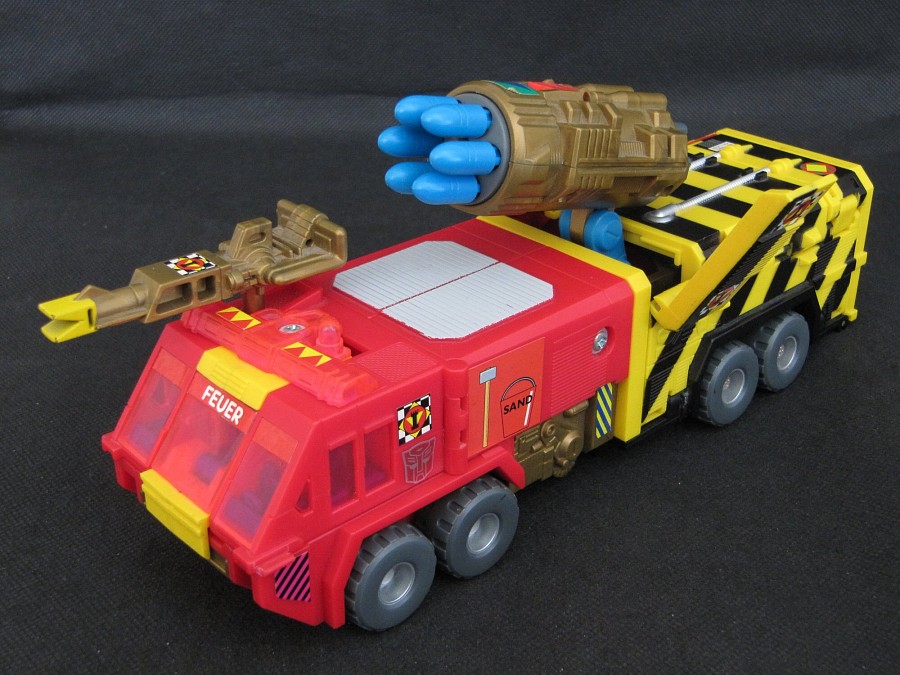 Remarks: Pyro, also released under the name Spark, was one of the final figures released in the "European G1" line, sometimes also called G1.5, meaning figures released exclusively in Europe between 1991 and 1993. As the transition to G2 had already begun, Pyro already wears a G2-style Autobot symbol, but there is no "Generation 2" lettering on his package. The figure is notorious for its Gold Plastic Syndrome (GPS), as numerous parts are made entirely from gold plastic and prone to breaking.