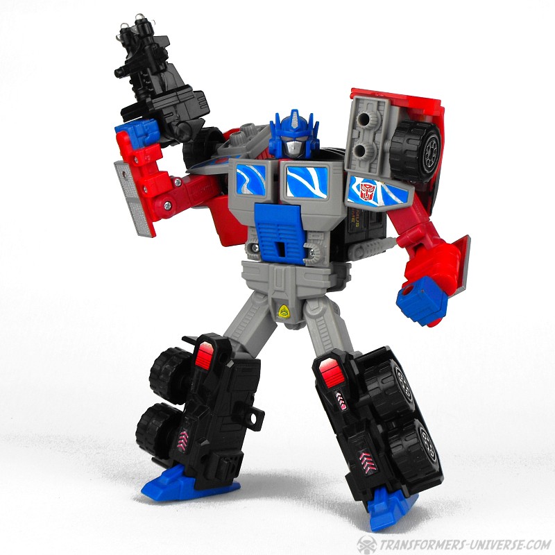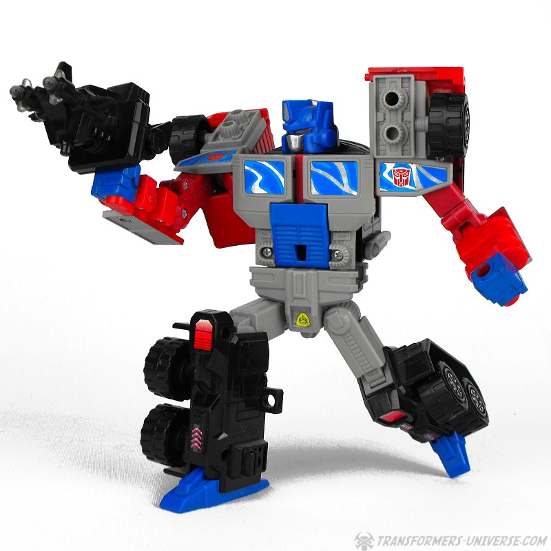 Showdown with Megatron in sector 17 of the Mirtonian constellation left Optimus severely damaged. Entire structural integrity and logistical circuitry processors were programmed into a sleeker, stronger, combat-ready configuration! Now this ultimate super hero has an arsenal of weaponry ready to repel an attack and immobilize Megatron once and for all! With Optimus' giant, laser-targeting rocket launcher, ripple-fire missile blaster and armor-piercing discs, Megatron had better think twice before firing the next shot...or it could prove to be his last!