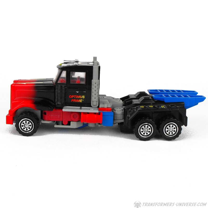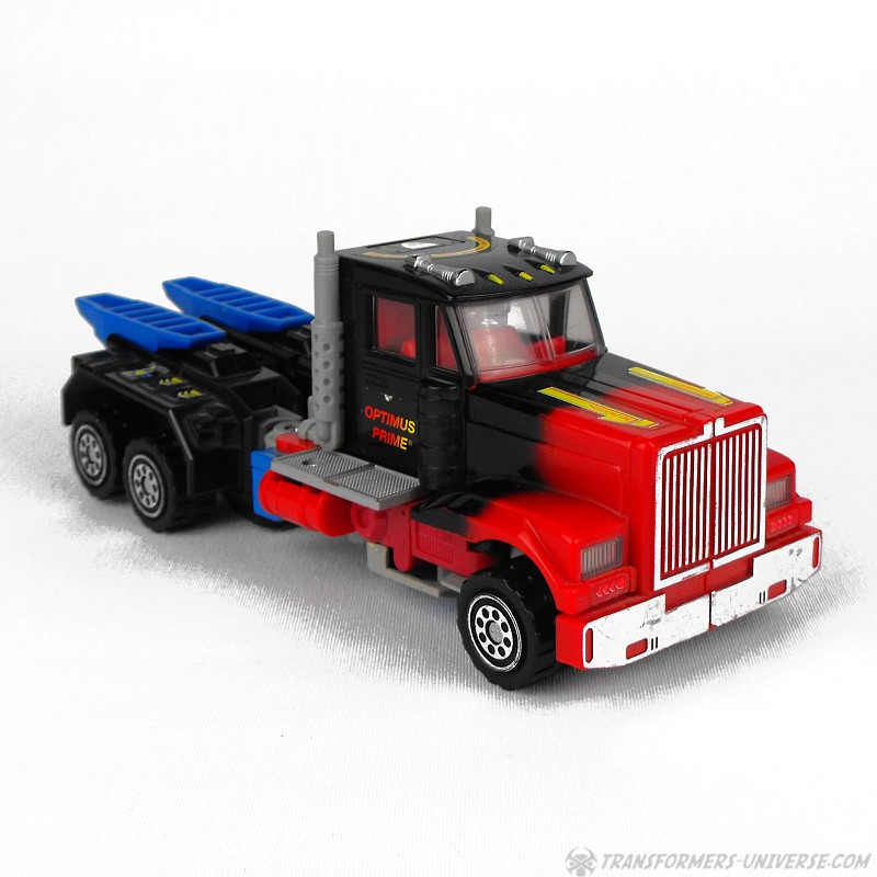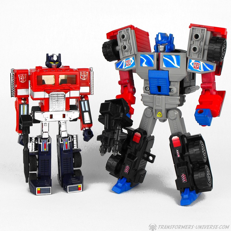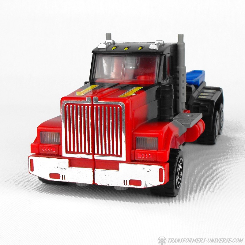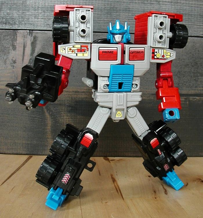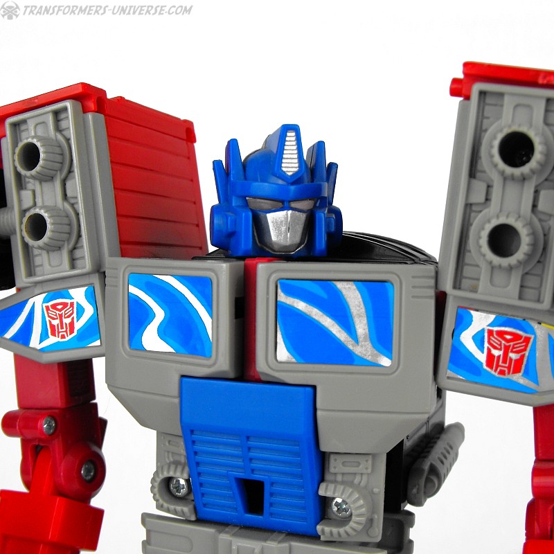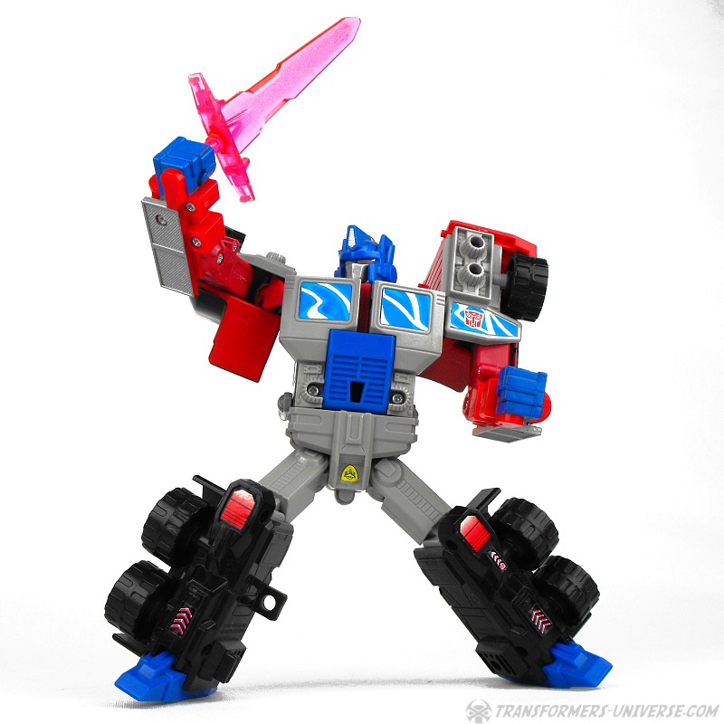 Robot Mode: One of the best robot modes from the entire G2 line and you'd be hard-pressed to find one better in G1, either. Optimus is looking extremely cool with his large shoulder-mounted rocket-launchers and thanks to great posability he can strut his stuff in all sorts of cool poses. Also the first Optimus to carry a sword, Laser Prime is top-notch in robot mode. There is also an electronic gimmick that can make the muzzles of his gun glow red by pressing a button on his back. The only minor flaw of this robot is the fact that the driver cabine from his truck mode hanging on his back makes him a bit prone to toppling over backwards, but given his posability that is one easily corrected flaw. Straight A here.