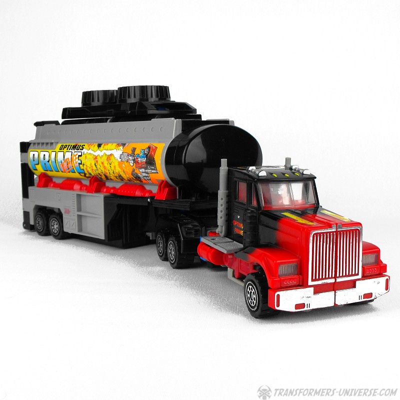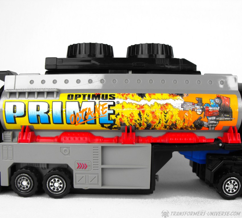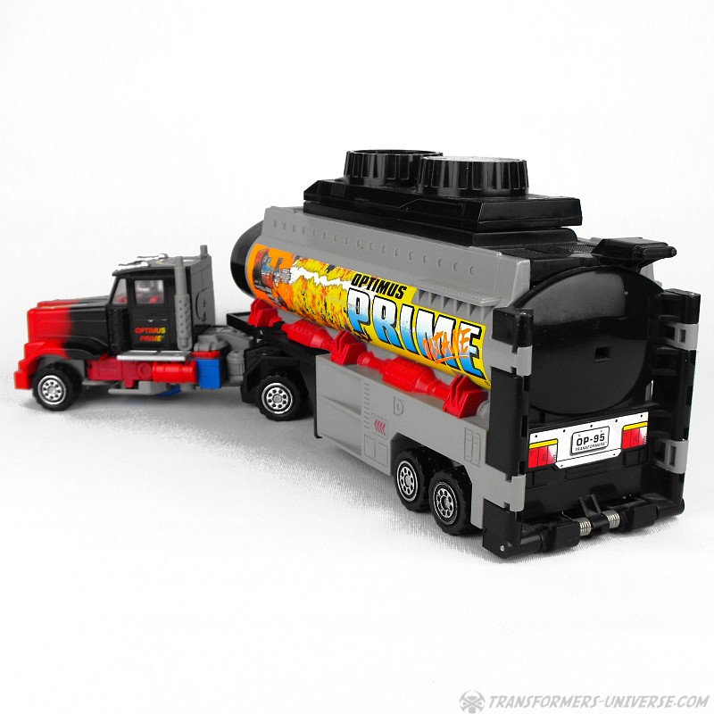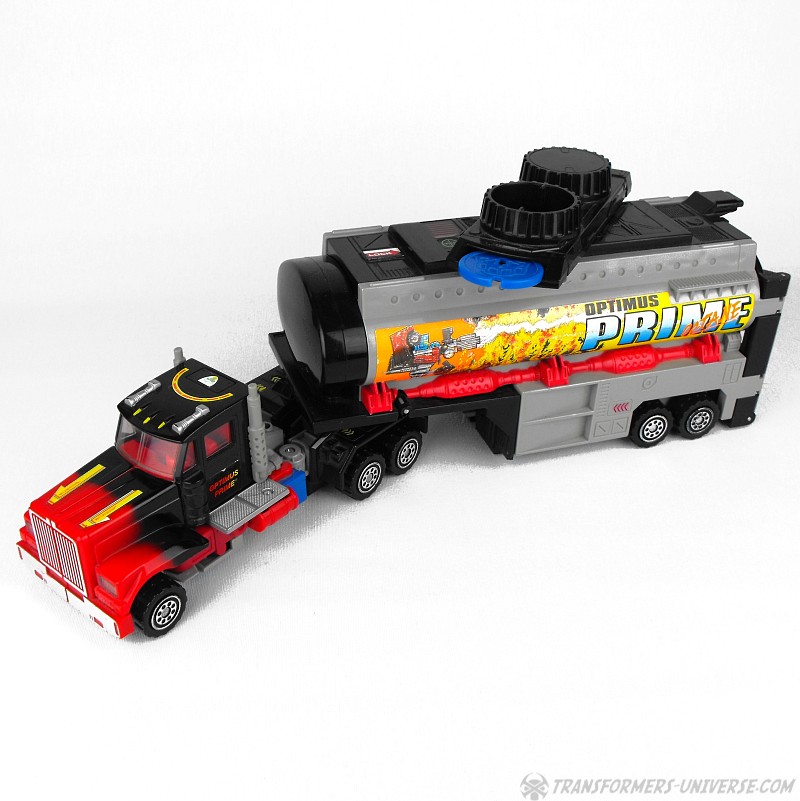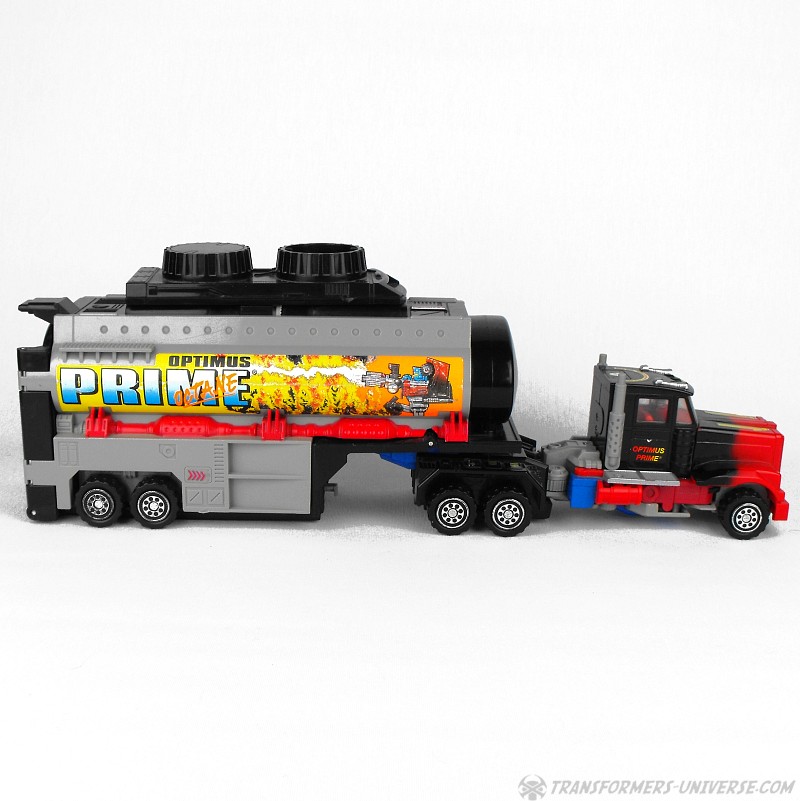 Vehicle Mode: Optimus transforms into a tanker truck. What is remarkable is that the primary colour of the truck is black instead of red. Oh, there is a lot of red left, but he does have a pretty dark look for a heroic character. The truck can utilize the same electronic gimmick that makes the robot mode gun glow to light up his headlights. Overall a very good truck mode. Only the stickers on the side are a bit much.