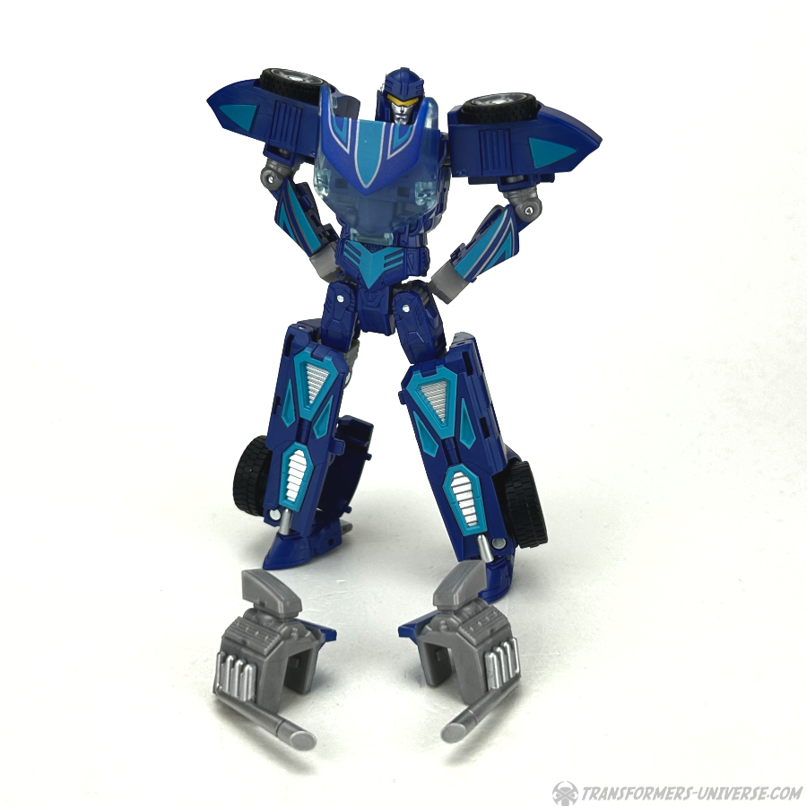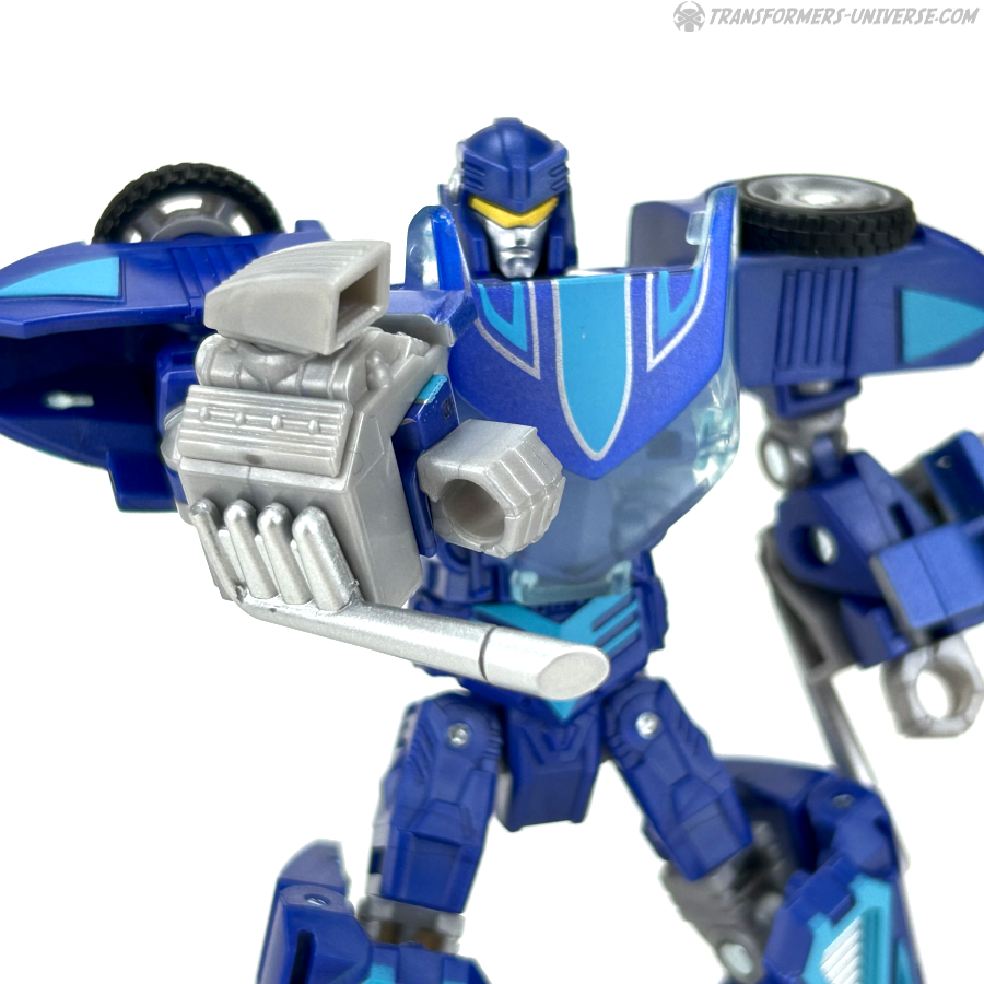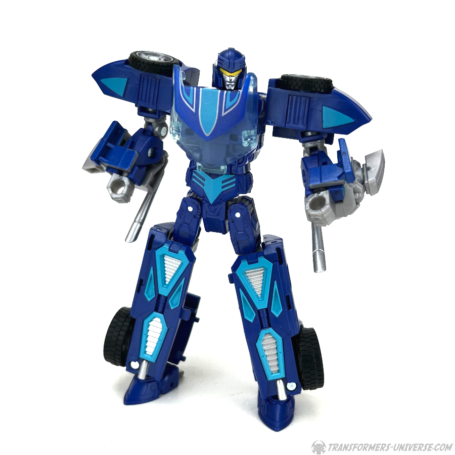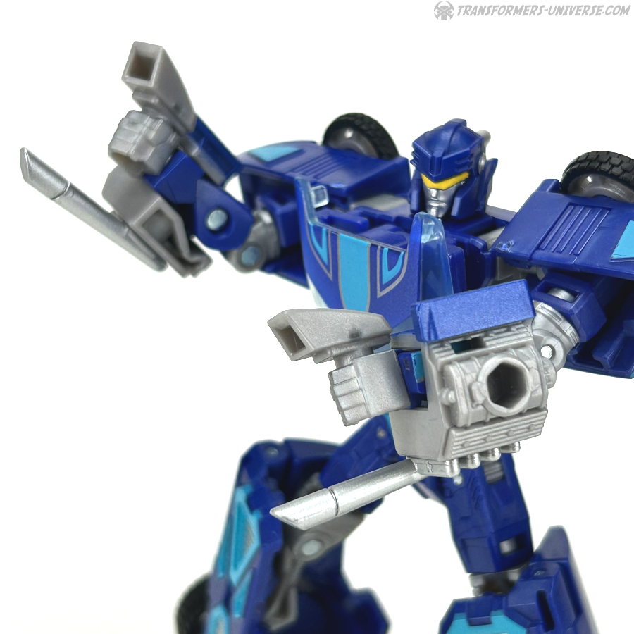 Robot Mode: Twin Mill is a Deluxe-sized robot decked out in blue that clearly transforms into a car. You got the wheels on the shoulders and the legs to prove it, not to mention the engines with the exhaust pipes on the forearms. The latter gives him some minor G2 vibes, but overall he is just a good-looking car robot. He bears some resemblance to bots like RID Sideburn or Turbomaster Boss, but overall he is pretty much his own guy.