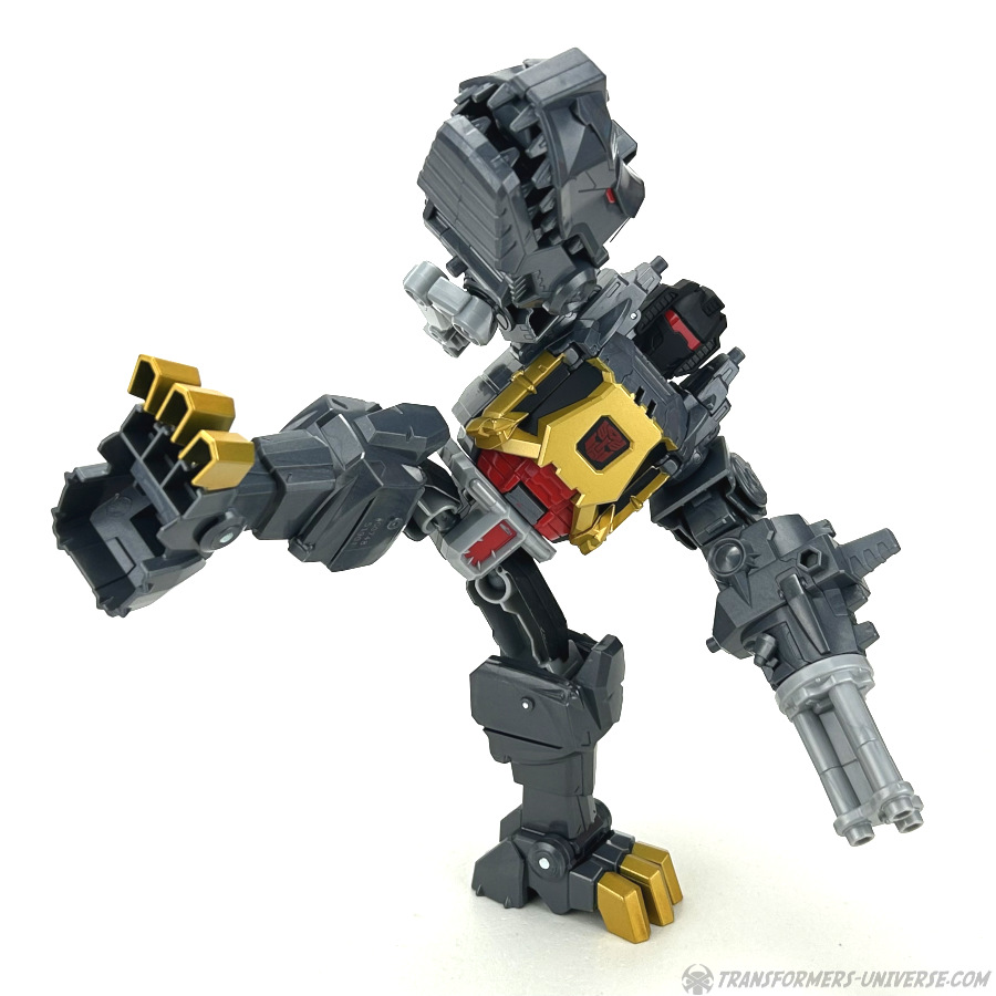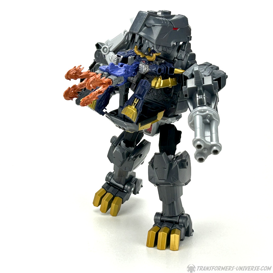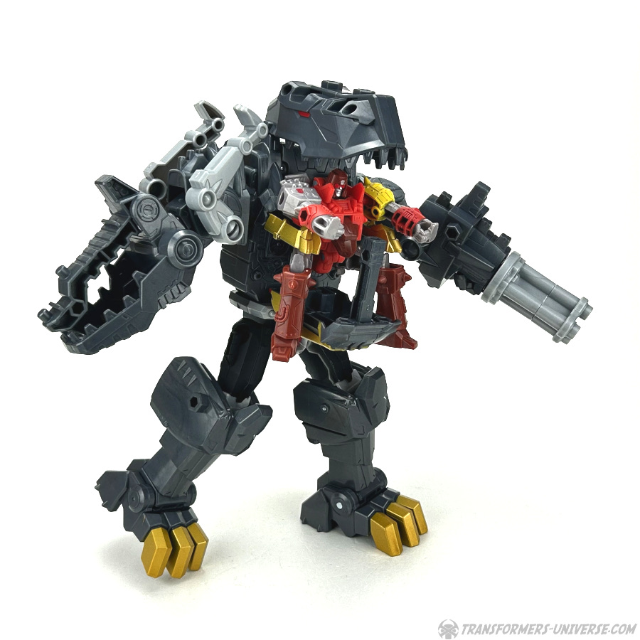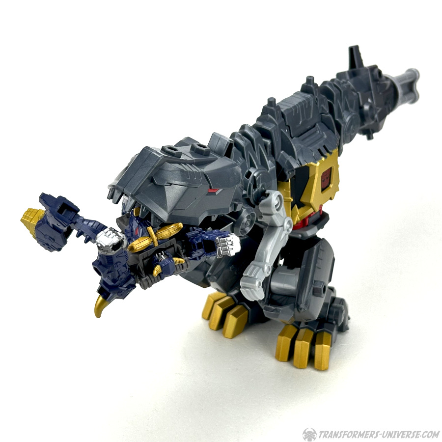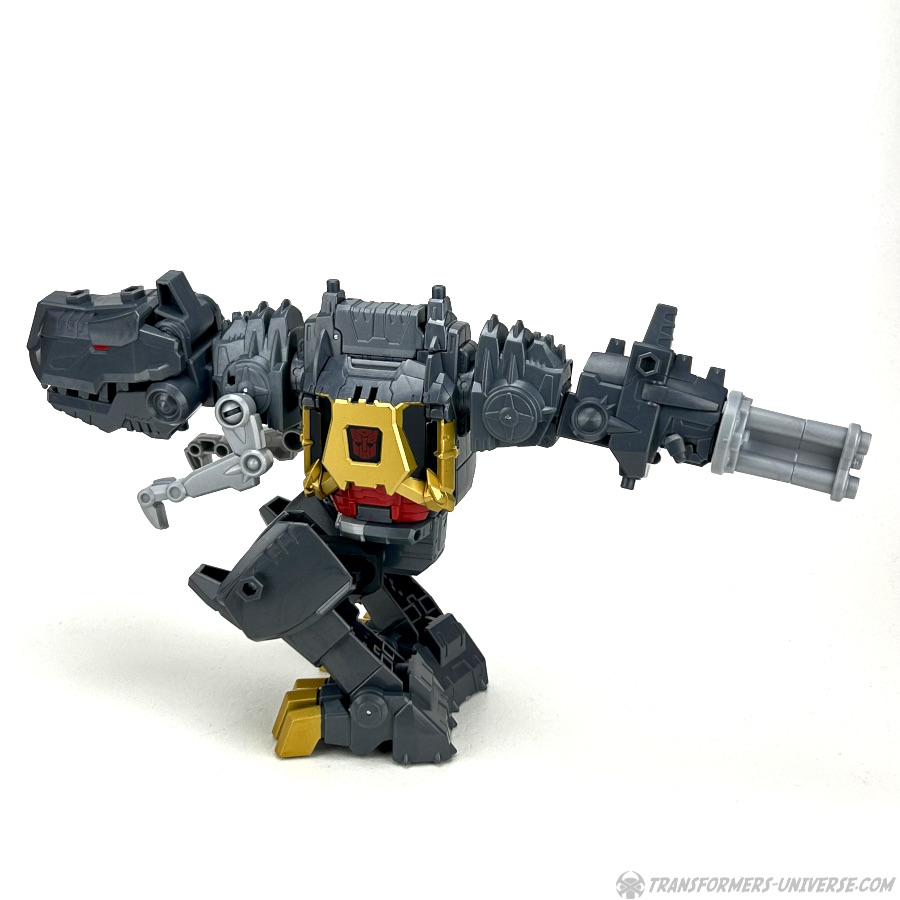 Look-wise he is clearly Grimlock, but with some unusual design elements. Chief among them the big T-Rex head he has for a right hand. That’s usually more Beast Wars Megatron’s thing, but it looks pretty good here, too. The other arm ends in a big tri-barreled cannon, which can be made to spin by pushing in the lever on the side. Nice, I was just lamenting the lack of such action gimmicks in recent figures. We need more spinning cannons and flip-out guns, just saying. There is a sculpted fist behind the cannon (which can be taken off), so technically Grimlock does have an actual hand, though it’s hard to see.